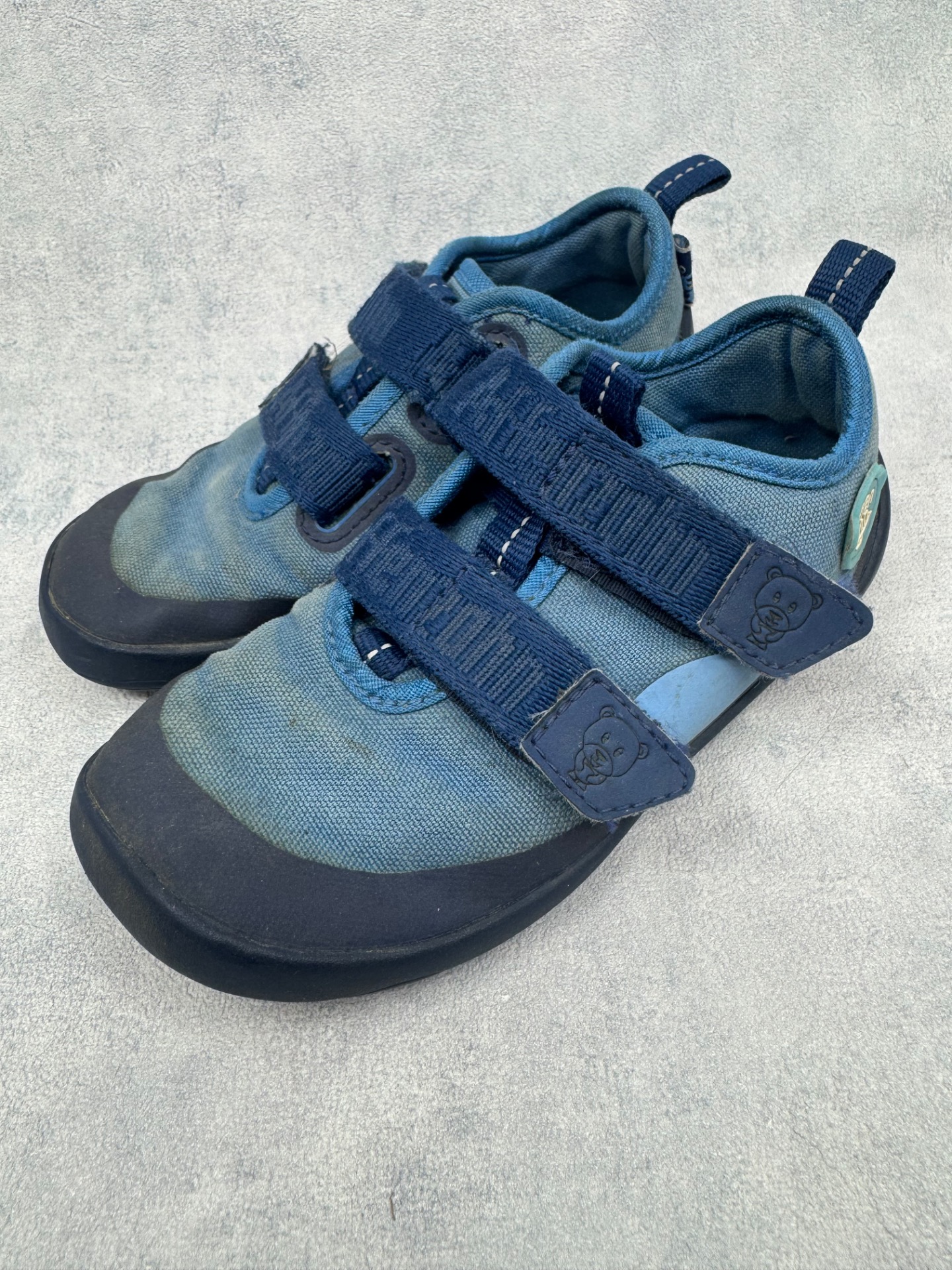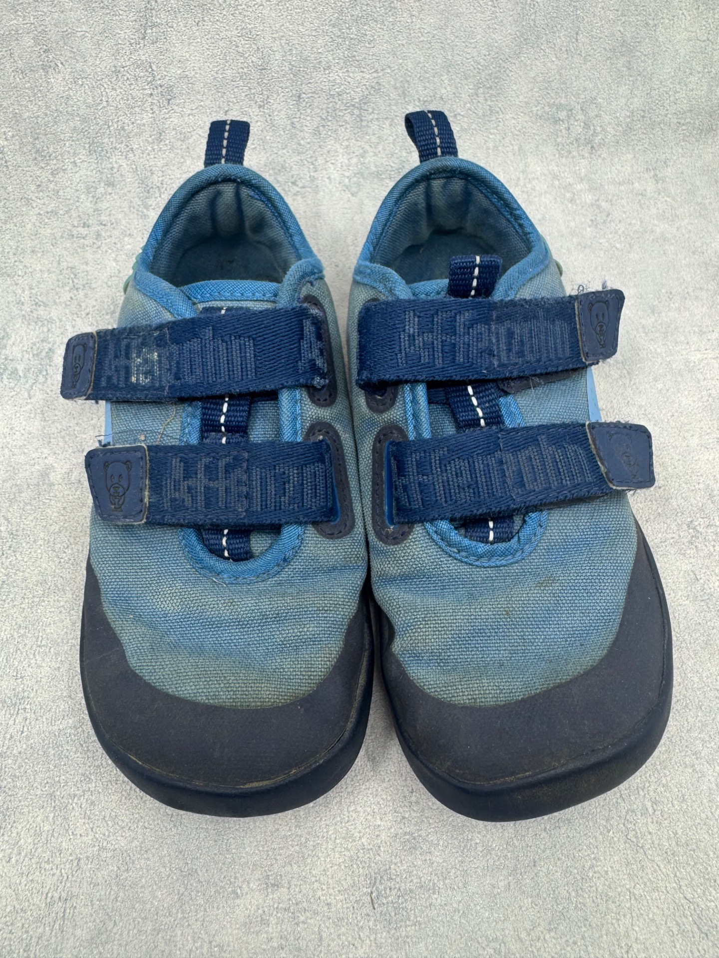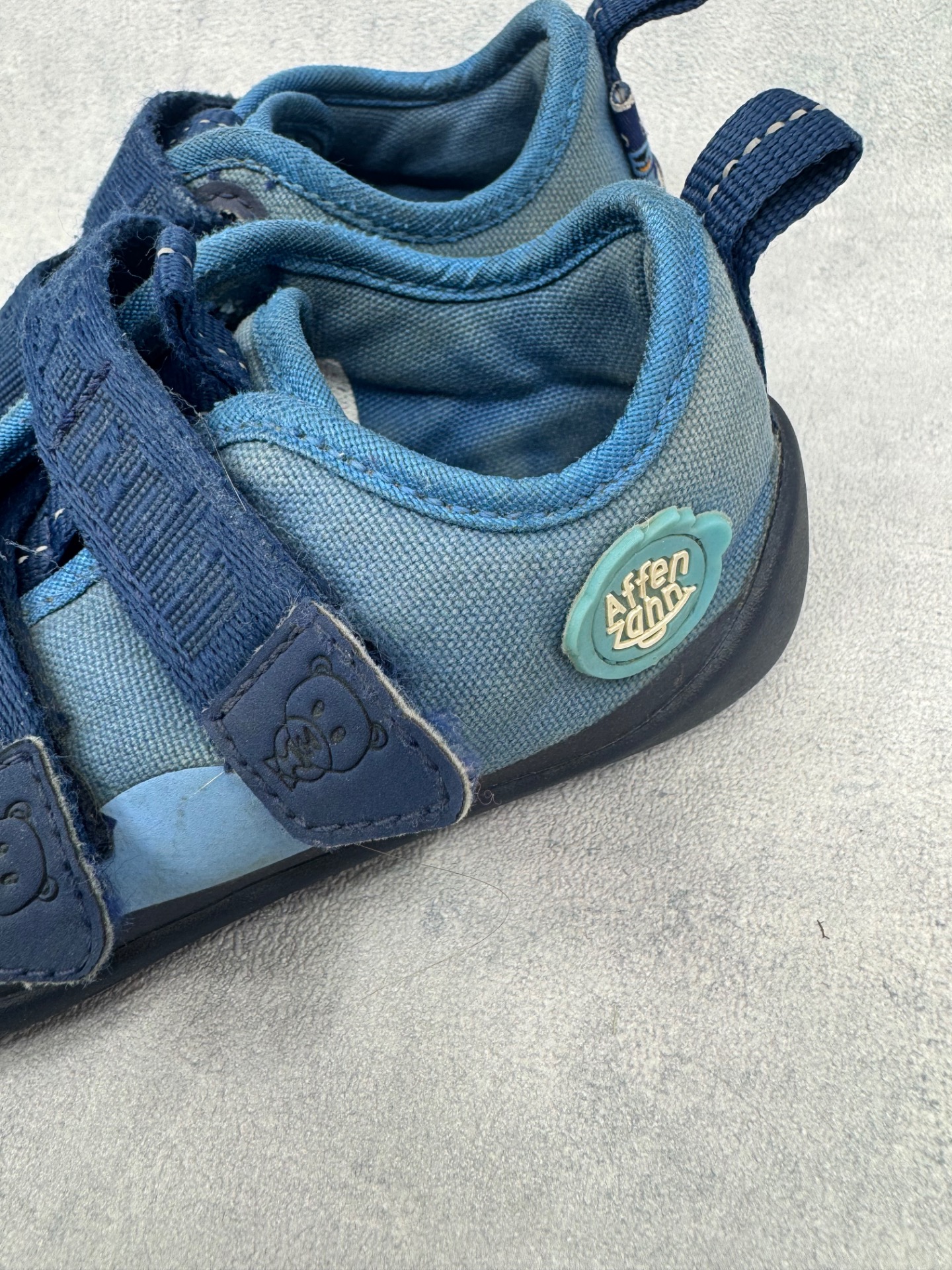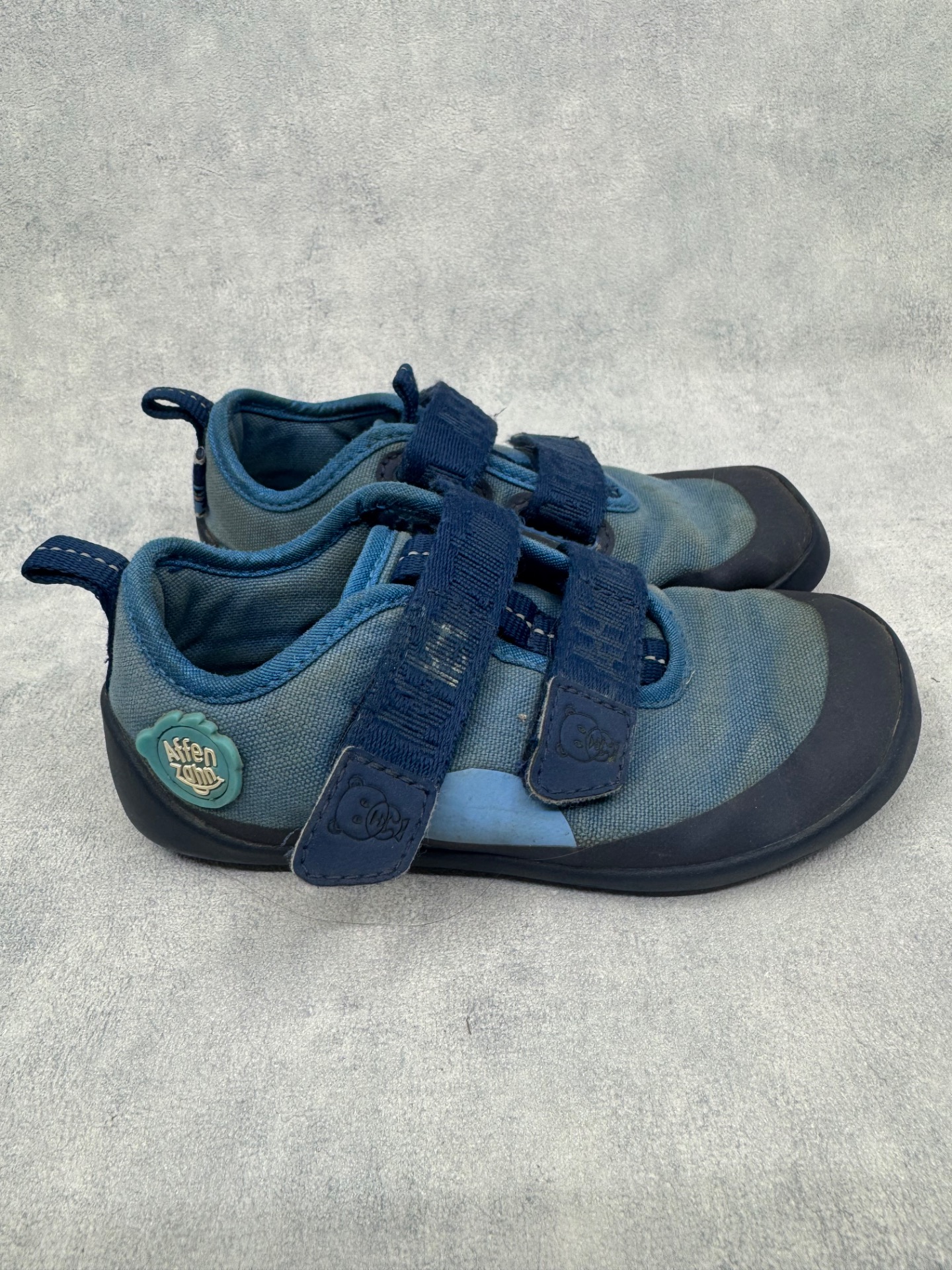 Hyväkuntoiset Affenzahnin paljasjalkakengät. Reilusti likaa/tummentumaa pinnalla. Yleisilmeeltään kengät ovat siistit. Tarrat pitää erinomaisesti. Joustava pohja.