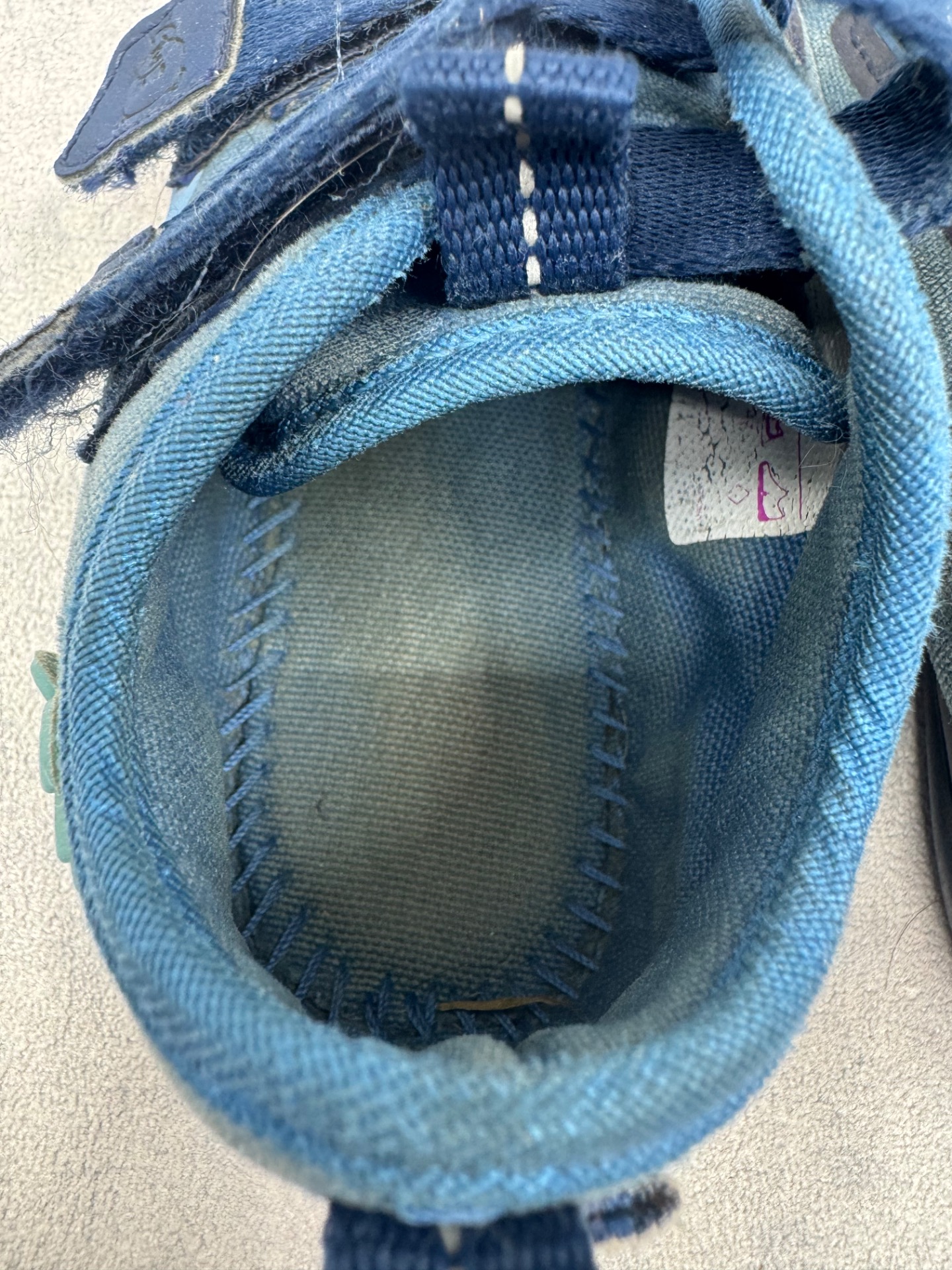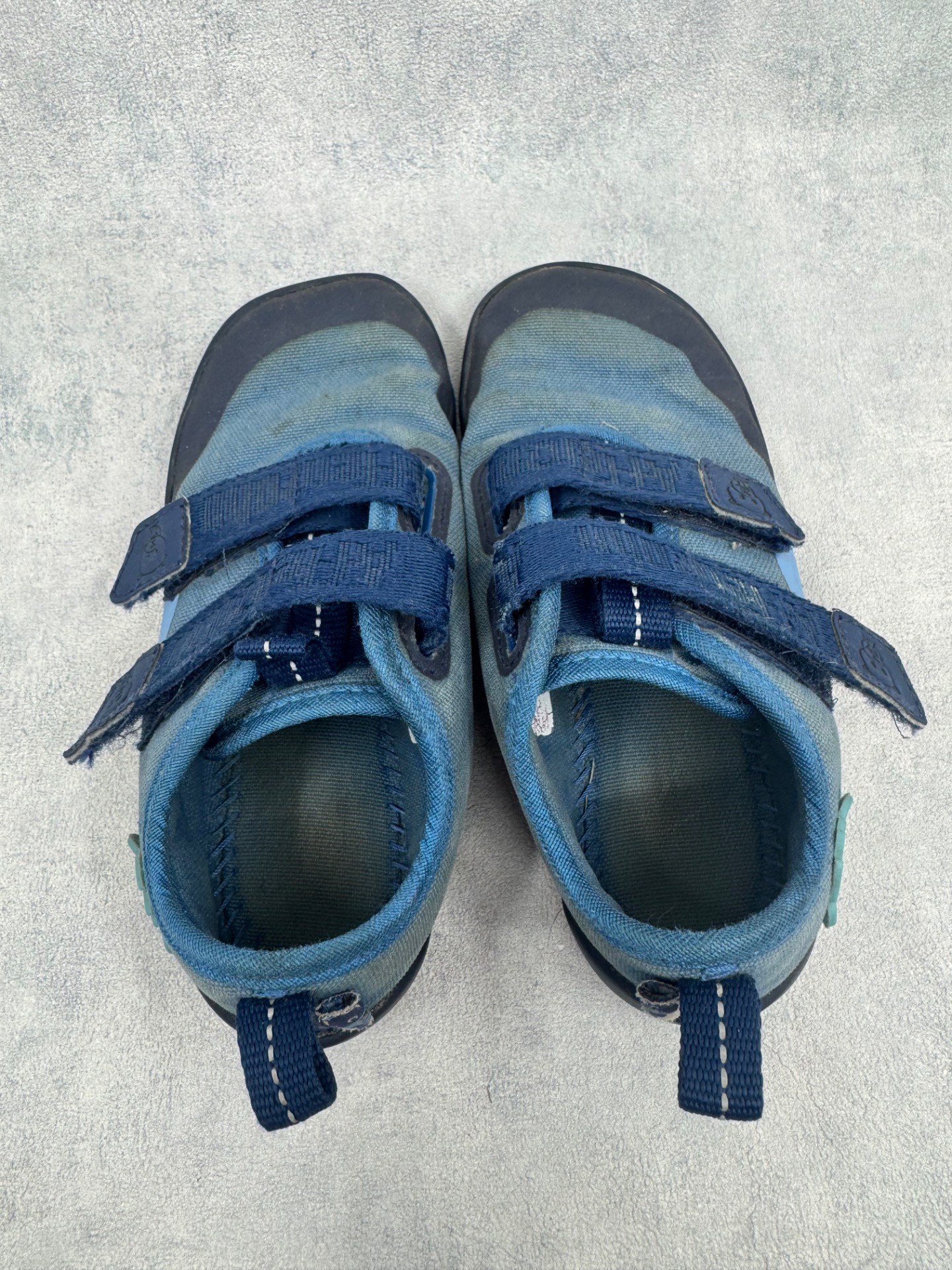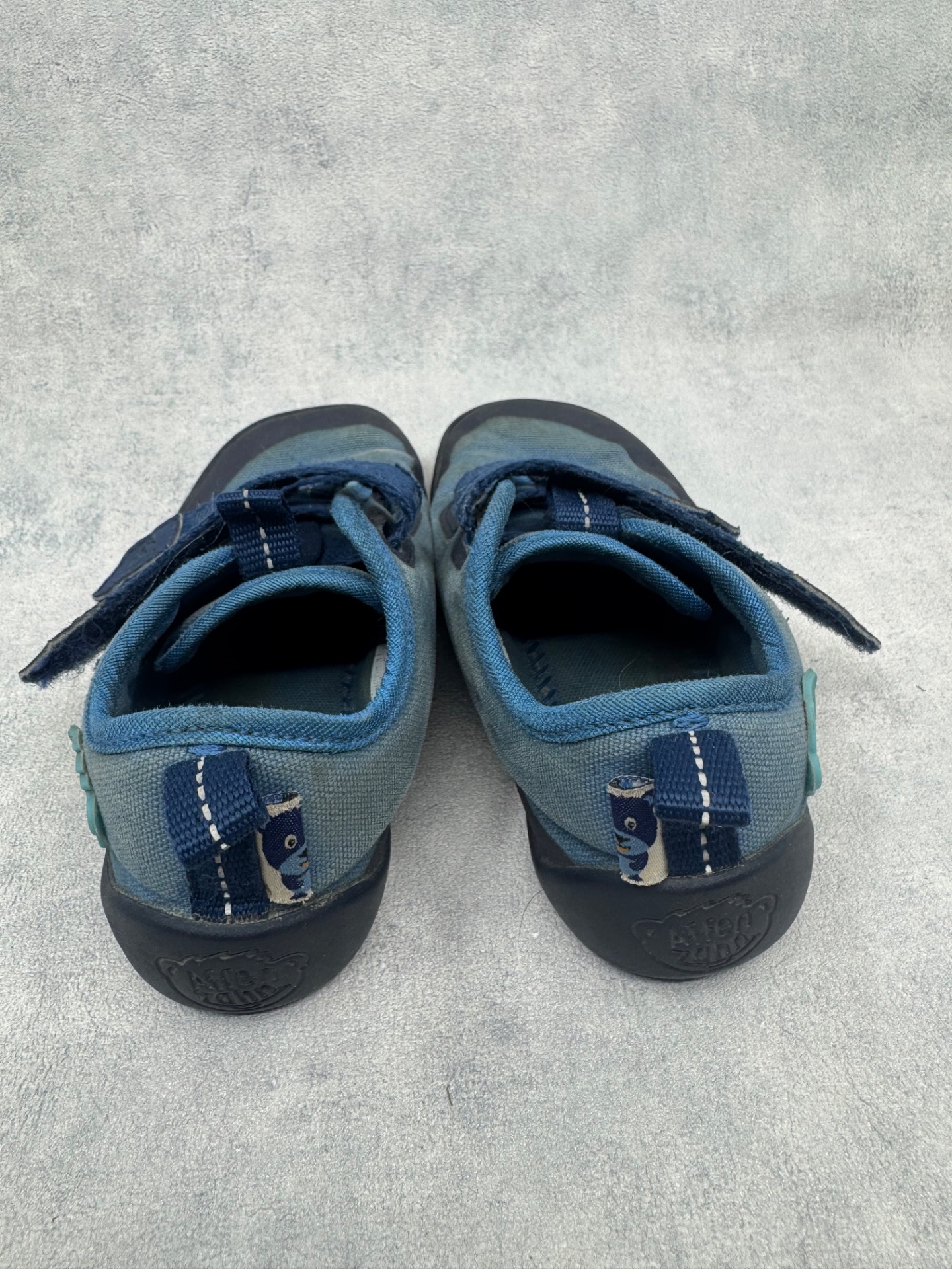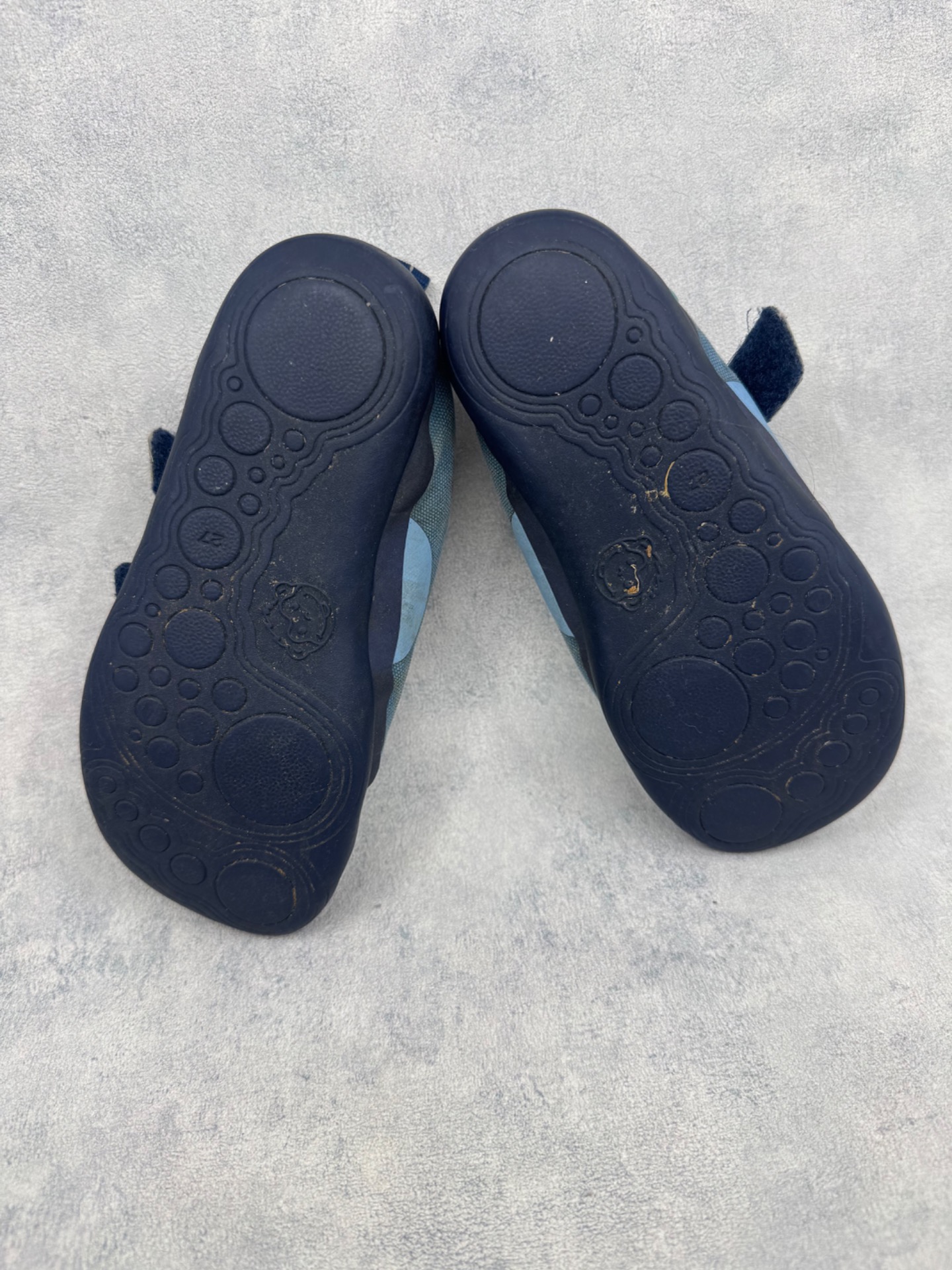 Hyväkuntoiset Affenzahnin paljasjalkakengät. Reilusti likaa/tummentumaa pinnalla. Yleisilmeeltään kengät ovat siistit. Tarrat pitää erinomaisesti. Joustava pohja.