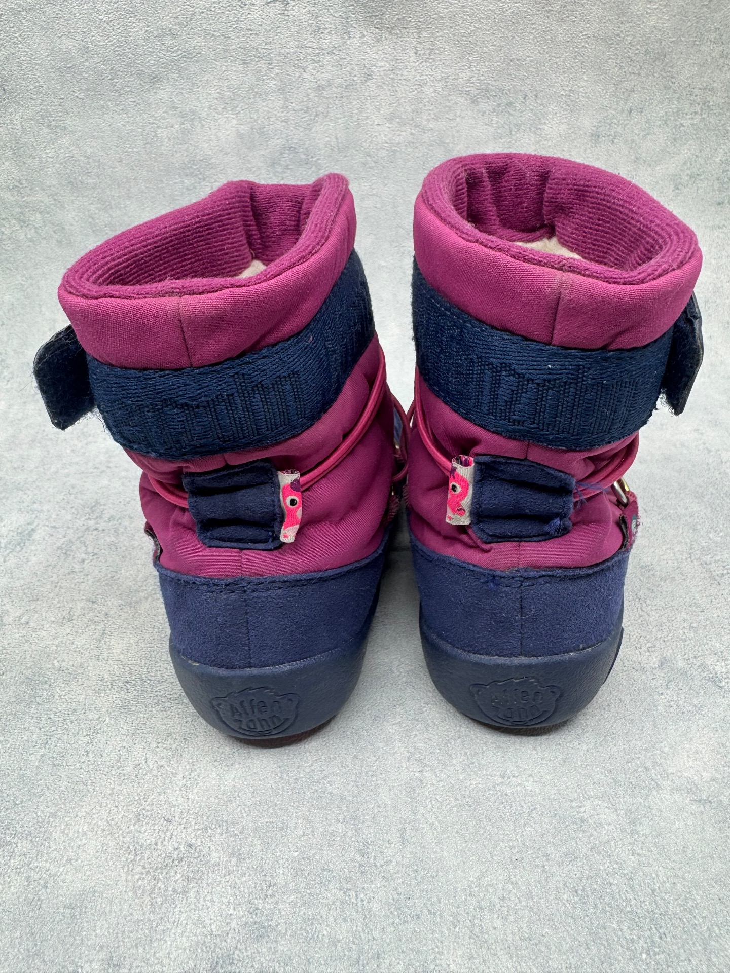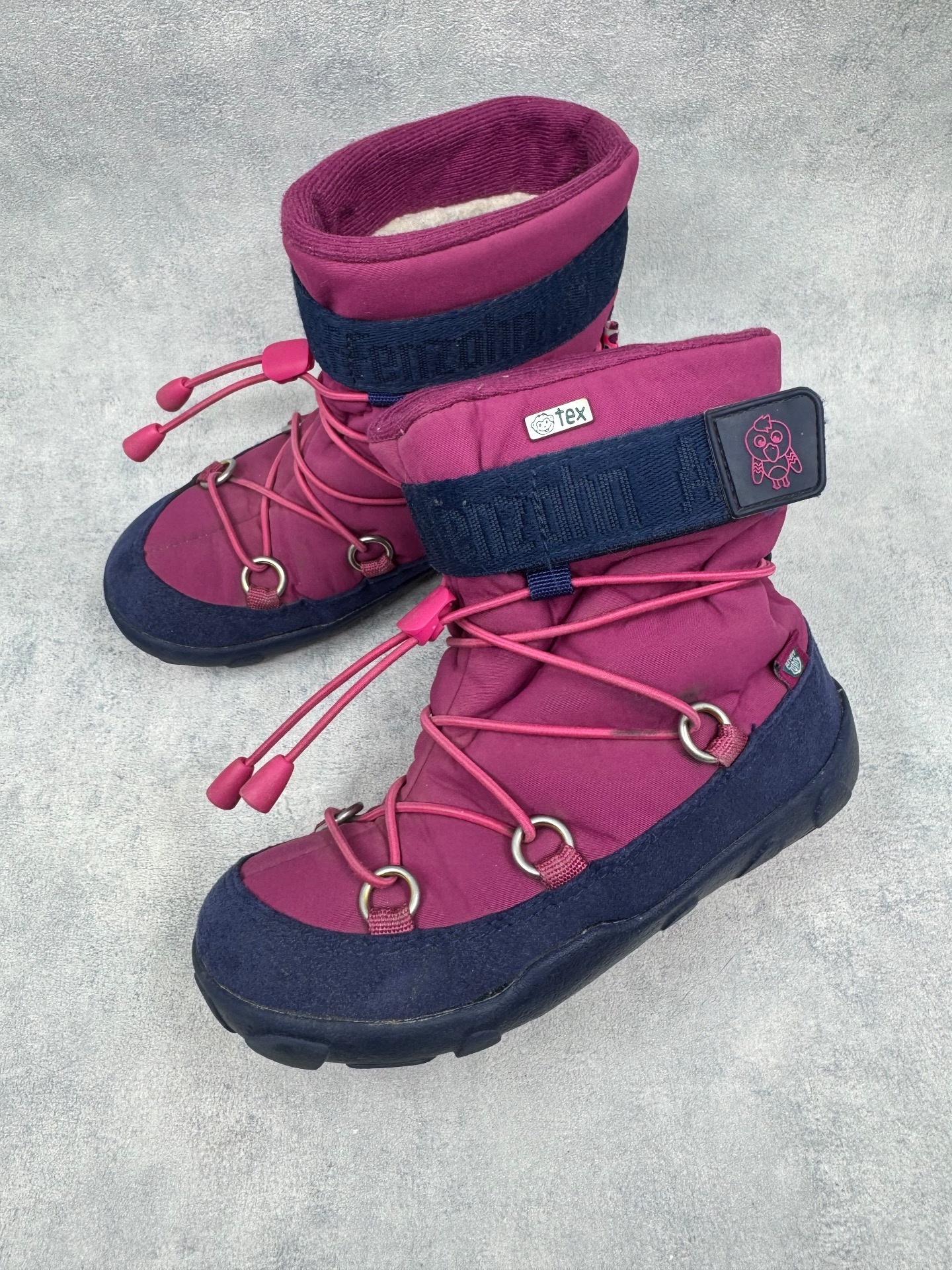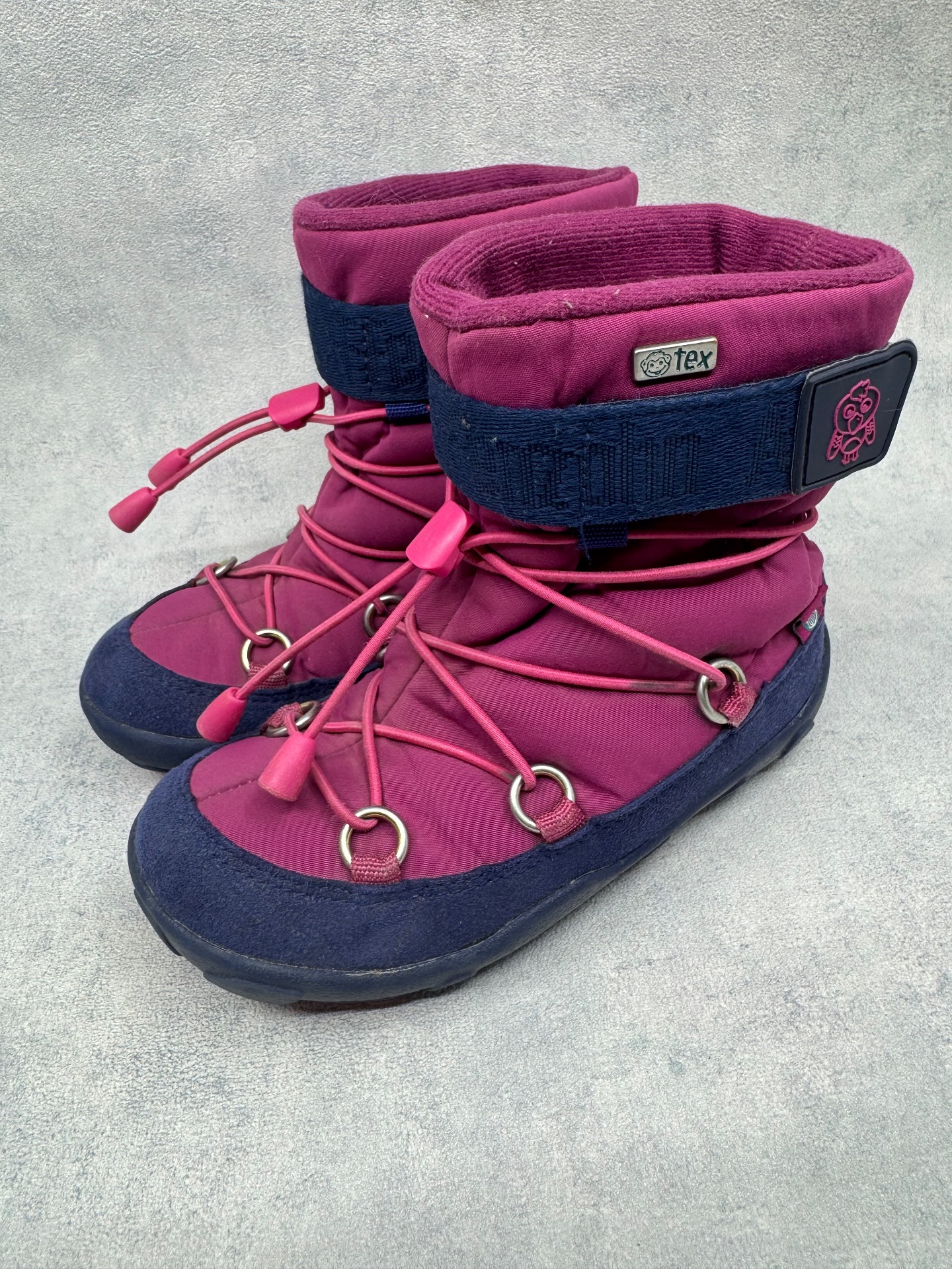 Erittäin hyväkuntoiset Affenzahnin paljasjalkakengät. Sisällä lämmin vuori, hyvässä kunnossa. Aavistus tummentumia pinnassa, yleisilmeeltään erittäin siistit kengät. Tarrat pitää erinomaisesti ja kengät on testattu juoksevan veden alla vedenpitäviksi, pinta on. vettähylkivä. Joustava pohja.