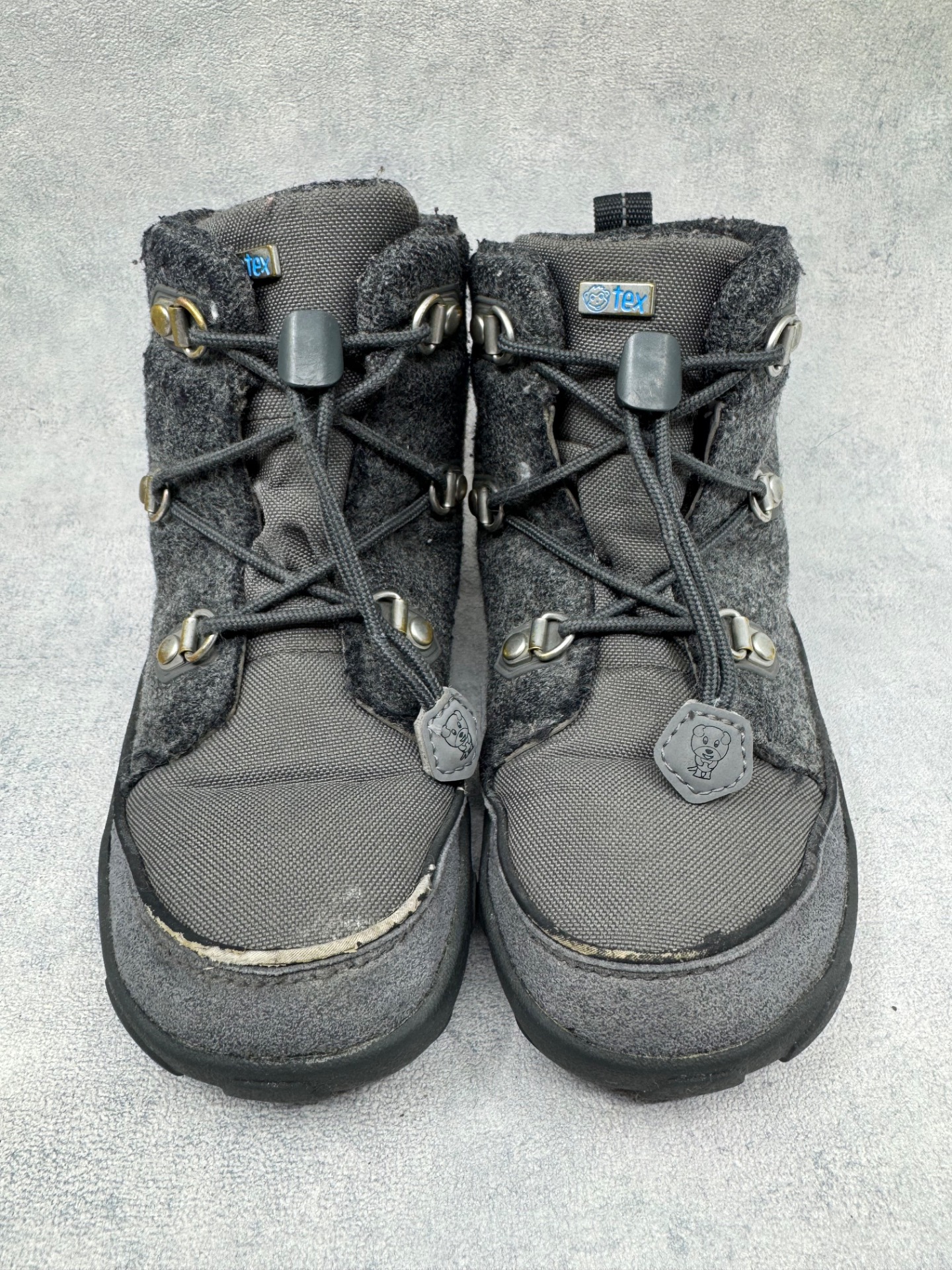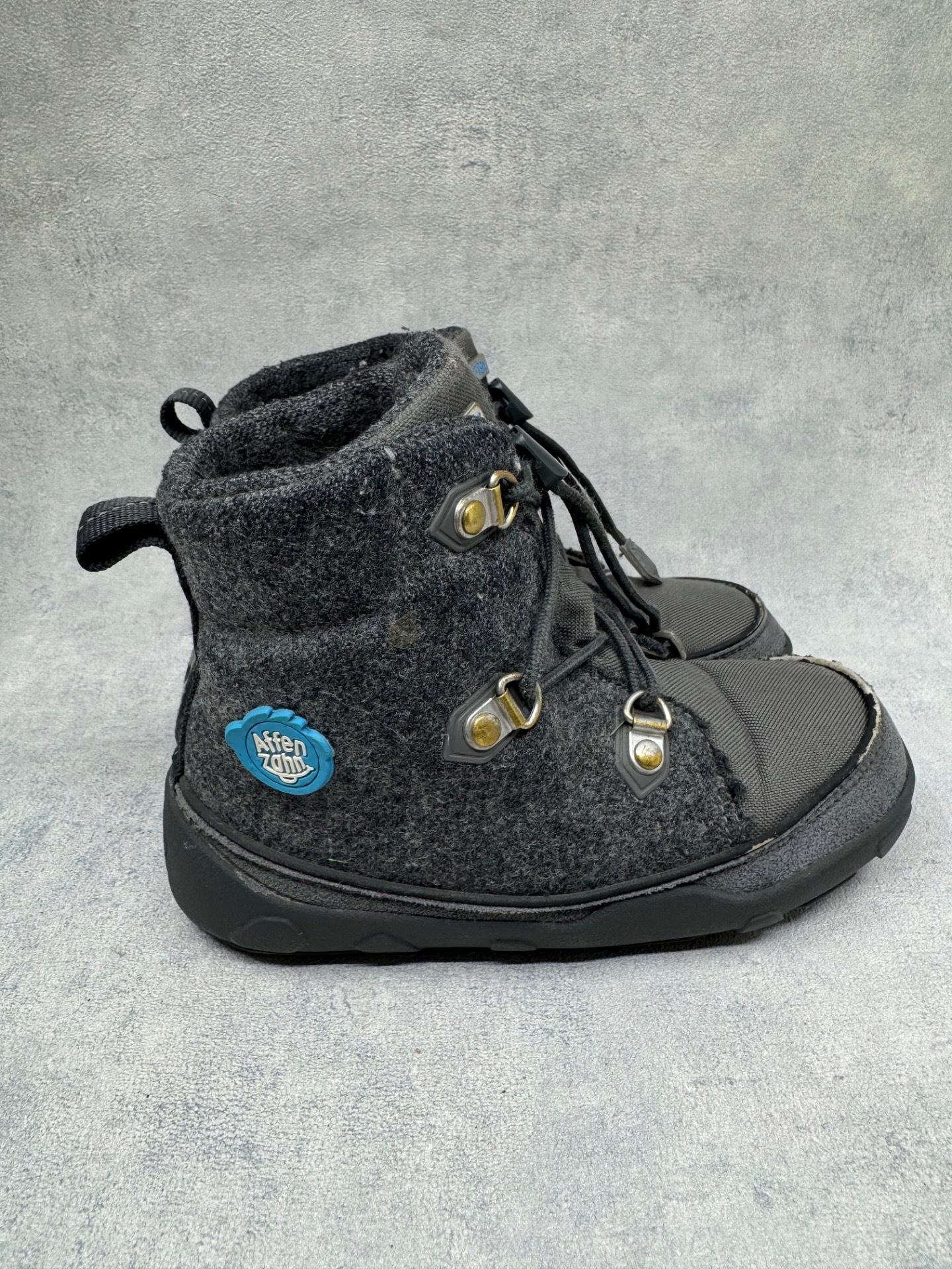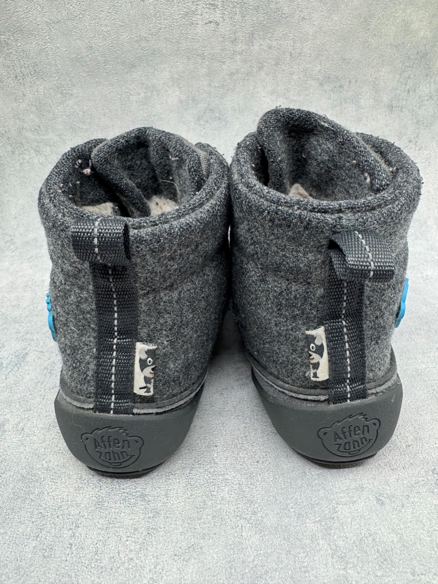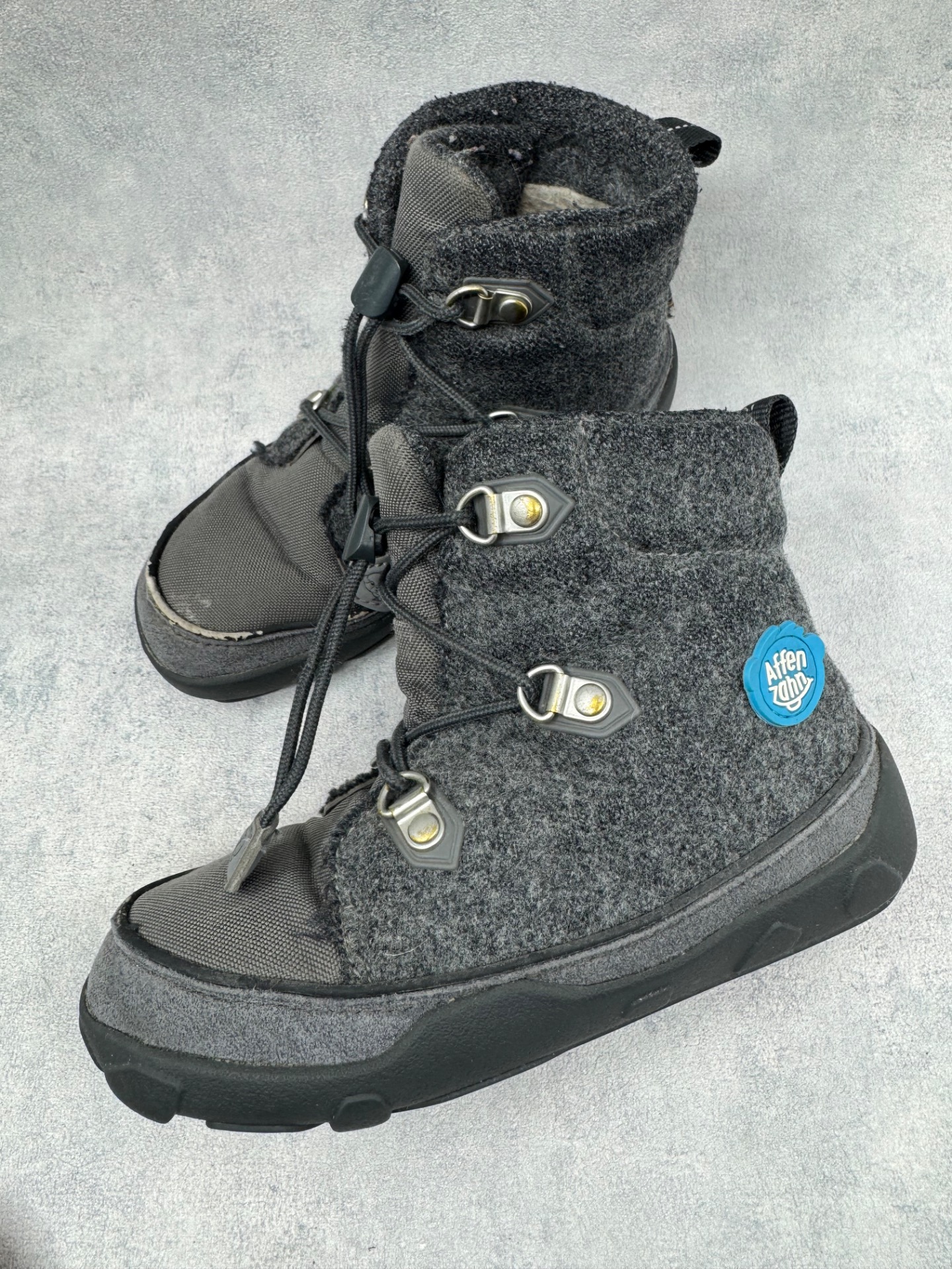 Hyväkuntoiset Affenzahnin paljasjalkakengät. Sisällä lämmin vuori sekä villapohjalliset. Kärjissä tyypillistä kulumaa, ei vaikuta käyttöön. Kengät kaikinpuolin muutoin siistit ja testattu vedenpitäviksi juoksevan veden alla. Joustava pohja.