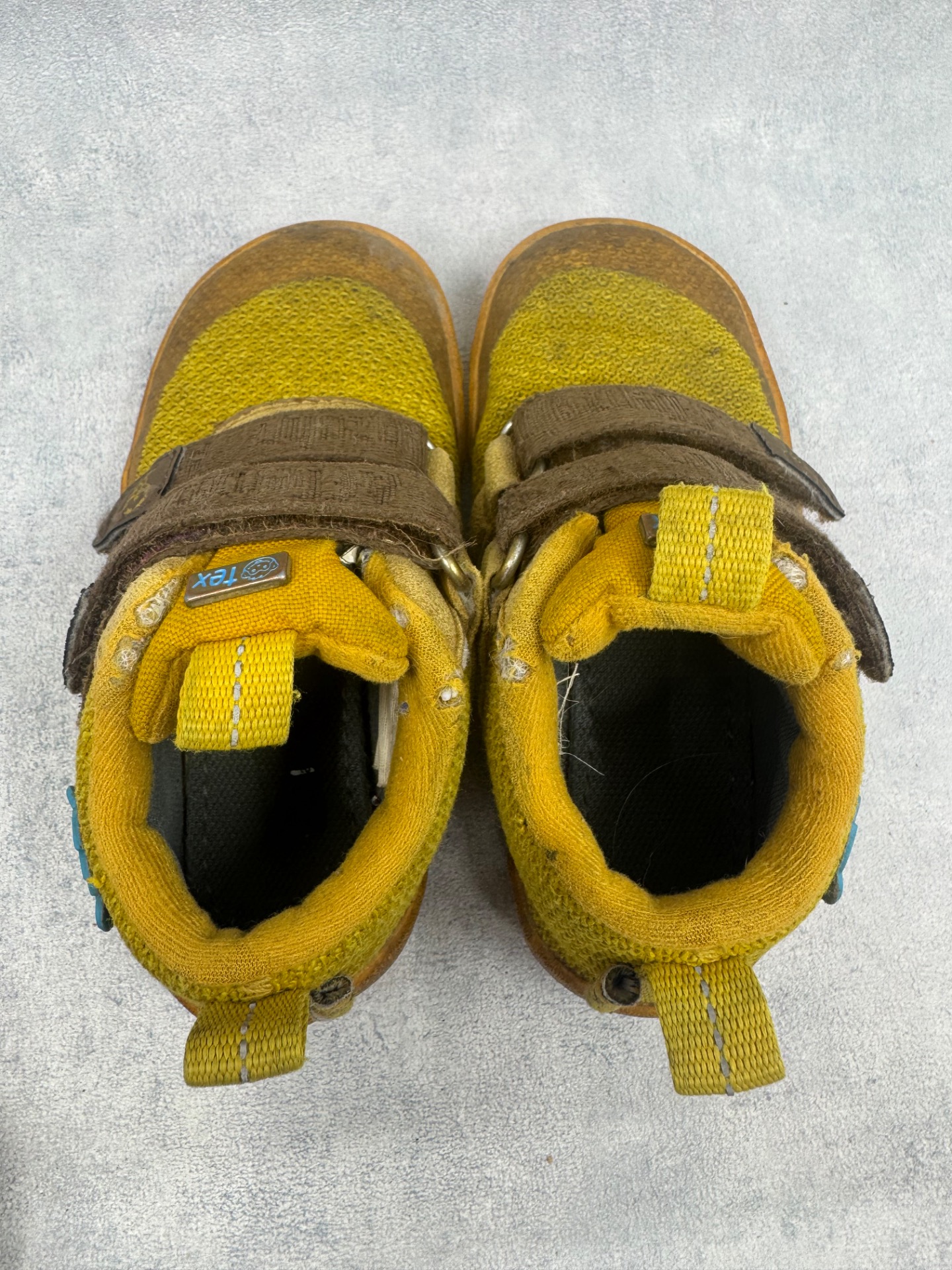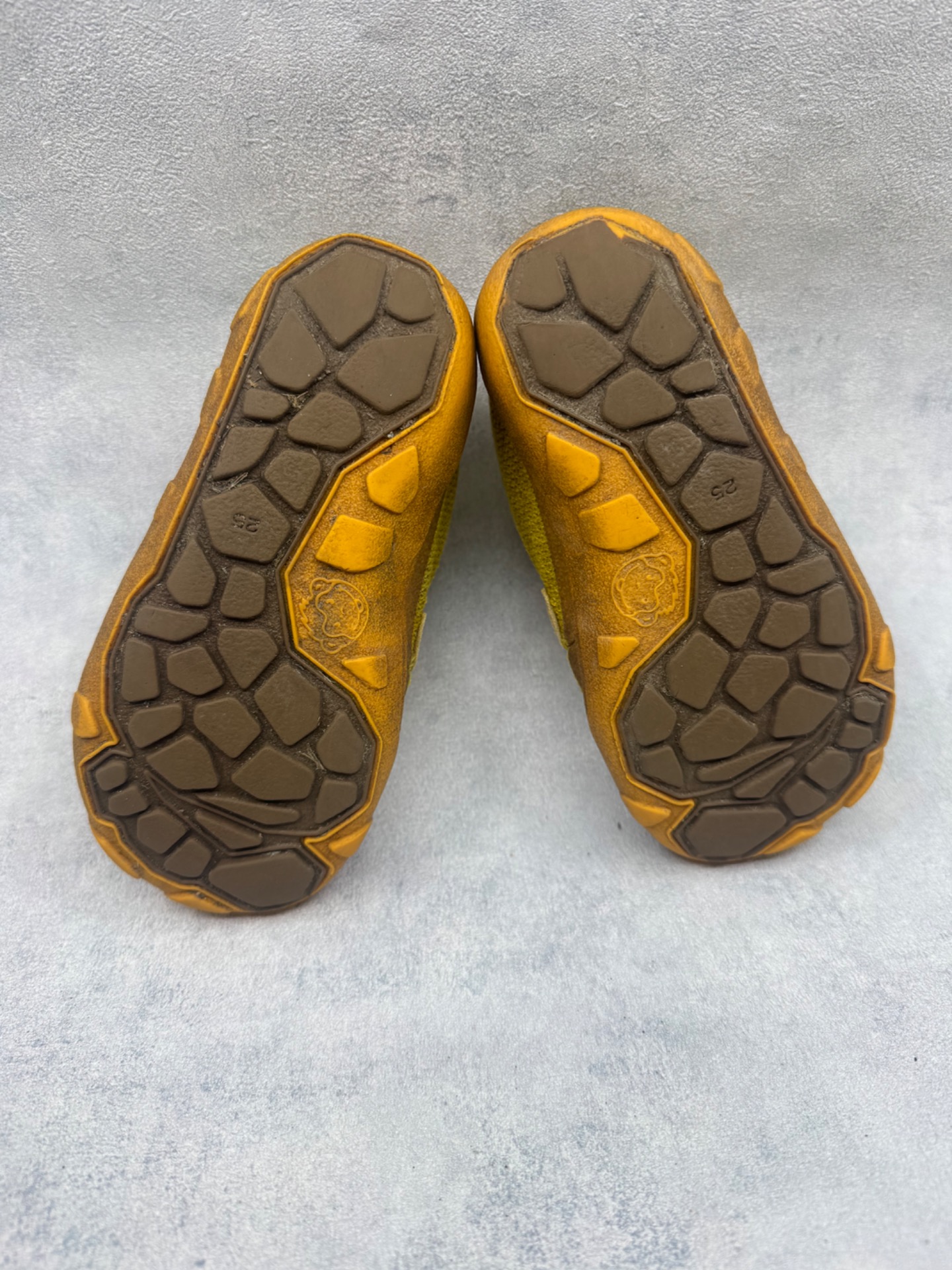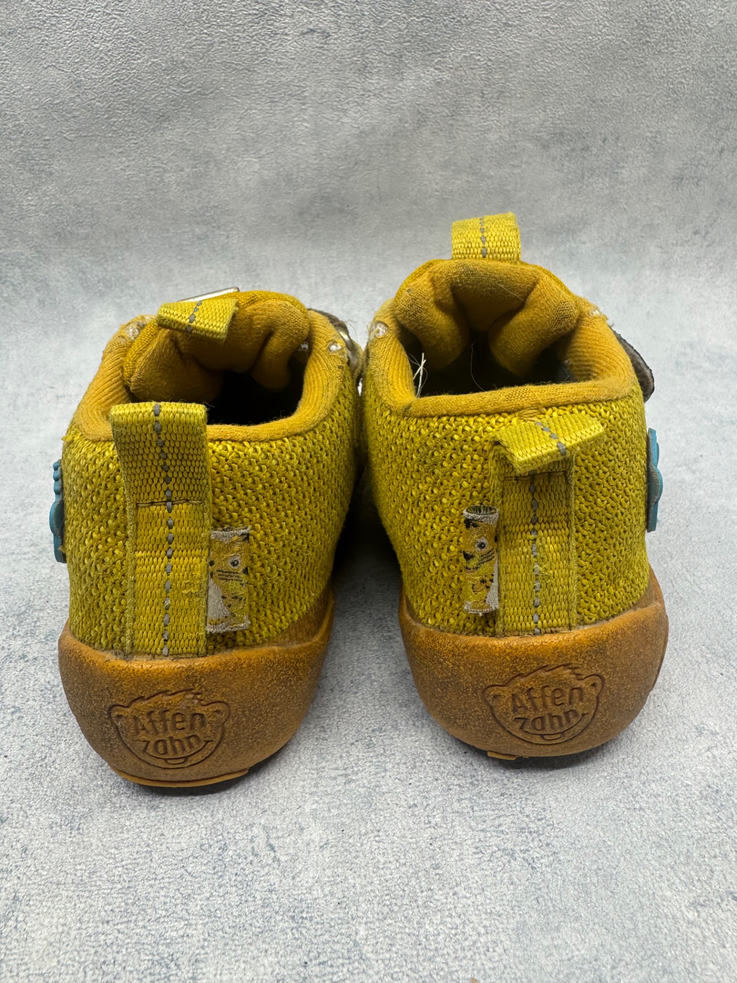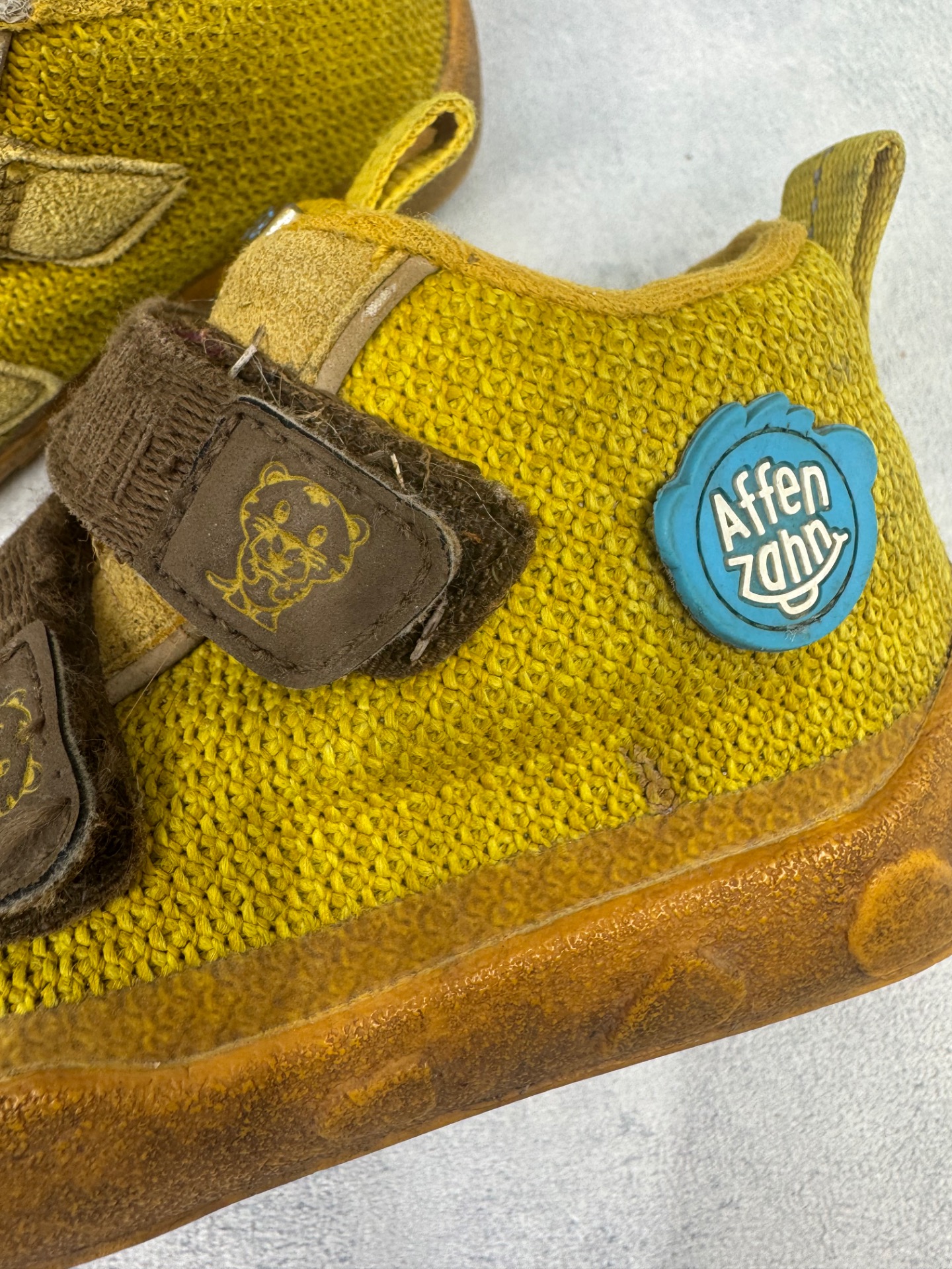 Hyväkuntoiset Affenzahnin paljasjalkakengät. Aran värin vuoksi käyttölikaa/tummentumaa pinnalla. Molempien kenkien suuaukolla kulumia, mutta ovat käytössä melko huomaamattomia. Yleisilmeeltään kengät ovat siistiti, tarrat pitää hyvin ja kengät on testattu juoksevan veden alla vedenpitäviksi.