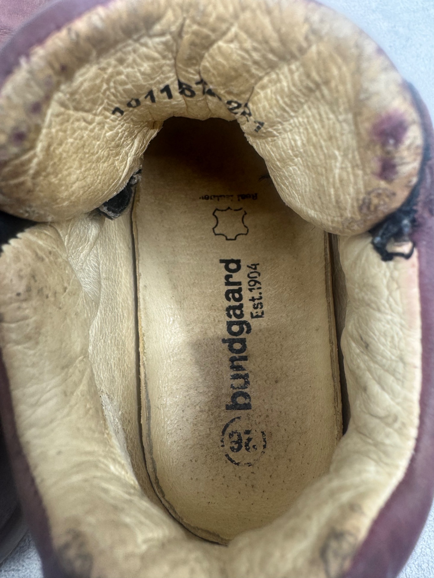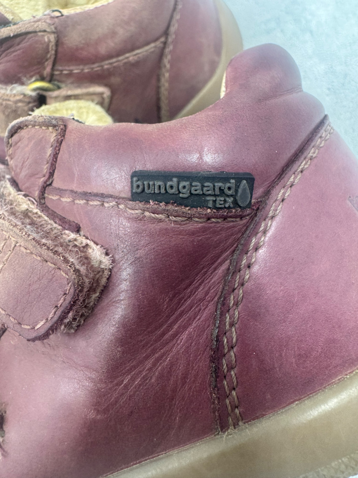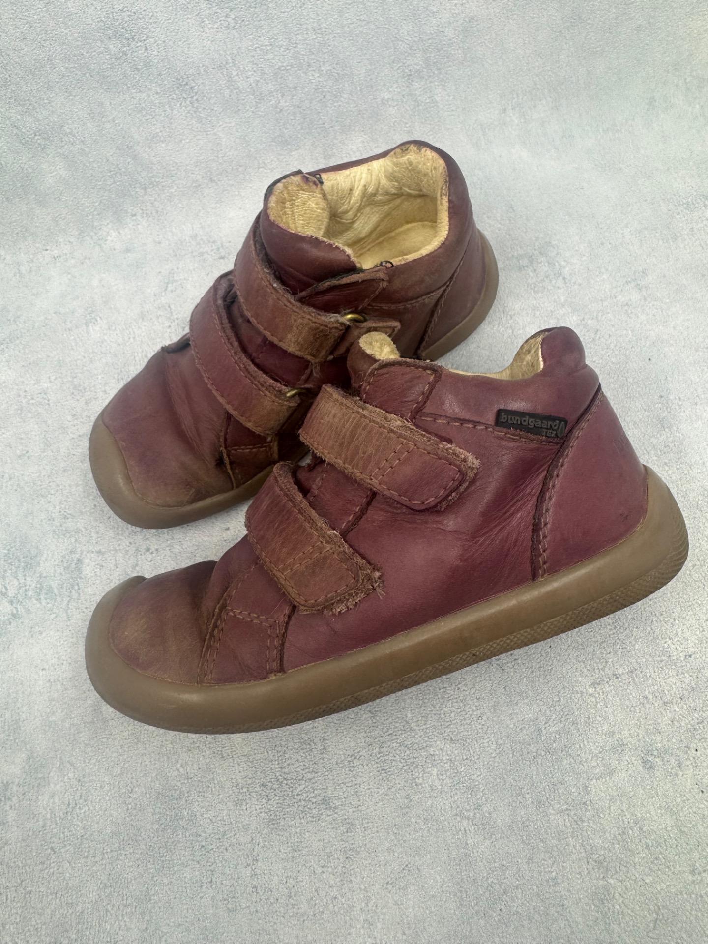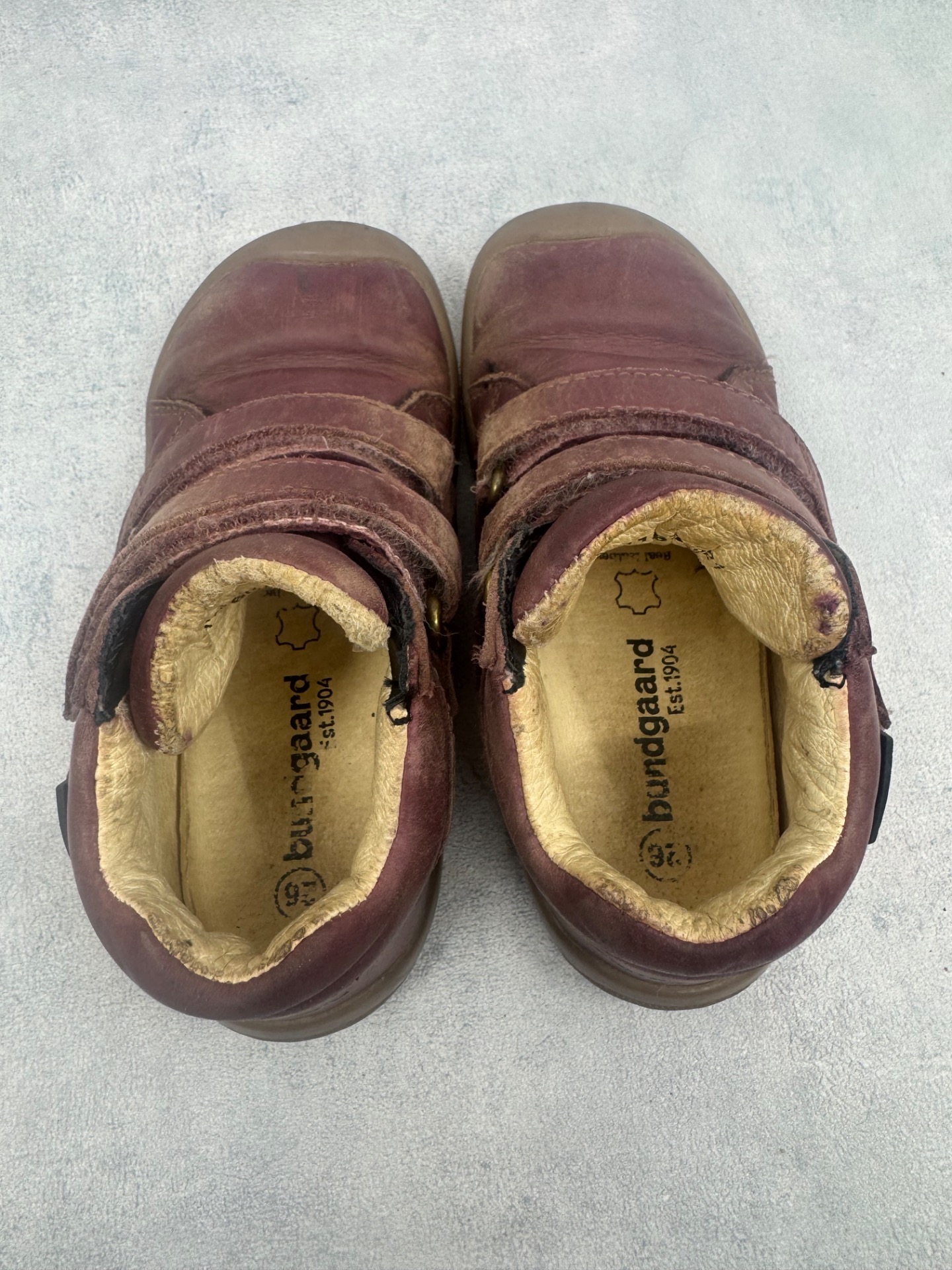 Hyväkuntoiset Bundgaardin paljasjalkakengät. Väri taittaa aavistuksen violettiin, tarrojen pinnat ovat vaaleanpunaiset. Pinta nahkaa, reilummin jo käytönjälkeä/ haalistumaa. Tarrat pitää erinomaisesti ja kengät on testattu juoksevan veden alla vedenpitäviksi. Joustava pohja.