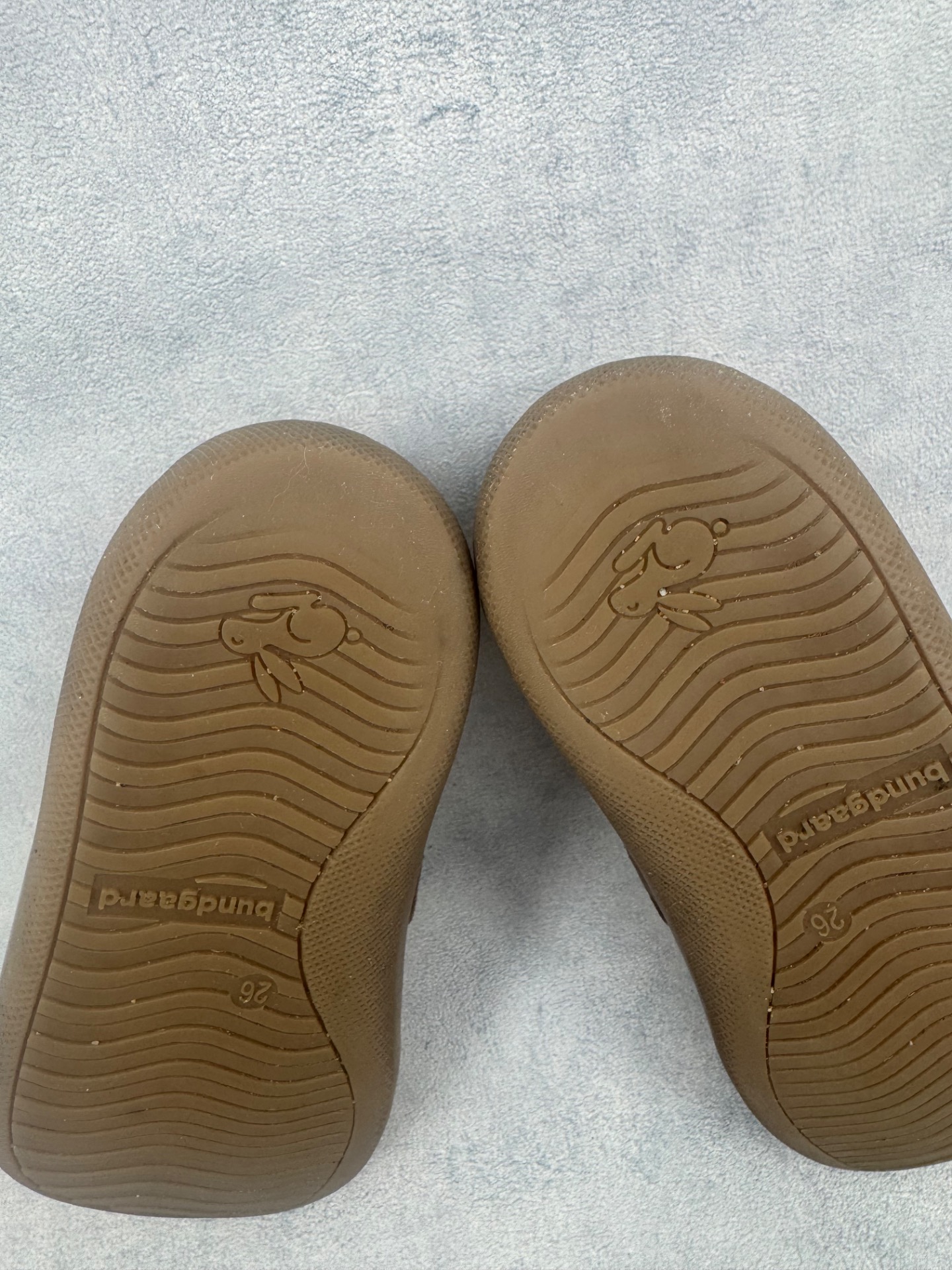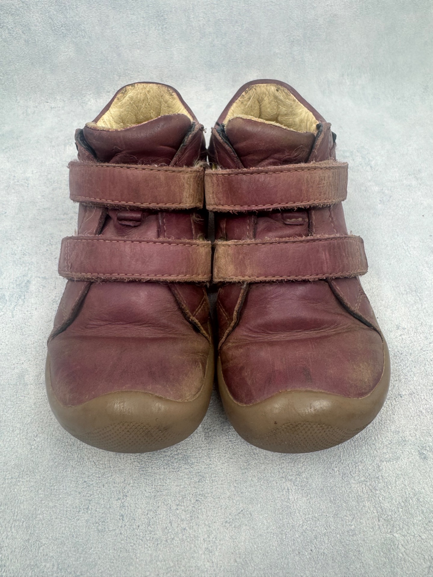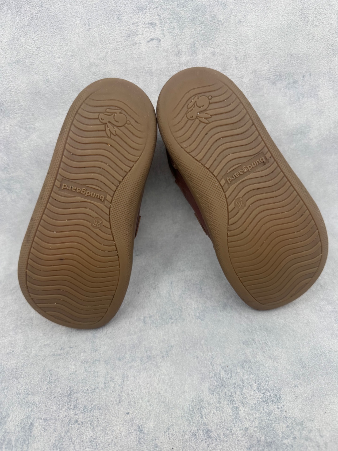 Hyväkuntoiset Bundgaardin paljasjalkakengät. Väri taittaa aavistuksen violettiin, tarrojen pinnat ovat vaaleanpunaiset. Pinta nahkaa, reilummin jo käytönjälkeä/ haalistumaa. Tarrat pitää erinomaisesti ja kengät on testattu juoksevan veden alla vedenpitäviksi. Joustava pohja.