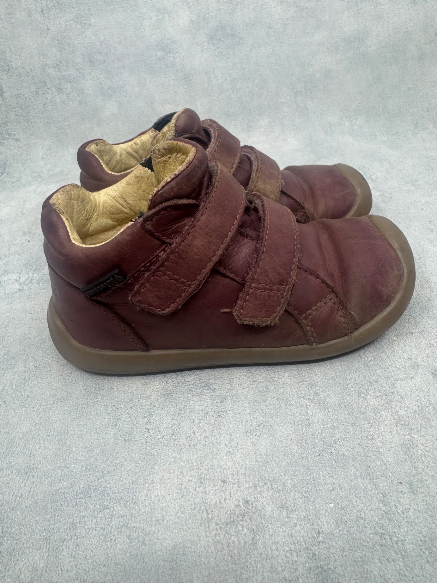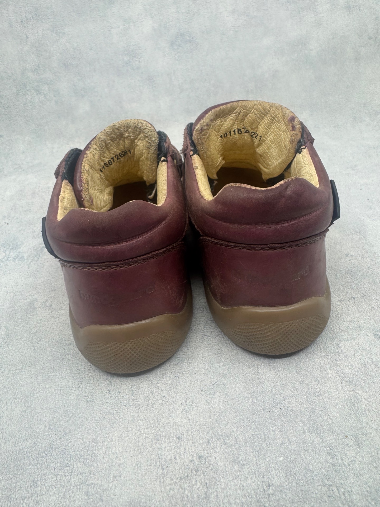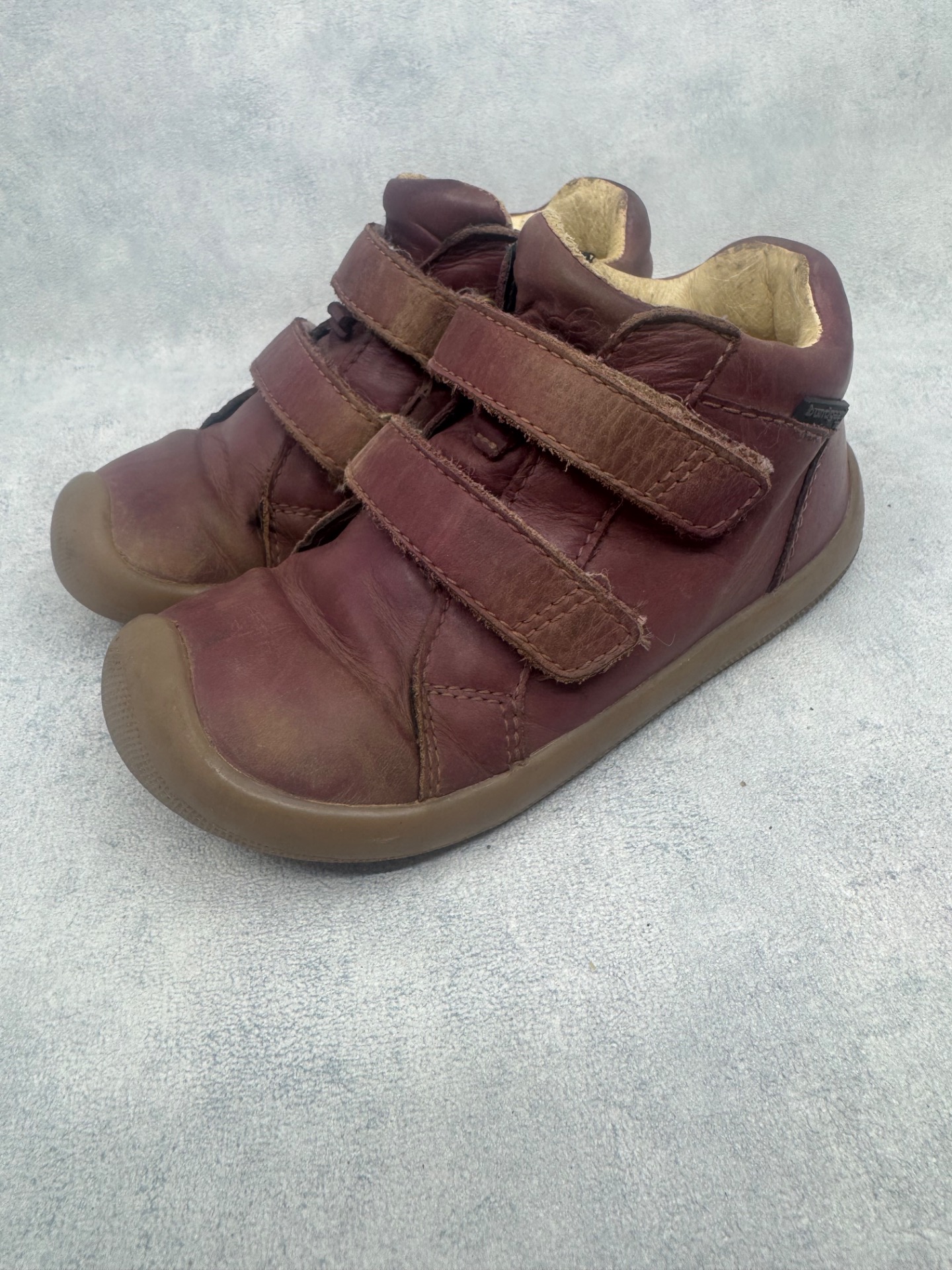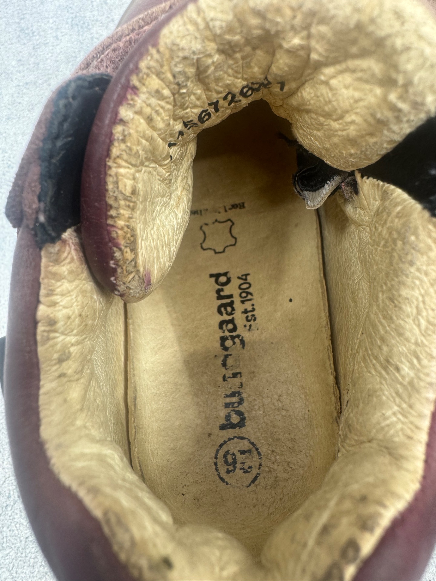 Hyväkuntoiset Bundgaardin paljasjalkakengät. Väri taittaa aavistuksen violettiin, tarrojen pinnat ovat vaaleanpunaiset. Pinta nahkaa, reilummin jo käytönjälkeä/ haalistumaa. Tarrat pitää erinomaisesti ja kengät on testattu juoksevan veden alla vedenpitäviksi. Joustava pohja.