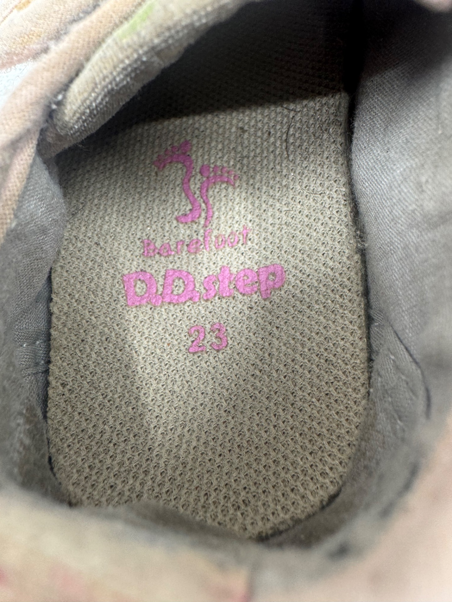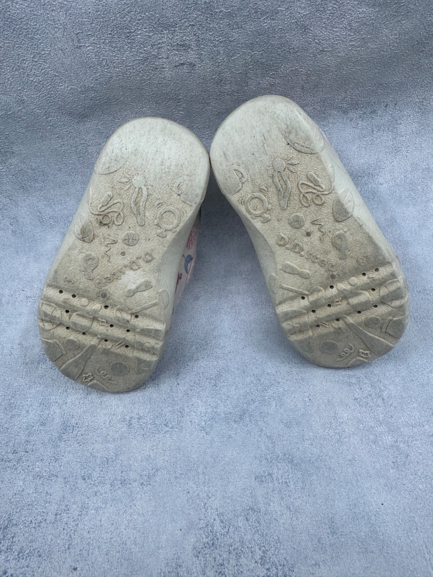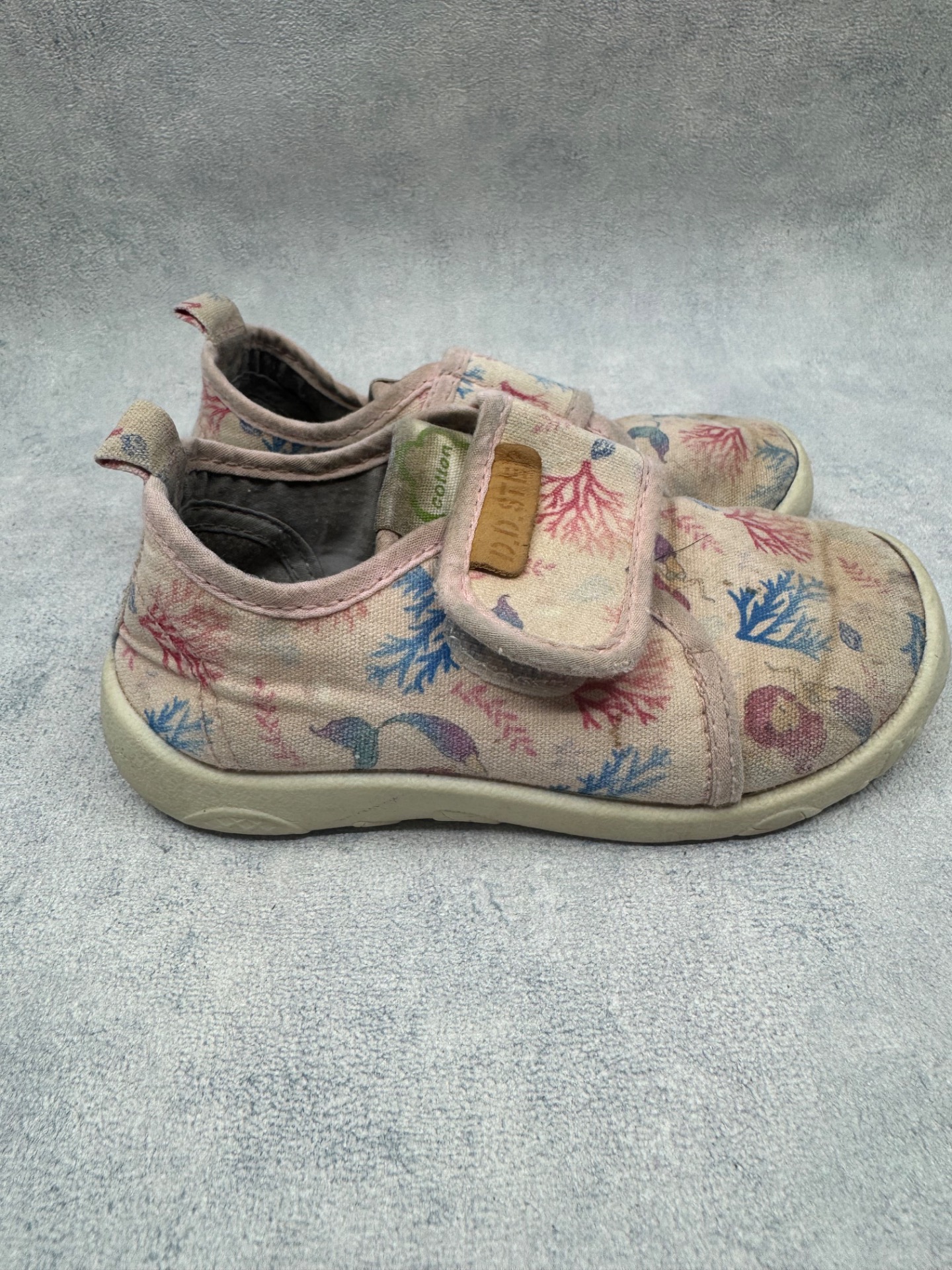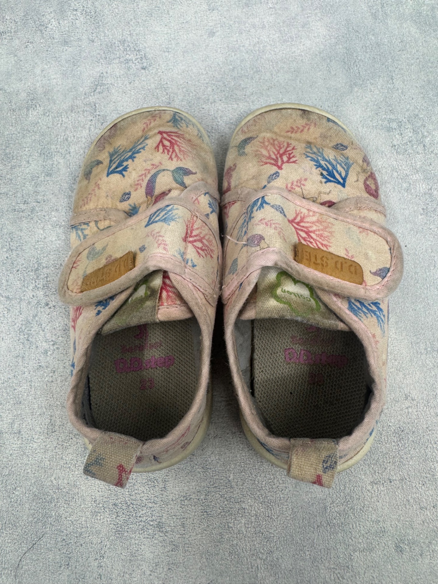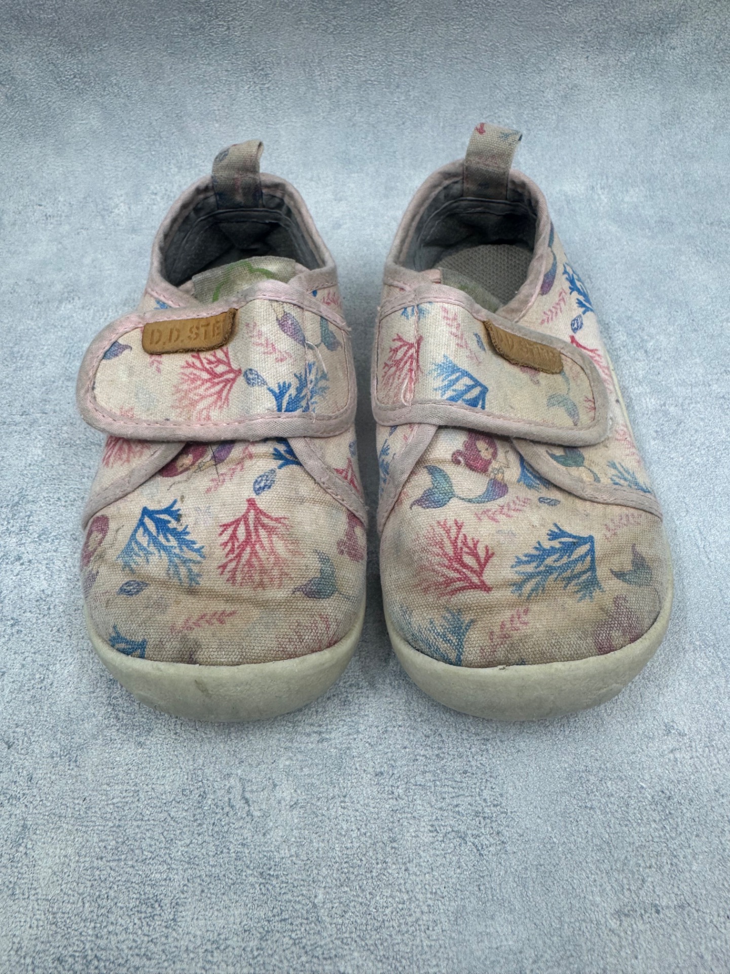 Hyväkuntoiset D.D Step kangaskengät/paljasjalkakengät. Aavistus tummentumaa kenkien päällä, sekä pohjissa kulumsa kantapäiden kohdalla. Yleisilmeeltään kengät ovat oikein siistit ja tarrat pitää erinomaisesti. Kevyet, mukavat kengät joustavalla pohjalla.