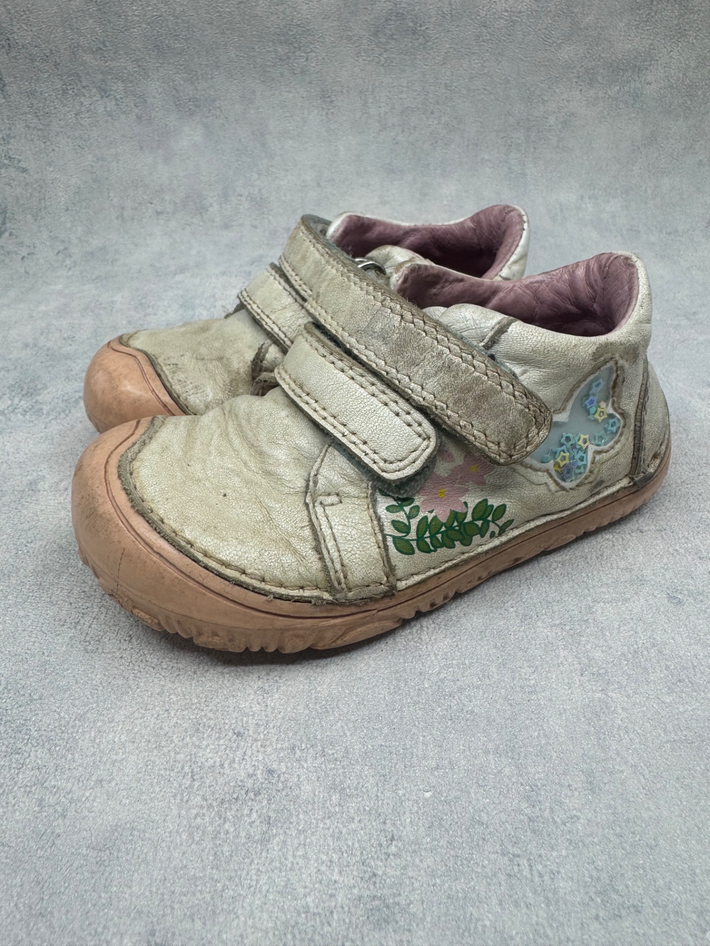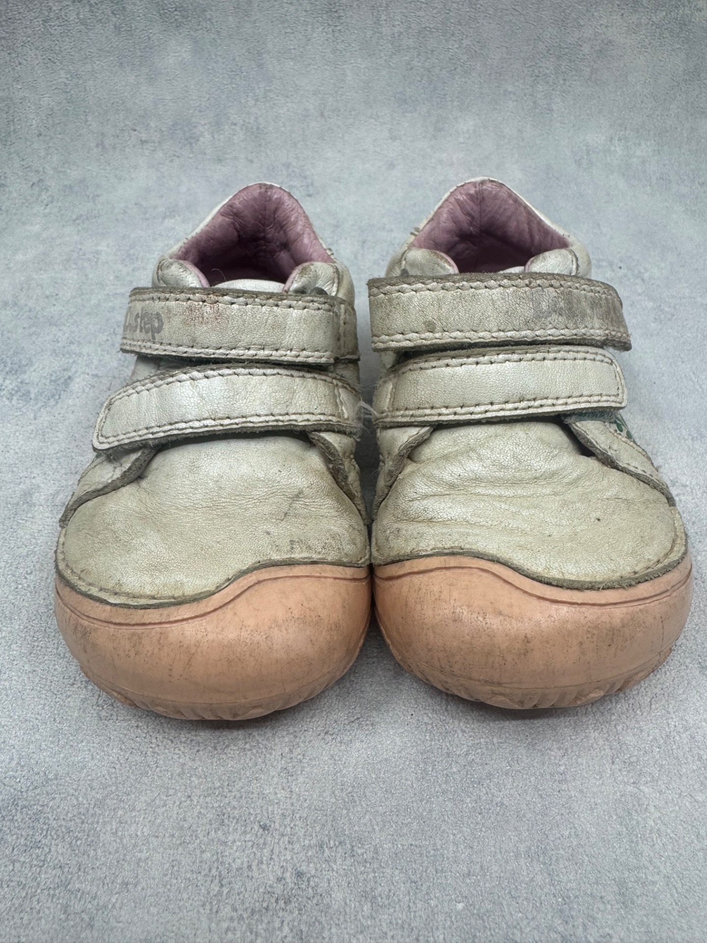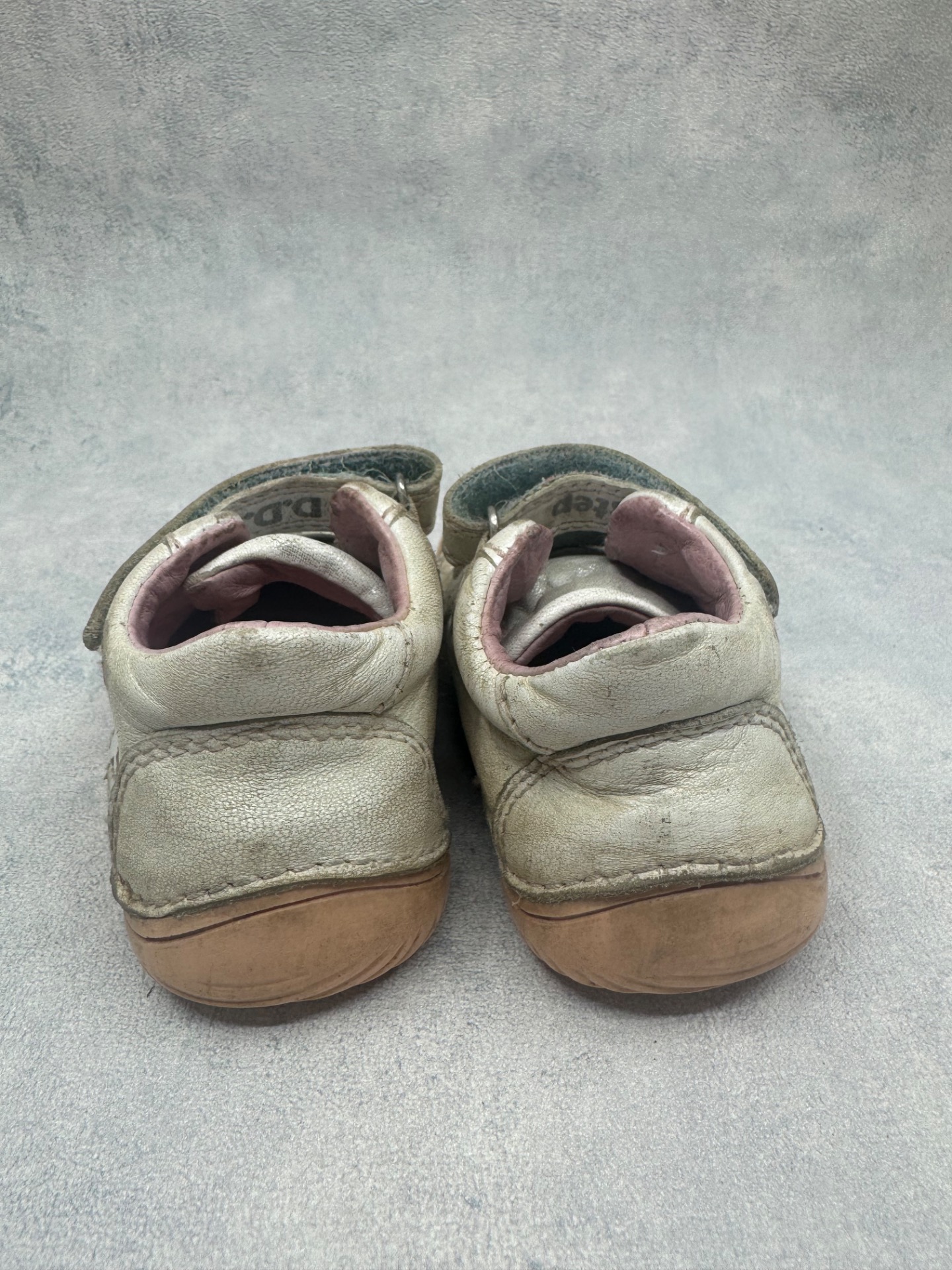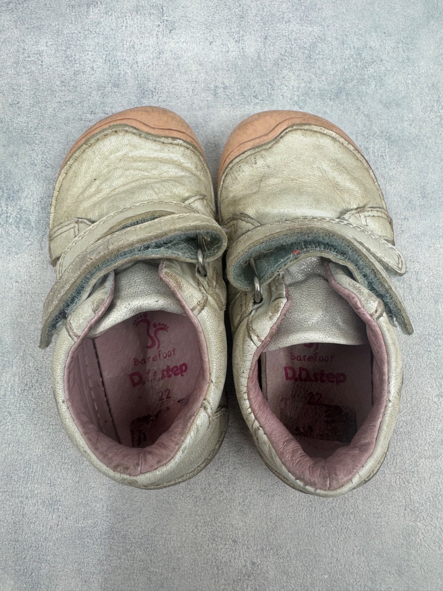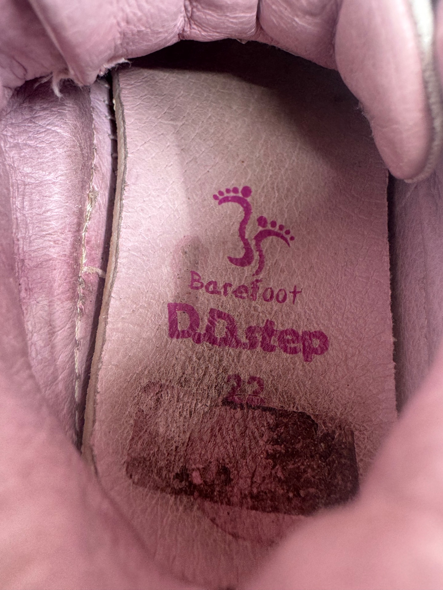 Hyväkuntoiset D.D Step paljasjalkakengät. Aran värin vuoksi reilusti tummentumaa pinnalla,sekä pohjissa kantapään kohdalla kulumaa, mutta kengät muutoin hyvässä kunnossa ja tarrat pitää erinomaisesti. Mukavat, notkeat kengät pienelle joustavalla pohjalla.