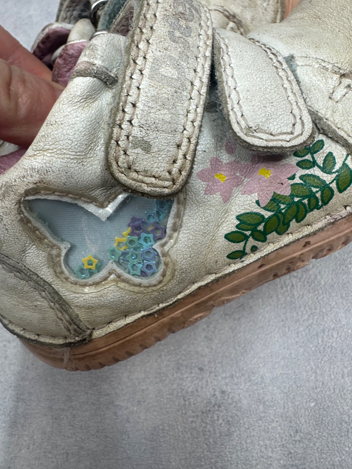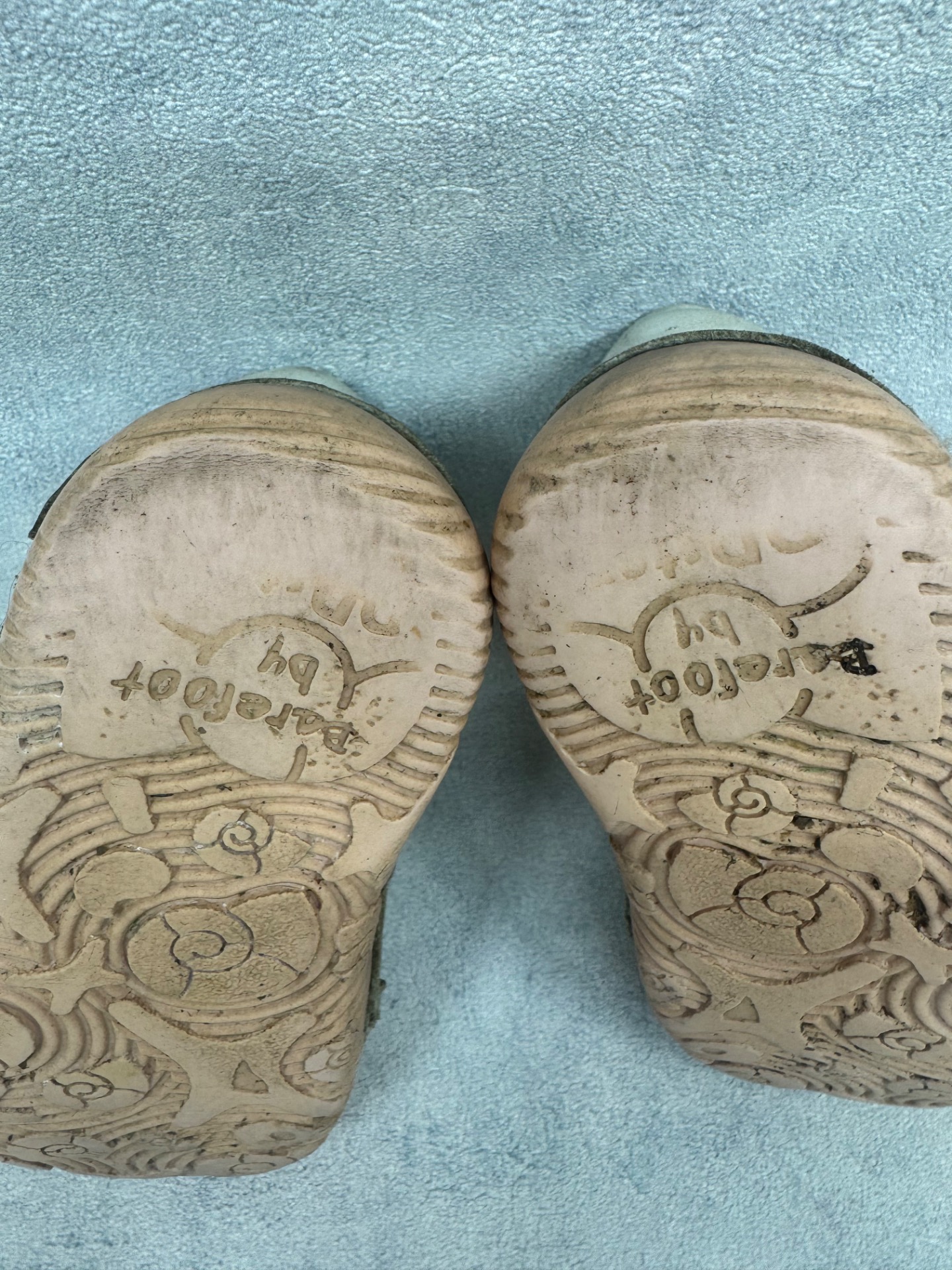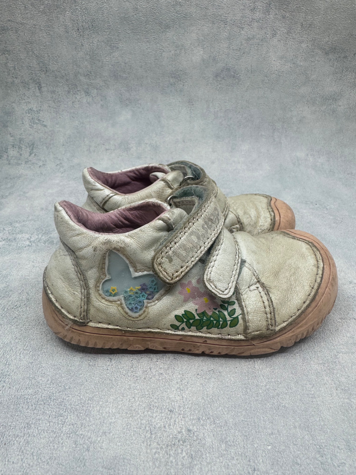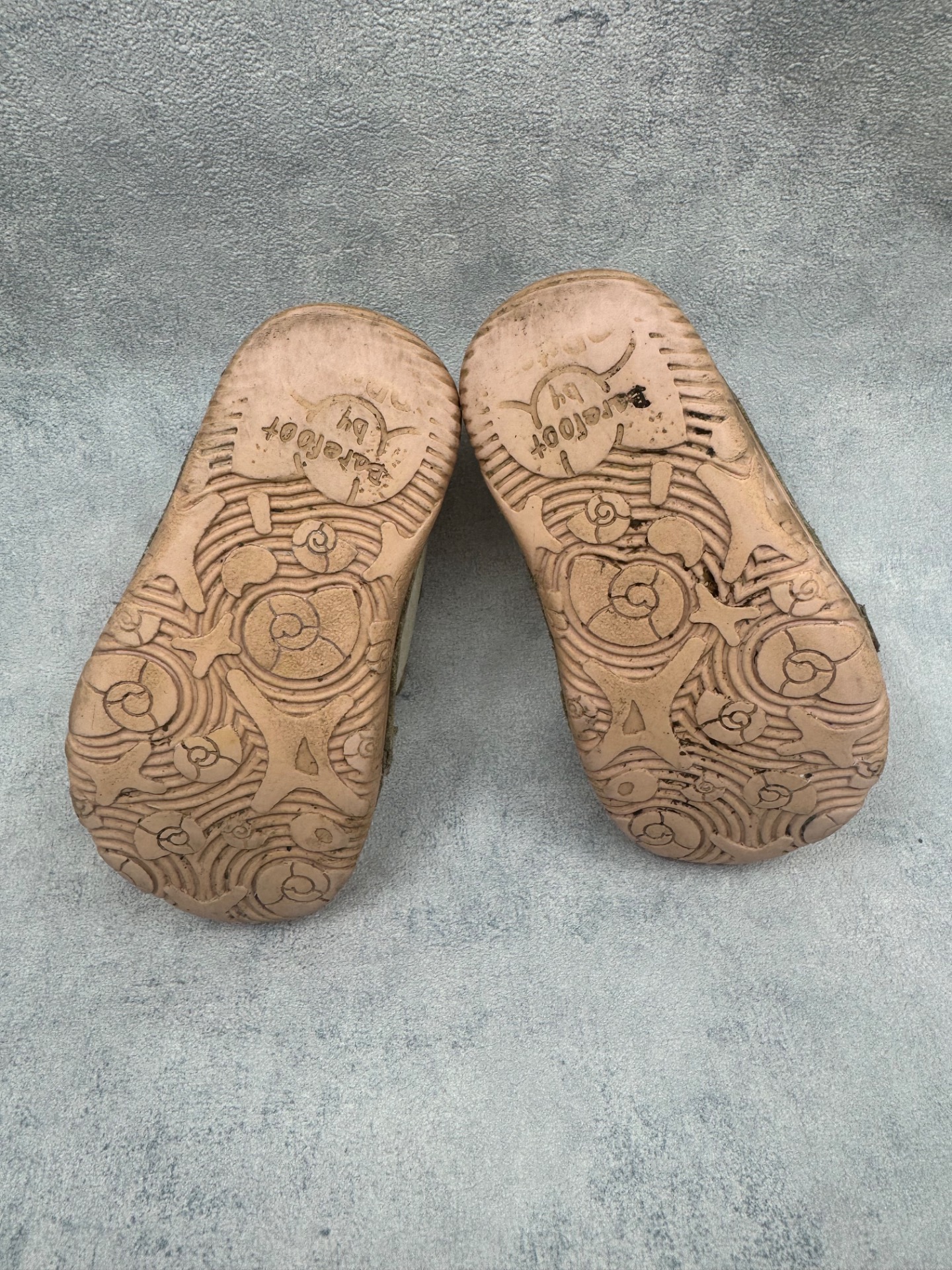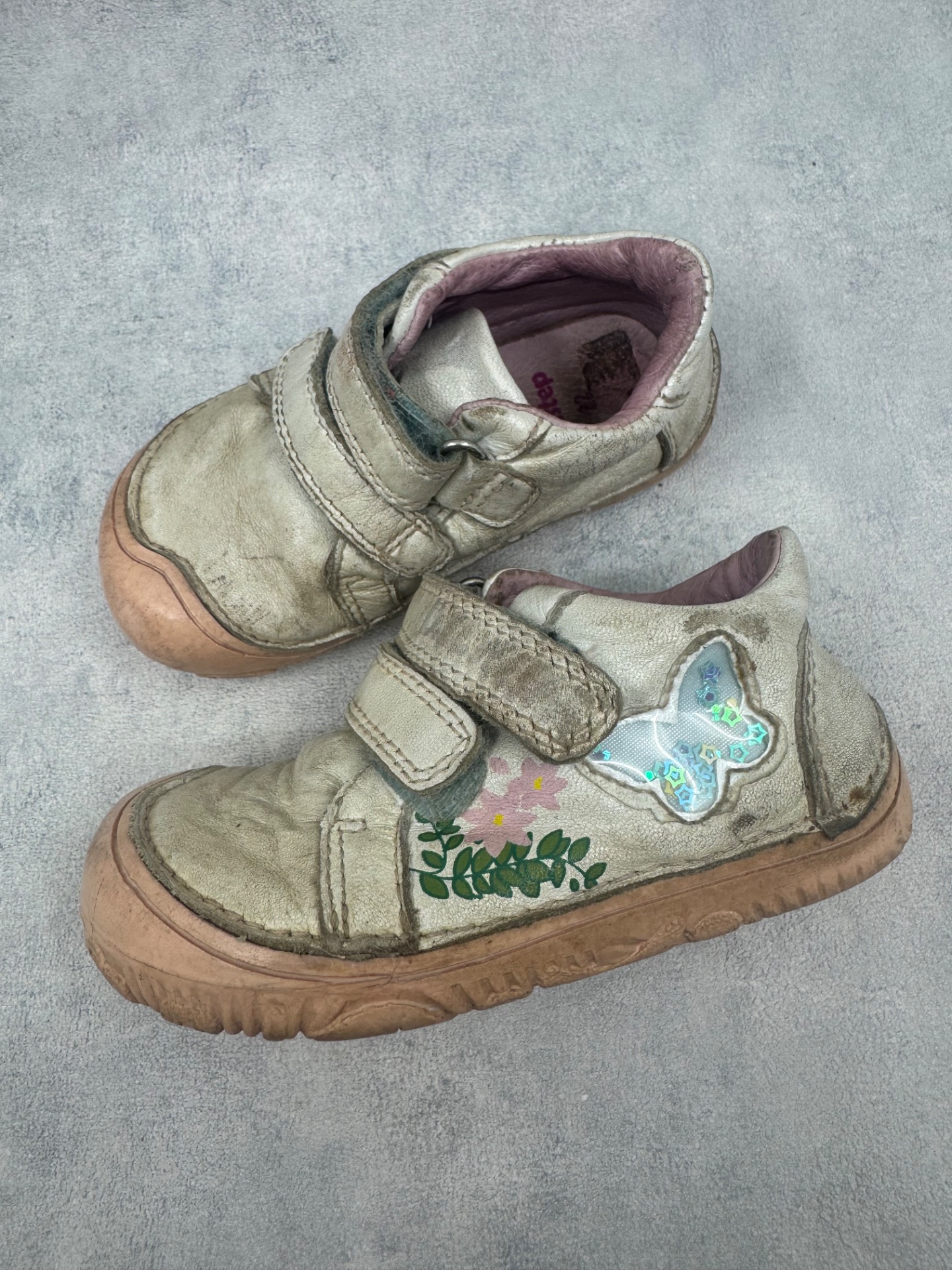 Hyväkuntoiset D.D Step paljasjalkakengät. Aran värin vuoksi reilusti tummentumaa pinnalla,sekä pohjissa kantapään kohdalla kulumaa, mutta kengät muutoin hyvässä kunnossa ja tarrat pitää erinomaisesti. Mukavat, notkeat kengät pienelle joustavalla pohjalla.