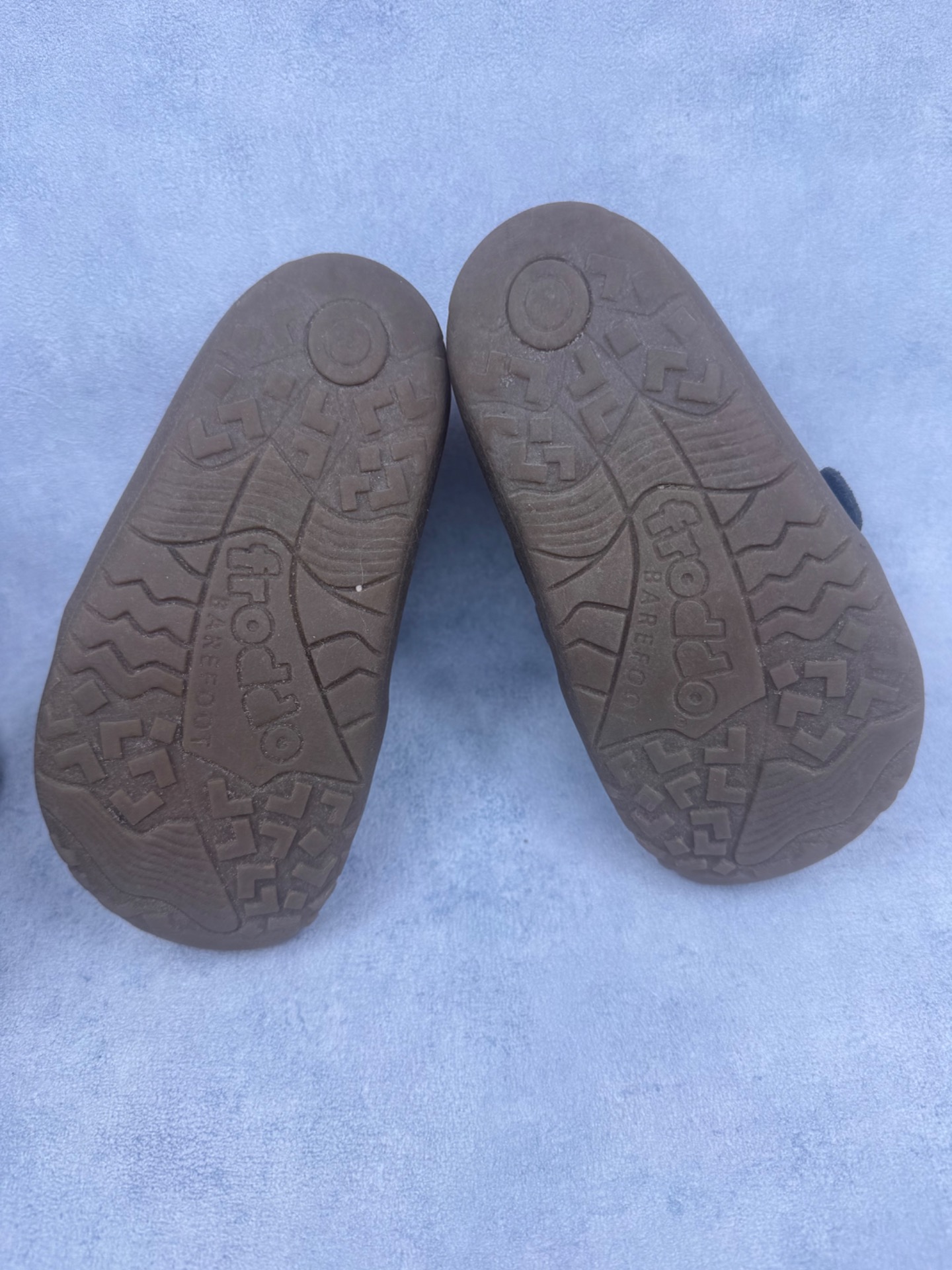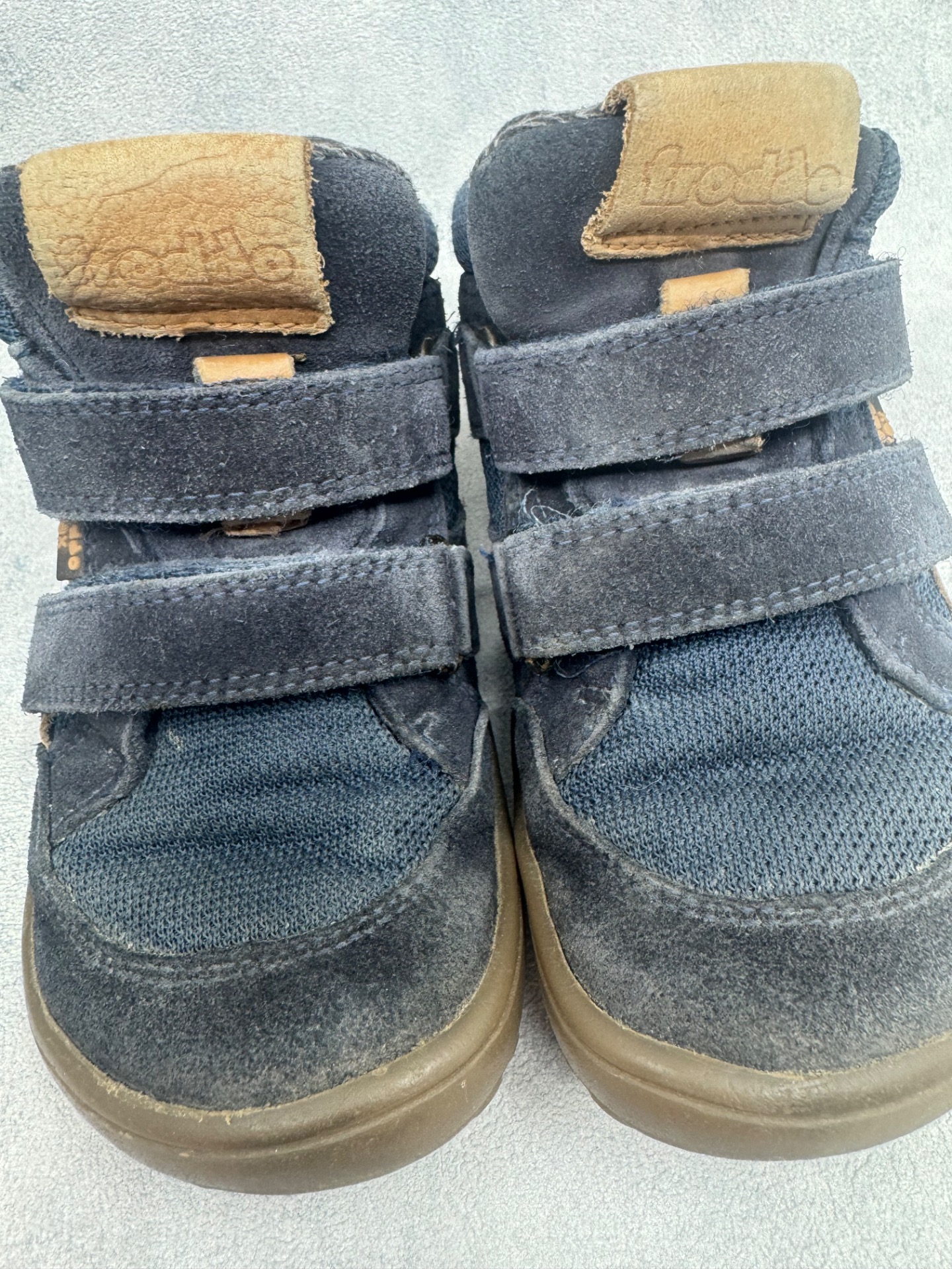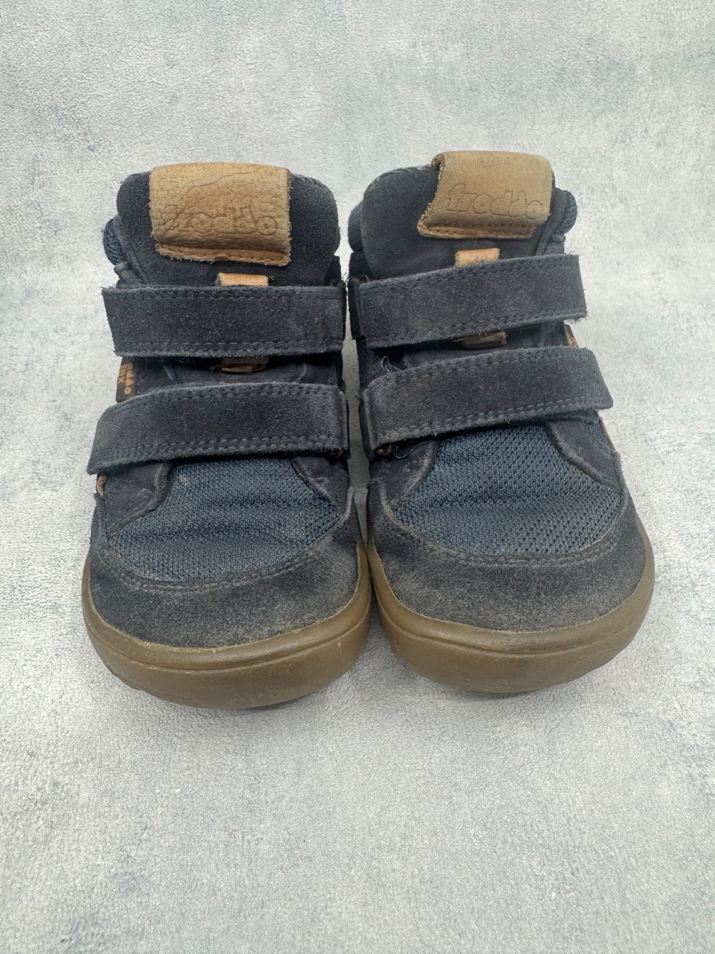 Hyväkuntoiset Froddon paljasjalkakengät. Kauttaaltaan jo käytössä haalistuneet, mutta yleisilmeeltään siistit, tarrat pitää hyvin ja kengät on testattu vedenpitäviksi juoksevan veden alla. Joustava pohja.