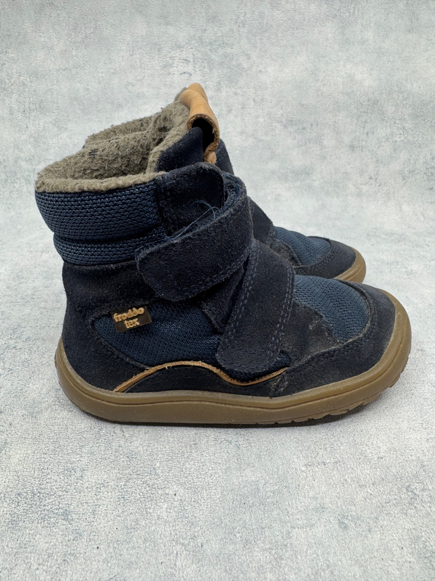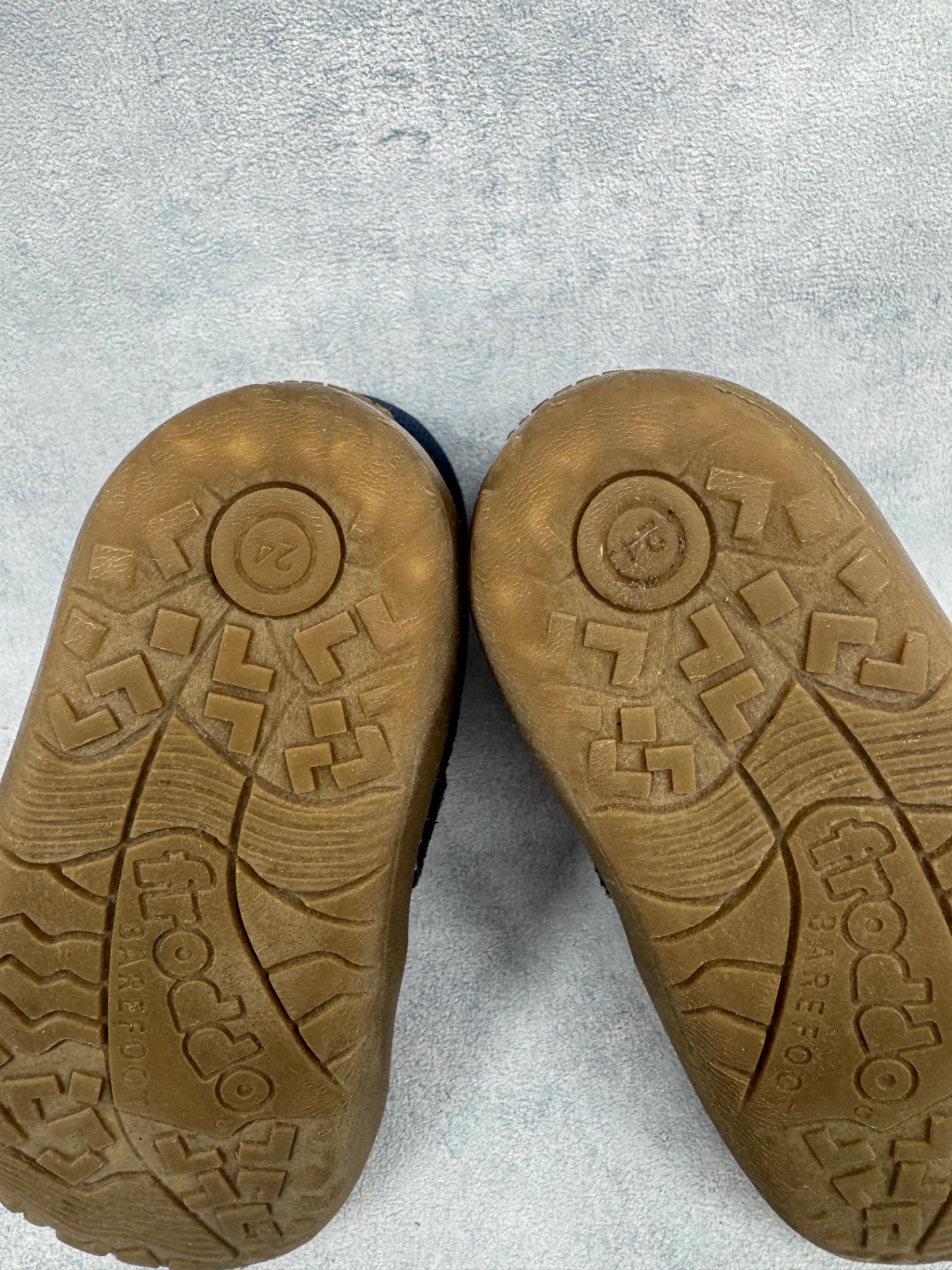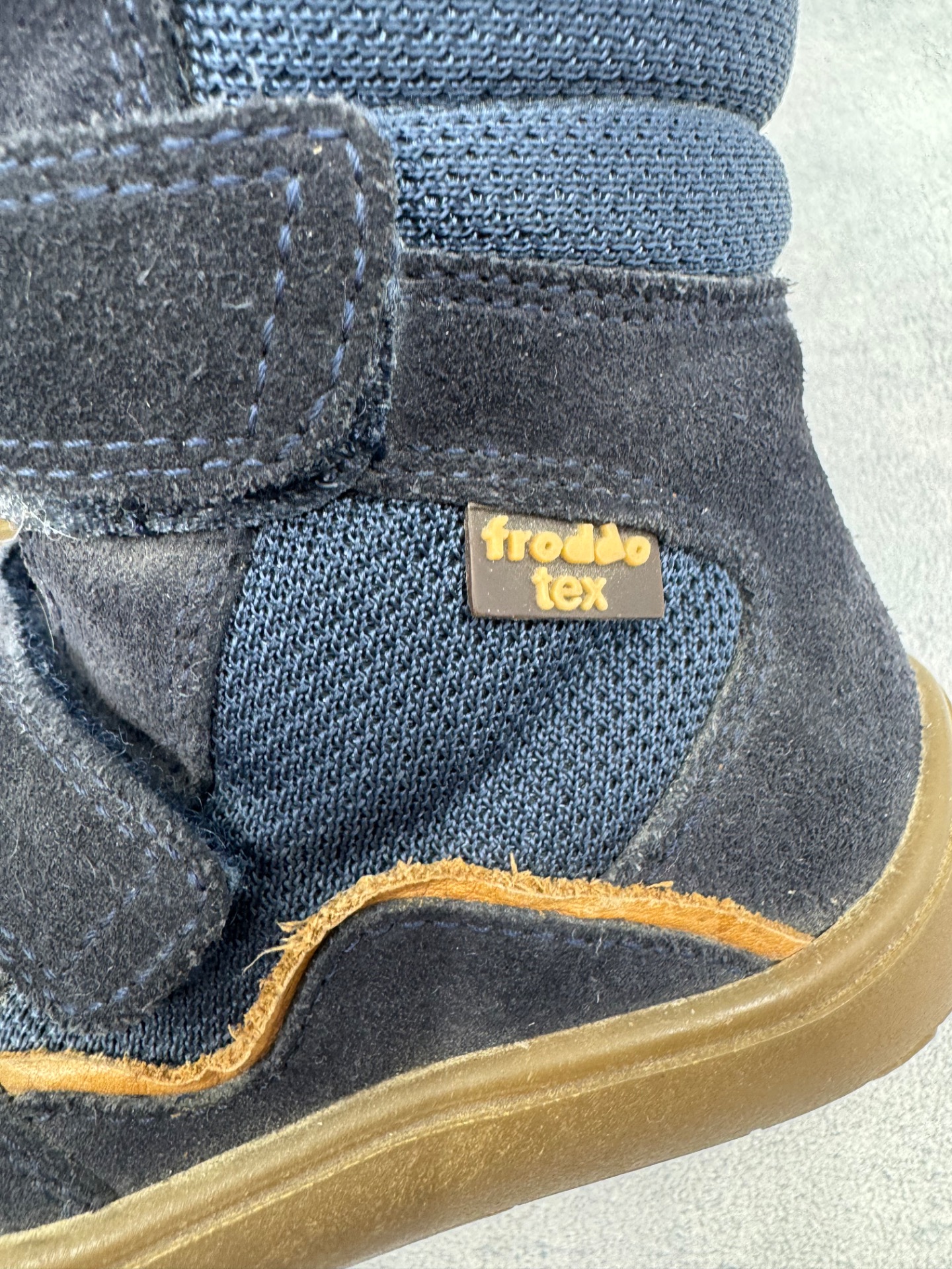 Hyvökuntoiset Froddon tummansiniset paljasjalkakengät. Aavistus haalistumaa paikoin, yleisilme erittäin siisti. Sisällä vuori, hyvässä kunnossa, uudesta painunut joten kengät sopivat mainiosti välikauteen. Tarrat pitää erinomaisesti ja kengät on testattu juoksevan veden alla vedenpitäviksi. Pohjat erinomaisessa kunnossa.