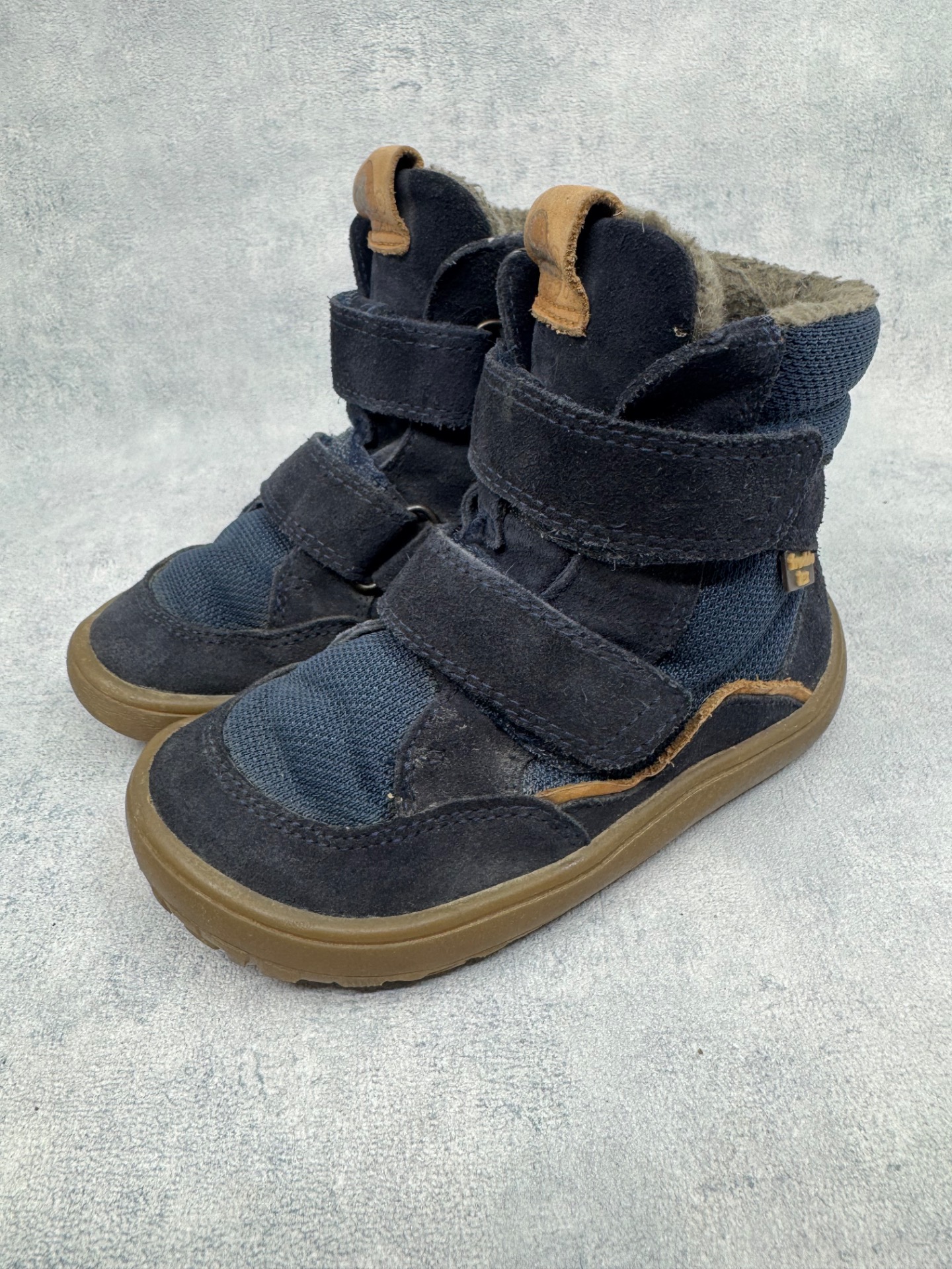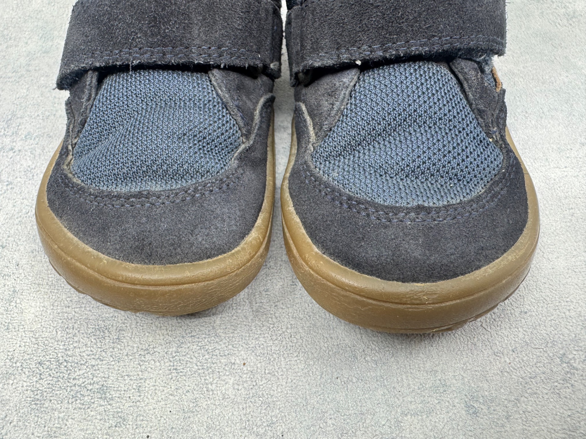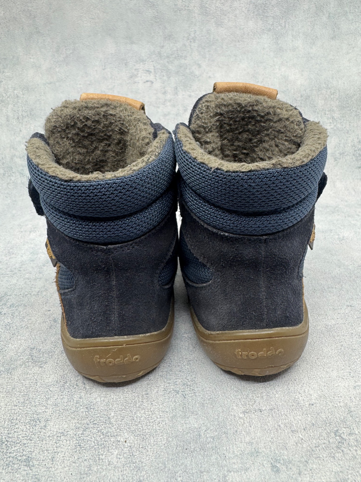 Hyvökuntoiset Froddon tummansiniset paljasjalkakengät. Aavistus haalistumaa paikoin, yleisilme erittäin siisti. Sisällä vuori, hyvässä kunnossa, uudesta painunut joten kengät sopivat mainiosti välikauteen. Tarrat pitää erinomaisesti ja kengät on testattu juoksevan veden alla vedenpitäviksi. Pohjat erinomaisessa kunnossa.