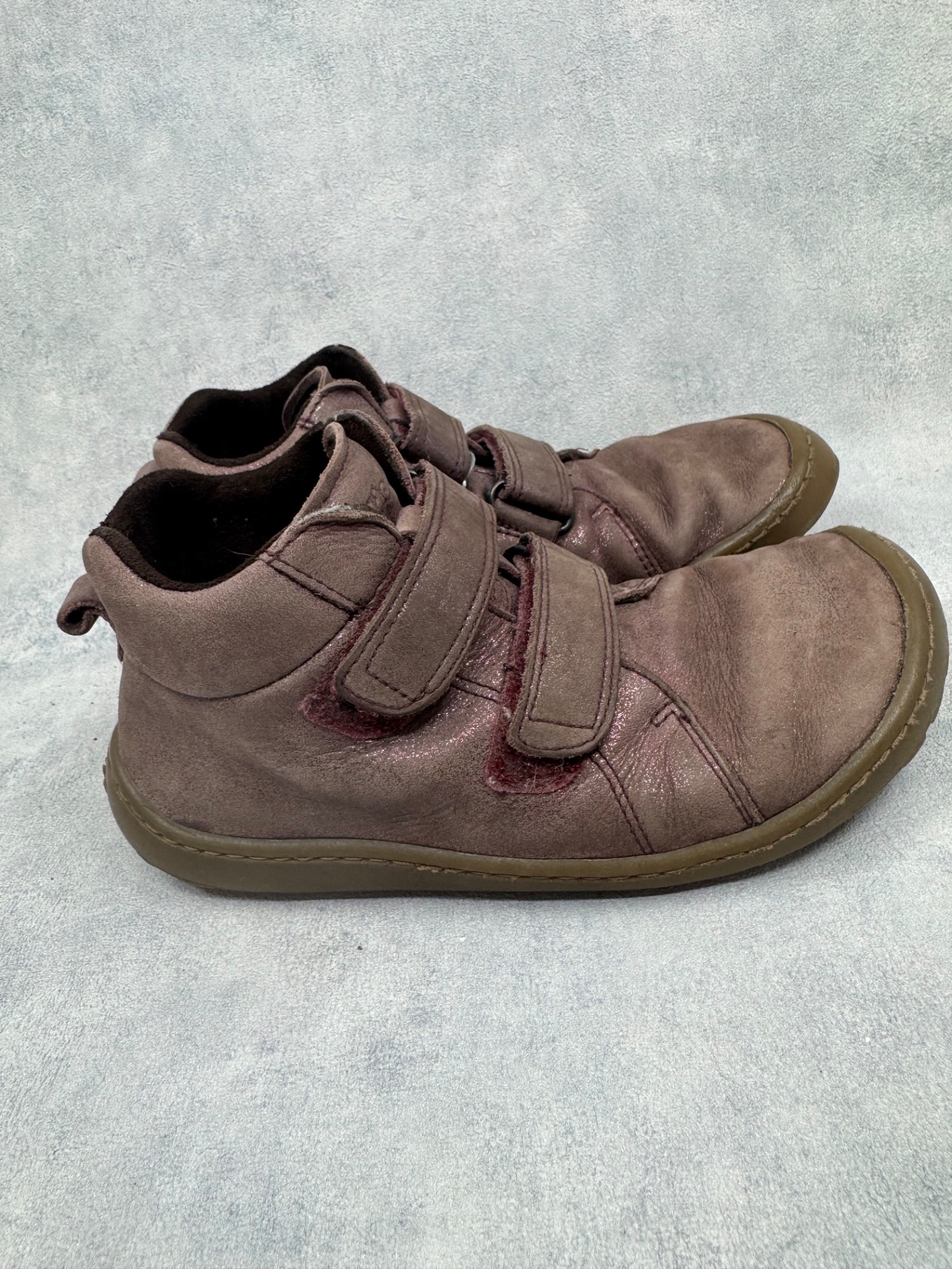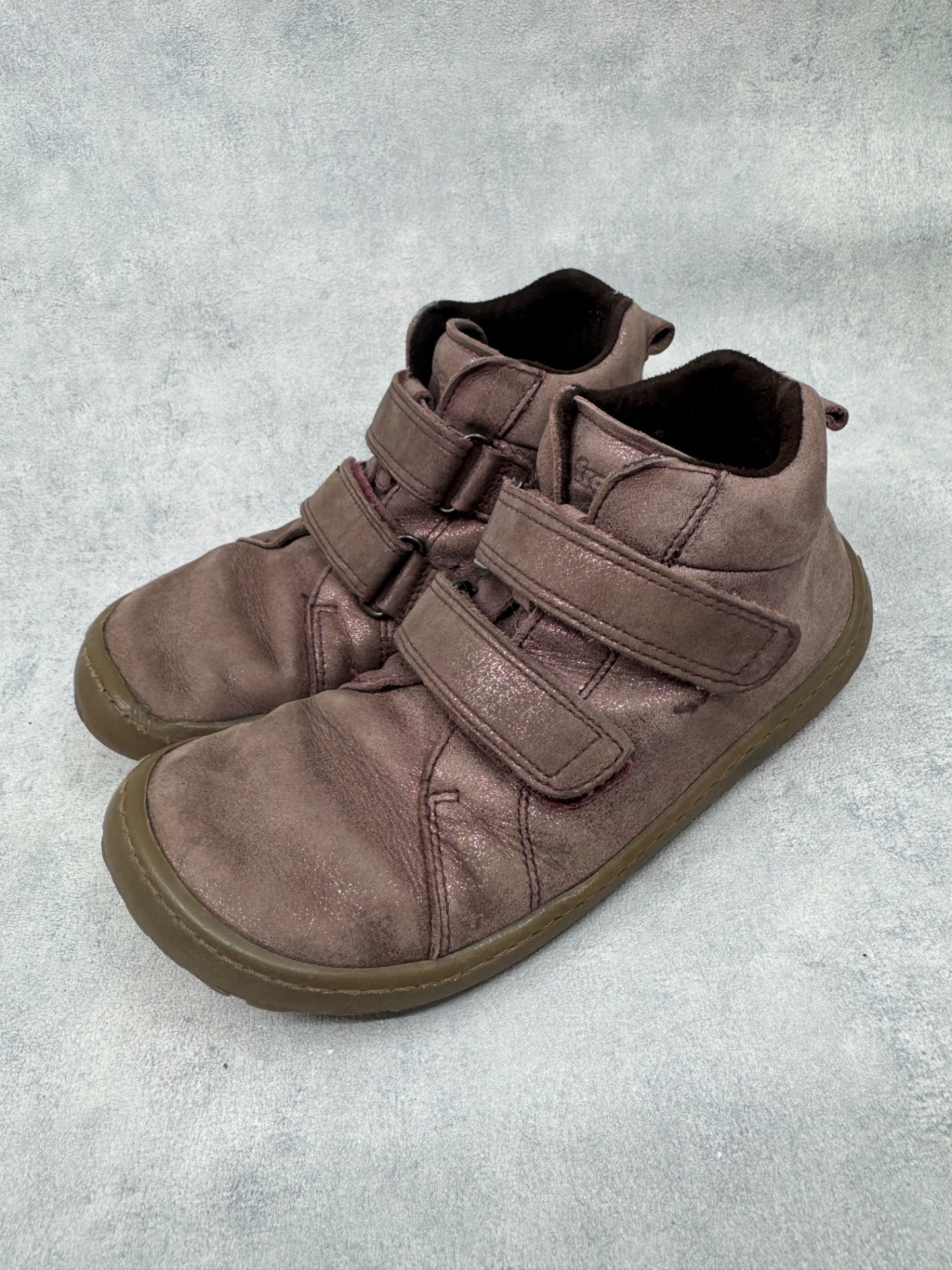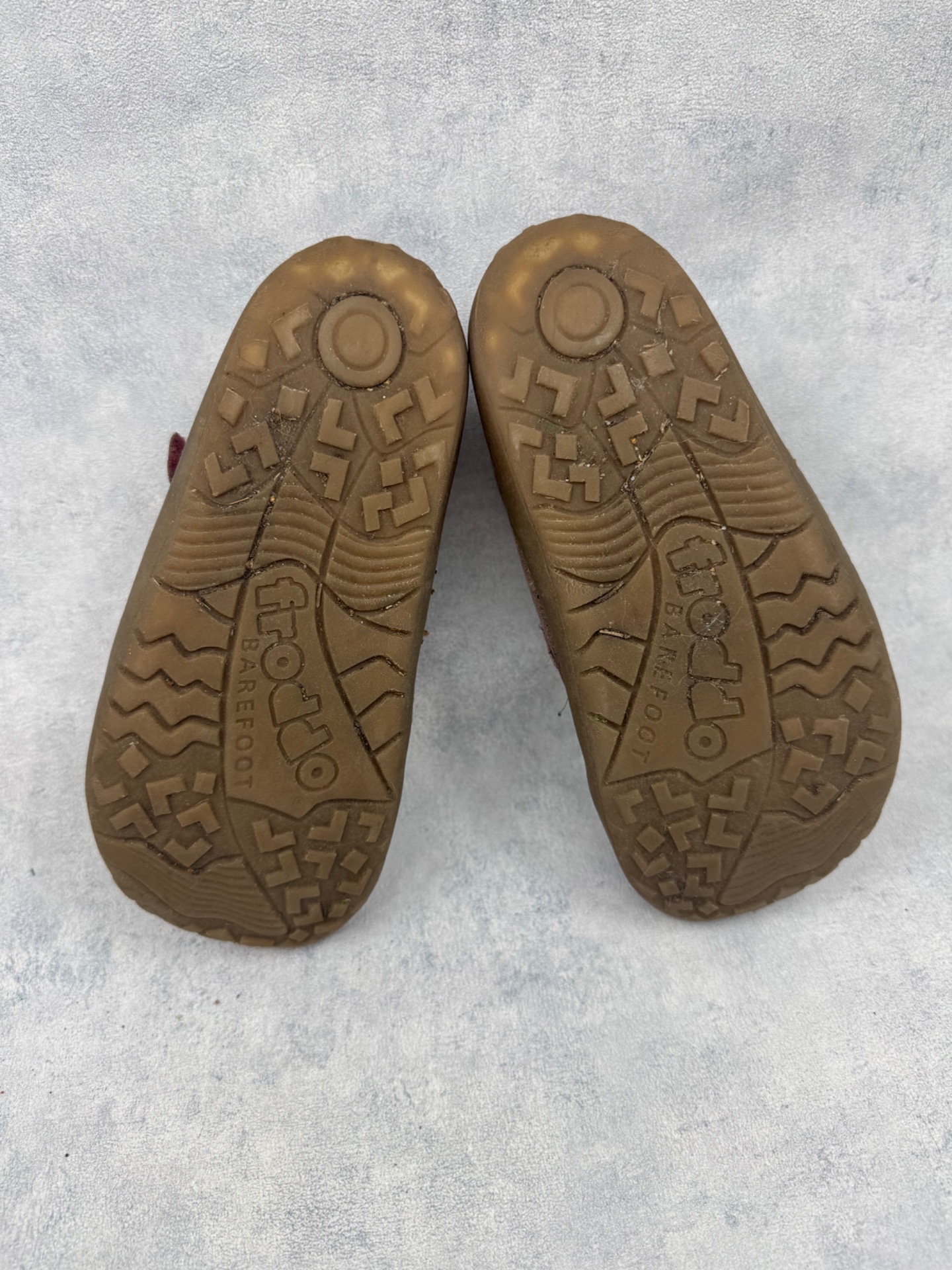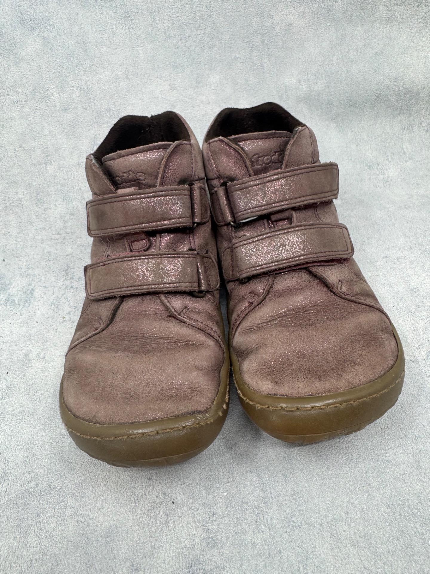 Hyväkuntoiset Froddon paljasjalkakengät. Pientä käytönjälkeä, yleisilme oikein siisti. Pohjissa kantapään kohdalla kulumaa, ei vaikuta käyttöön. Tarrat pitävät hyvin ja vaikkei kengissä ole merkintää vedenpitävyydestä, niissä on vettä hylkivä pinta, testattu vedenpitäviksi juoksevan veden alla. Joustava pohja.