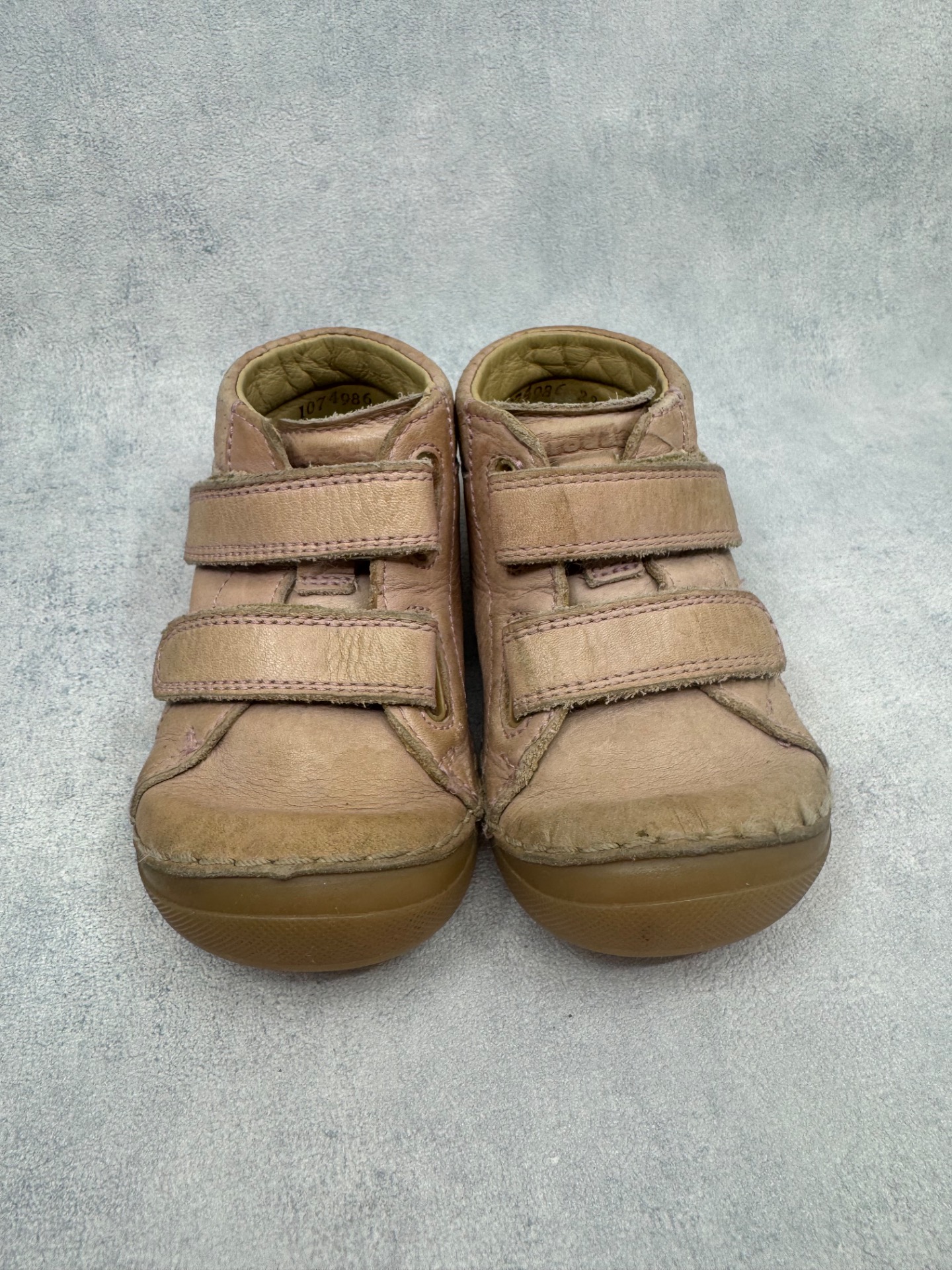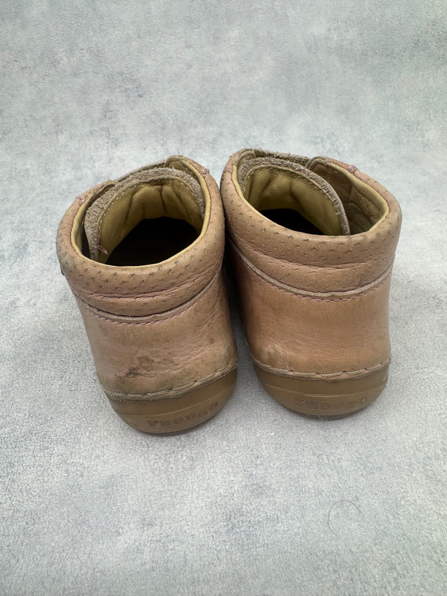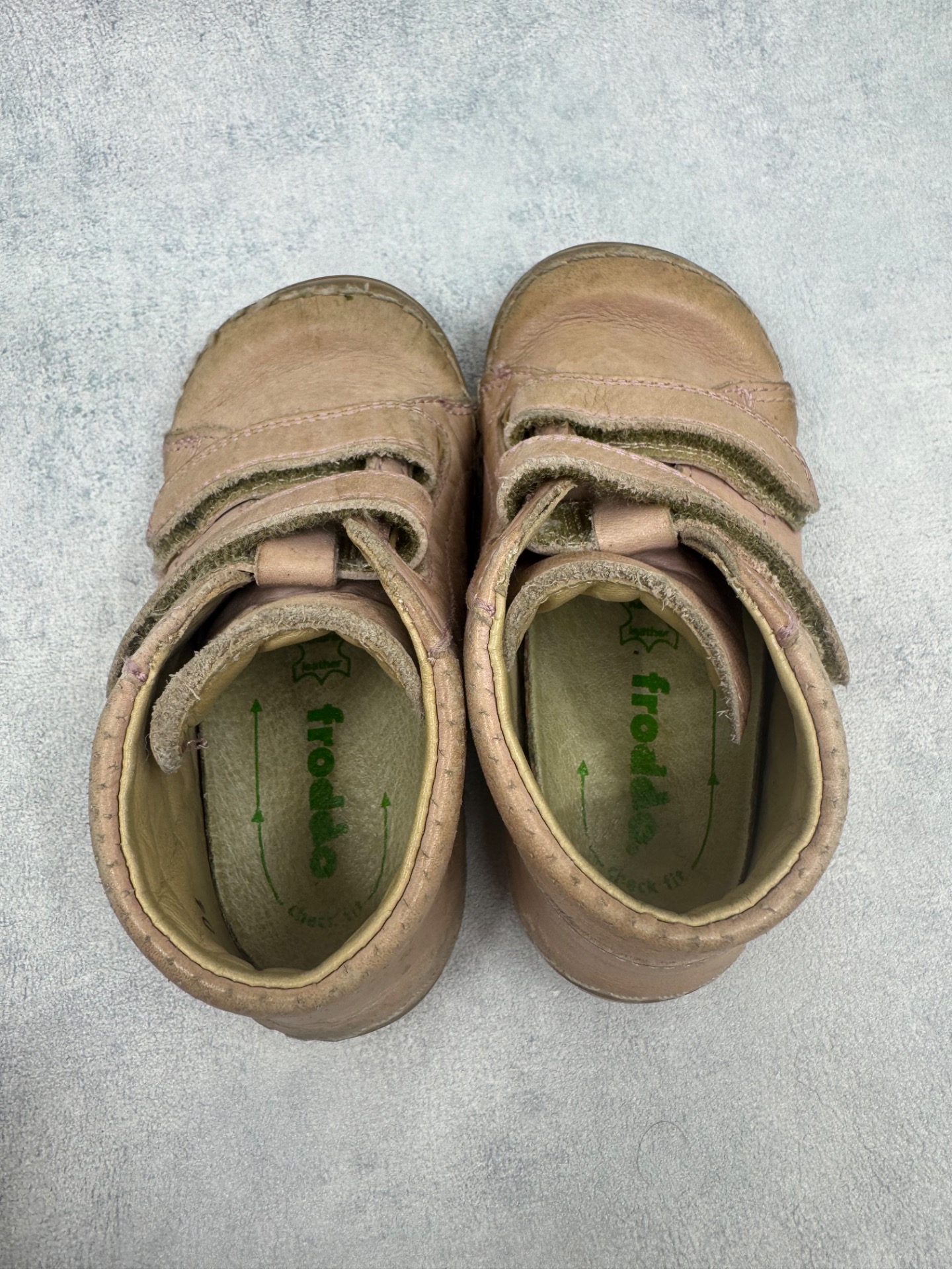 Hyväkuntoiset Froddon paljasjalkakengät. Pinta nahkaa, käytönjälkeä löytyy läheltä tarkastellessa, mutta yleisilmeeltään oikein siistit kengät. Tarrat pitää erinomaisesti. Joustava pohja.