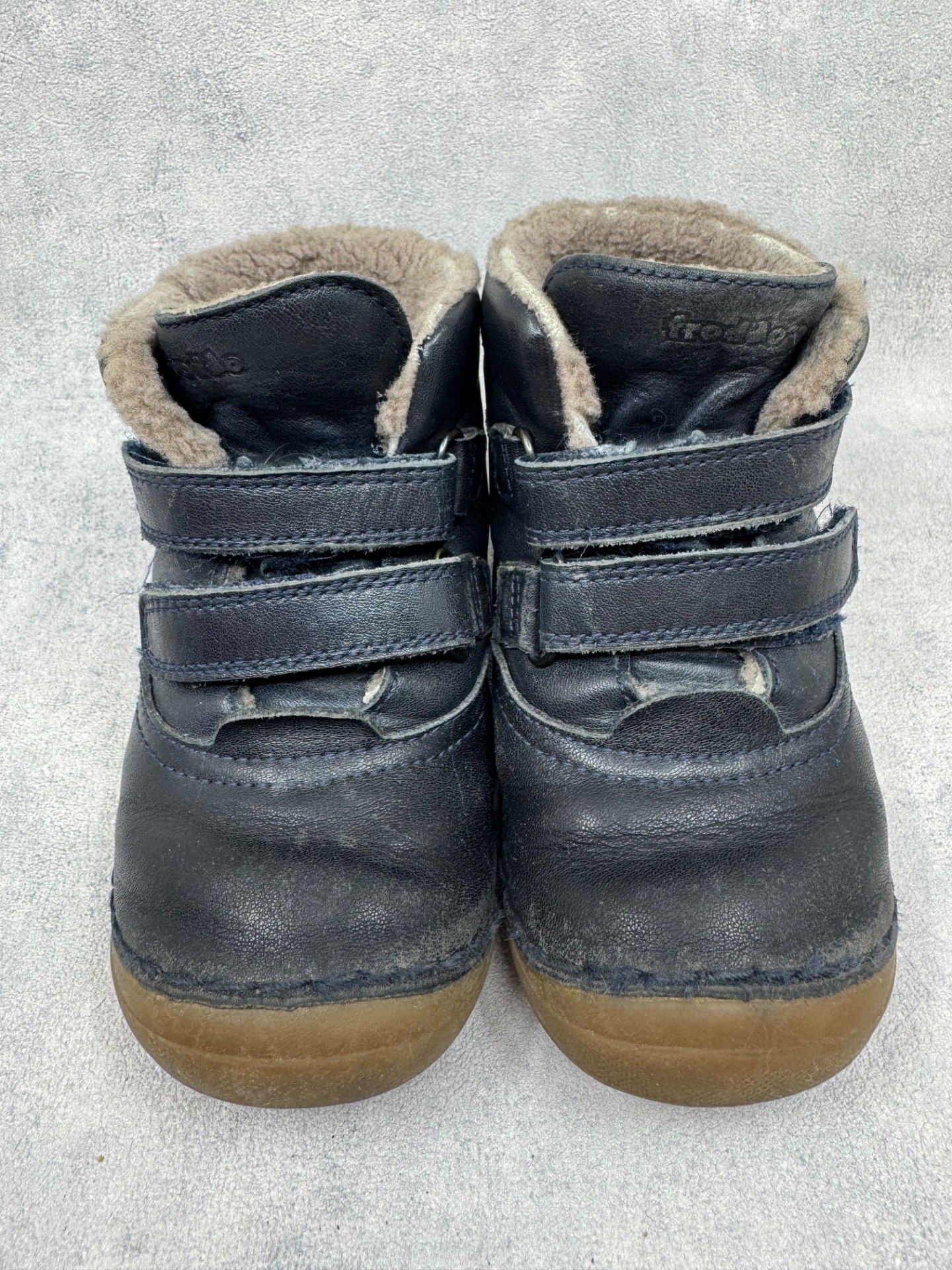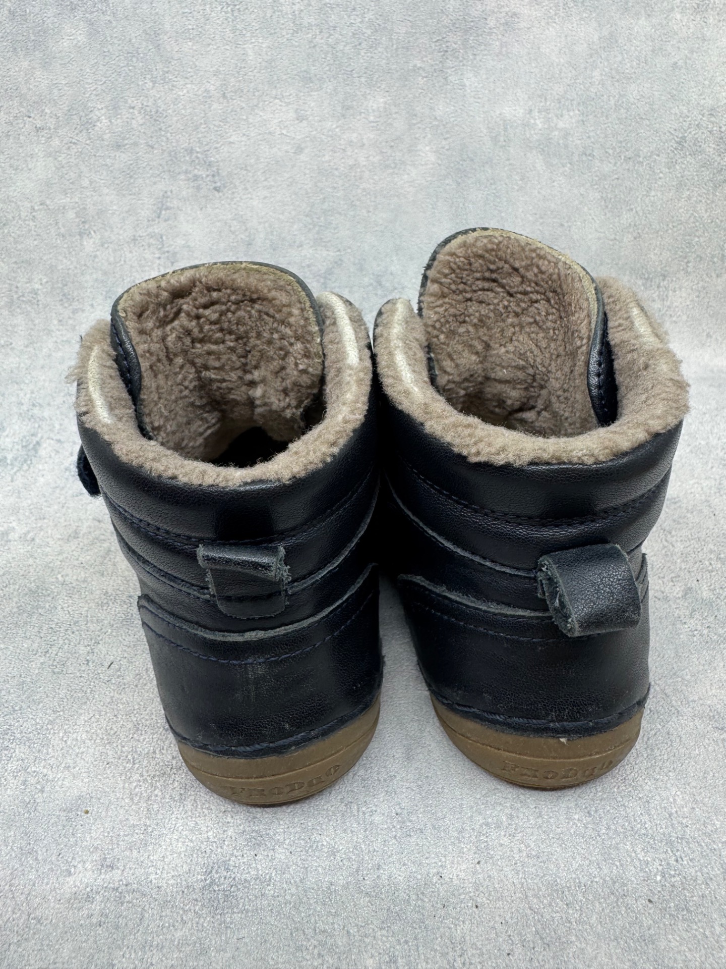 Hyväkuntoiset Froddon paljasjalkakengät. Pinta nahkaa. Käytönjälkeä ja paikoin haalistumaa, yleisilme siisti. Sisällä ohut vuori, kengät sopivat mainiosti niin välikauteen kuin talven leudoille päiville. Tarrat pitävät erinomaisesti ja vaikka kengissä ei ole merkintää vedenpitävyydestä, nahka hylkii luontaisesti vettä erinomaisesti ja kengät onkin testattu juoksevan veden alla vedenpitäviksi. Mukaan erilliset, lämpimät lampaanvillaiset pohjalliset. Kenkiä voi käyttää pohjallisten kanssa tai ilman.