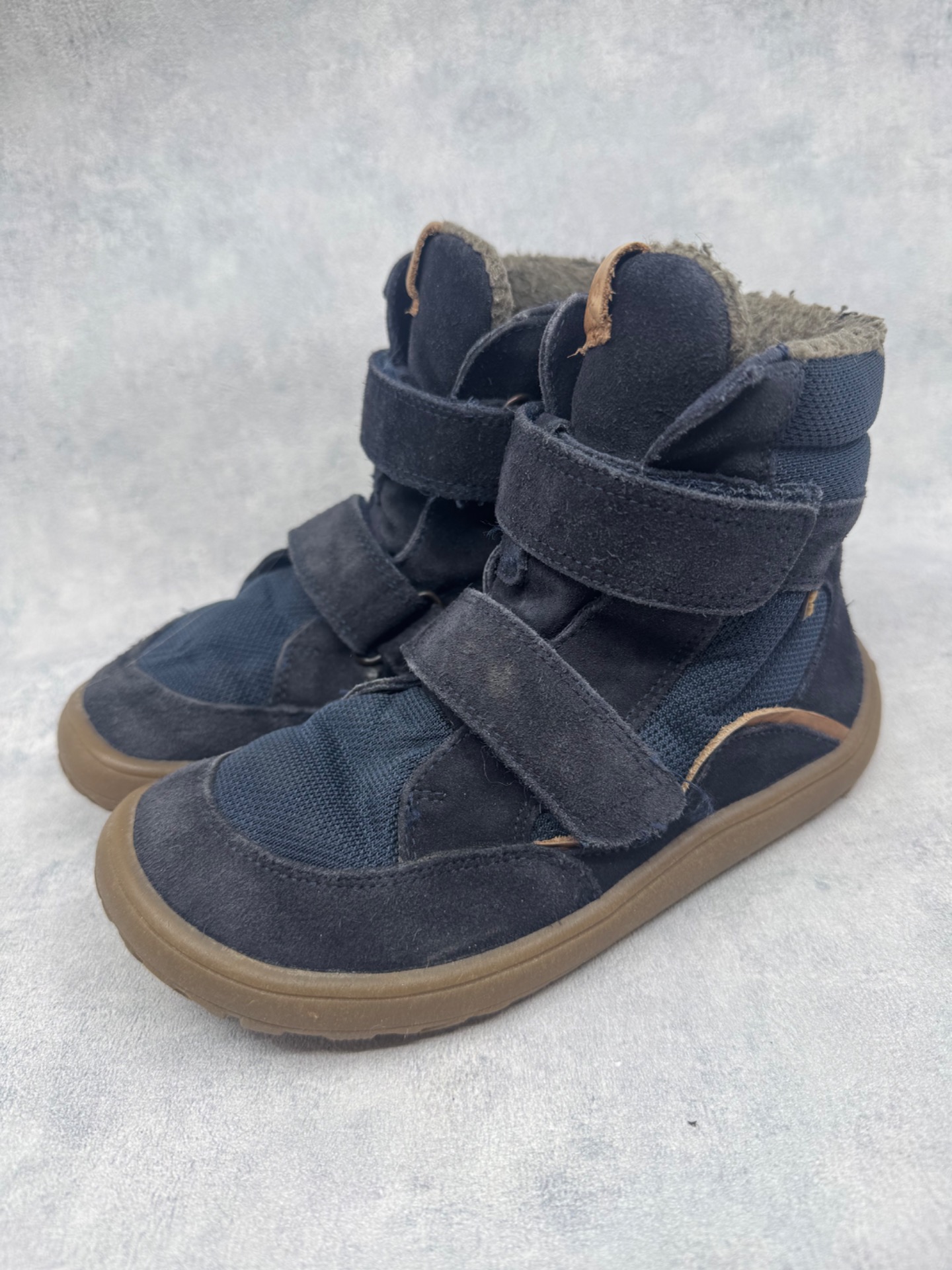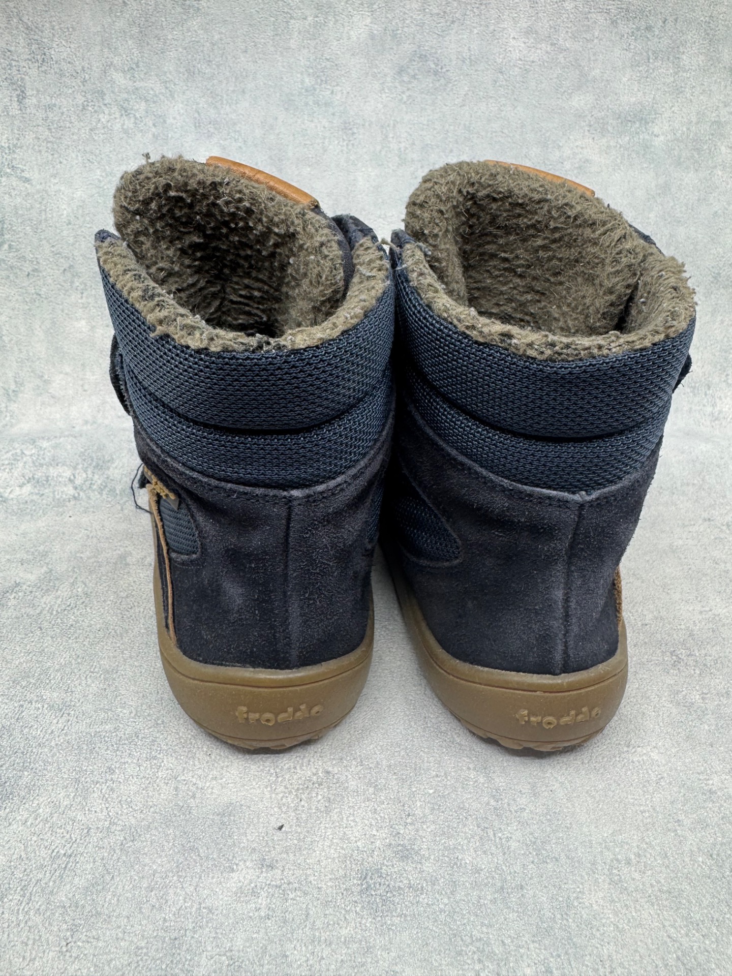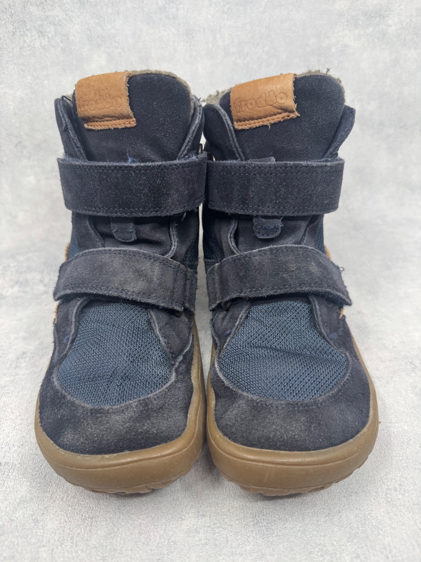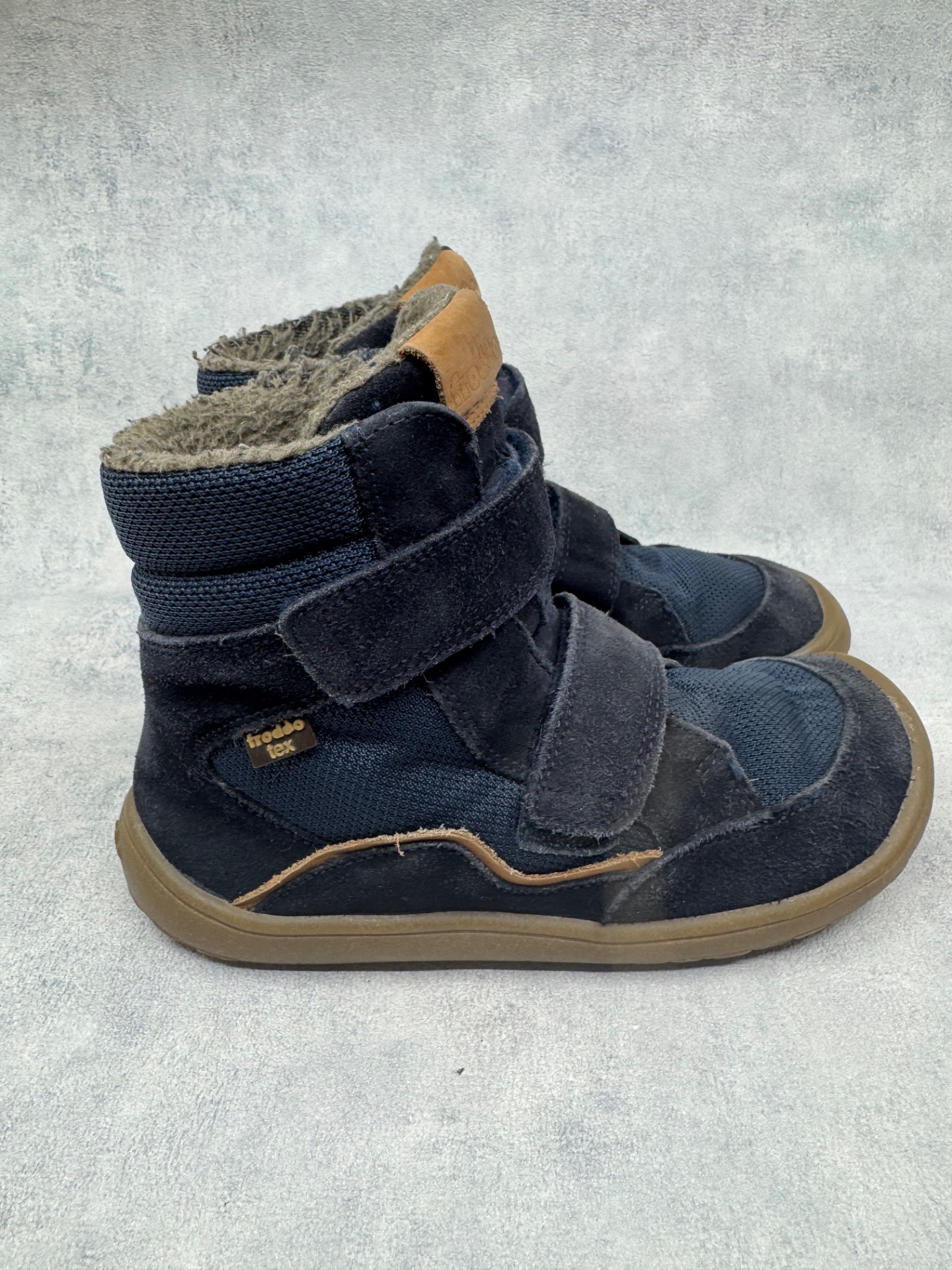Hyväkuntoiset Froddon paljasjalkakengät. Pientä käytönjälkeä läheltä tarkastellessa, yleisilme siisti. Vuori uudesta painunut, mutta siisti, kengät sopivat mainiosti niin välikauteen kuin leudoille talvipäiville. Todella joustava pohja. Tarrat pitävät hyvin ja kengät on testattu juoksevan veden alla vedenpitäviksi.