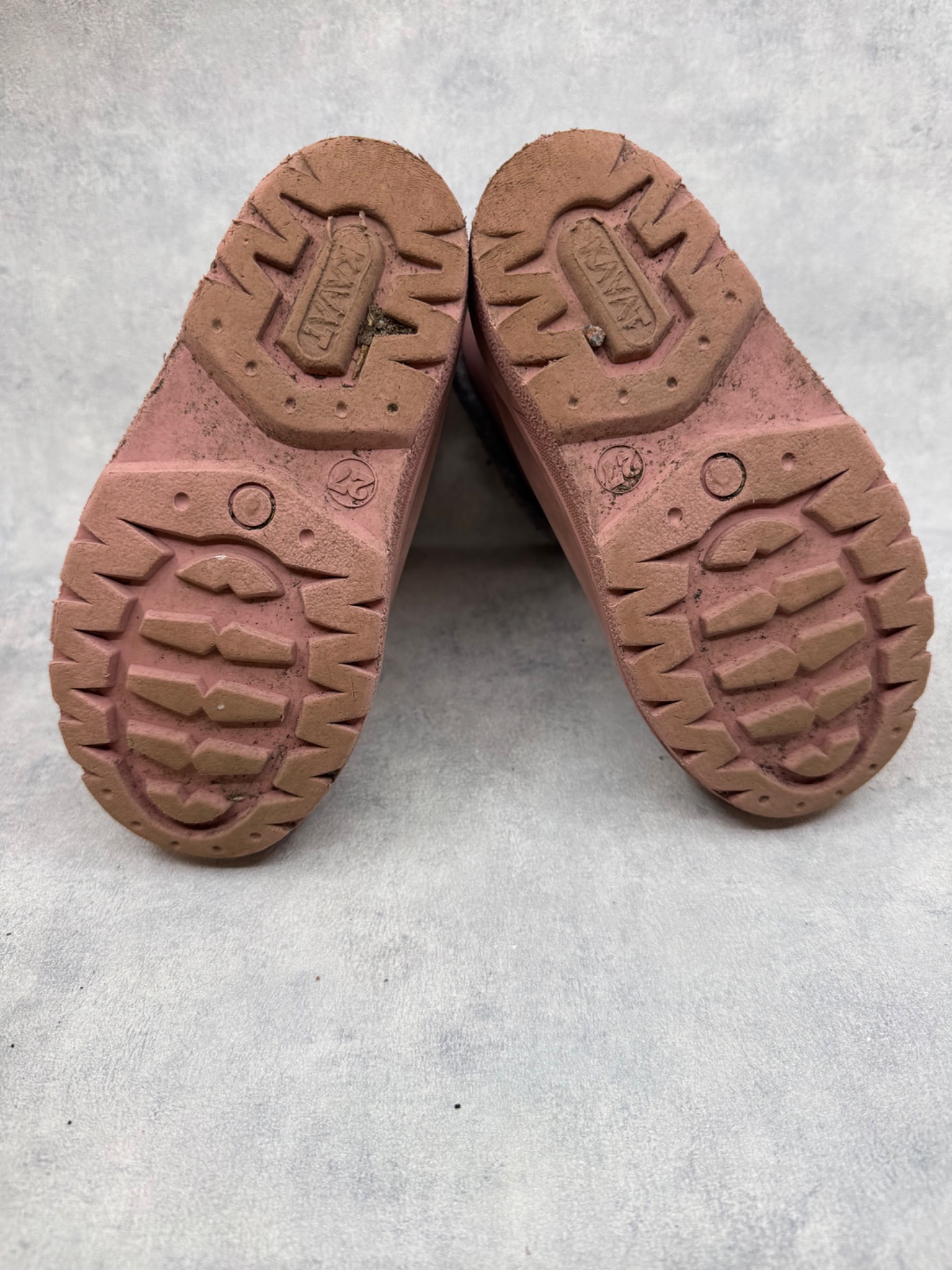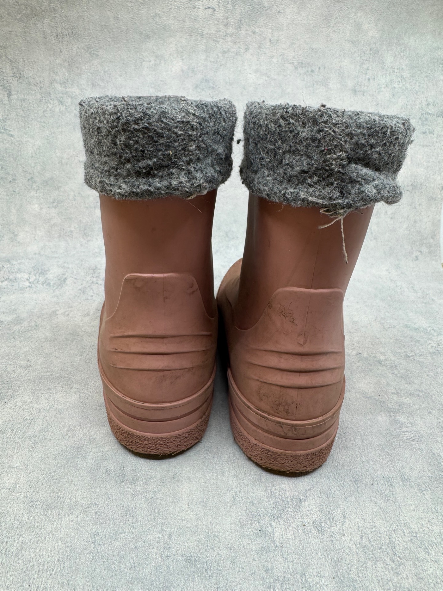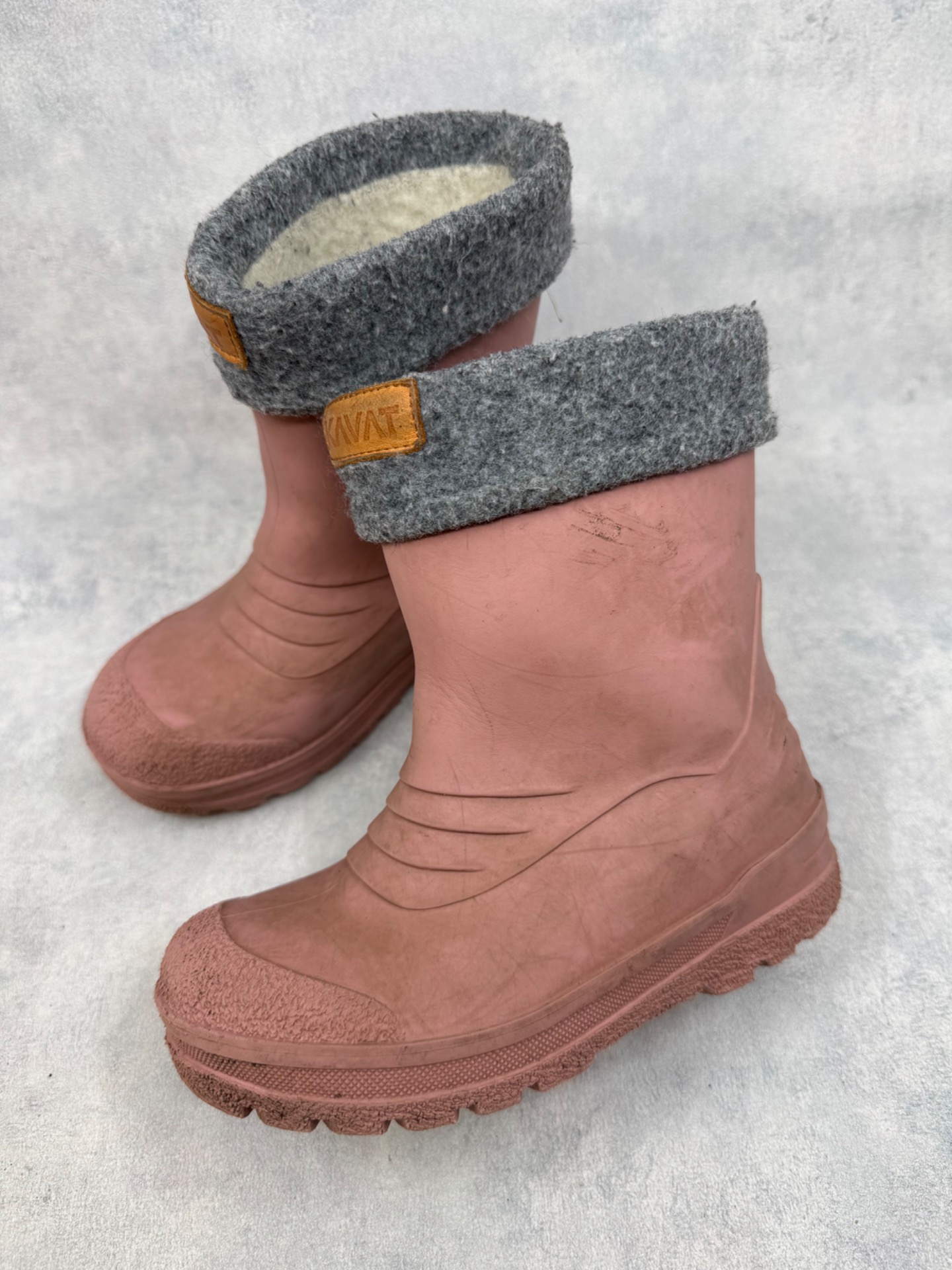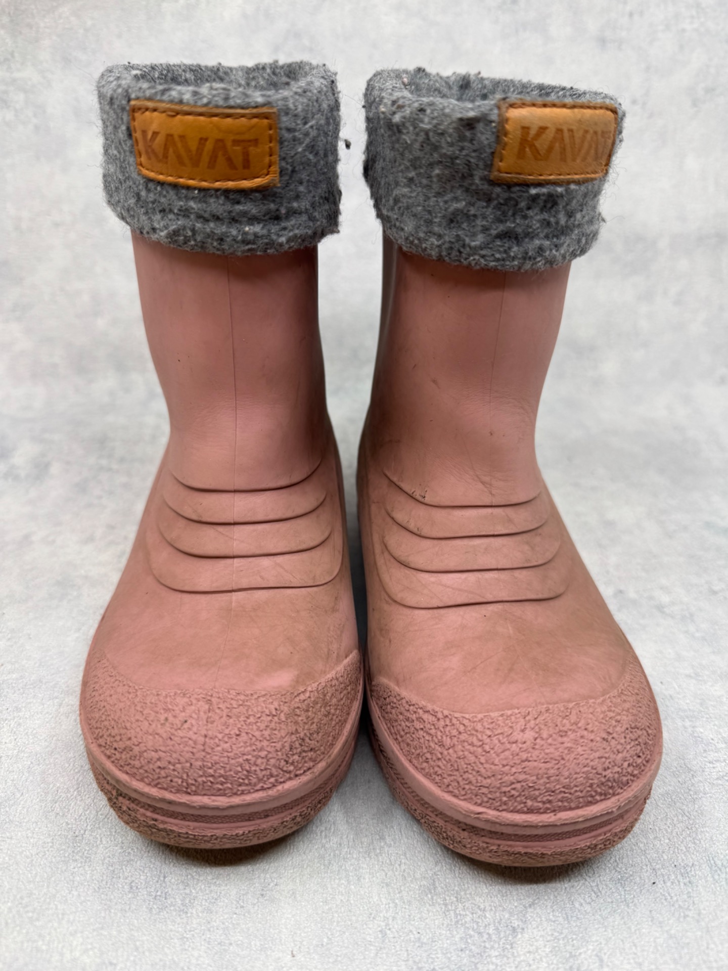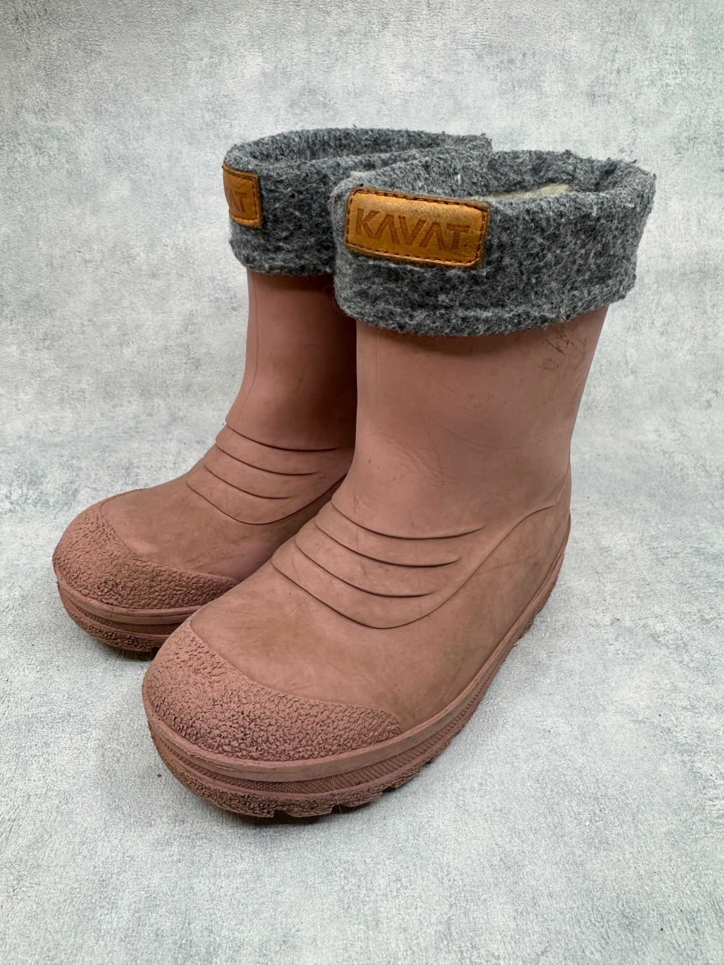 Hyväkuntoiset vaaleanpunaiset kumisaappaat irroitettavalla vuorella. Lämpövuori erinomaisessa kunnossa. Käyttölikaa/tummenntumaa pinnassa. Yleisilme siisti. Testattu vedenpitäviksi.