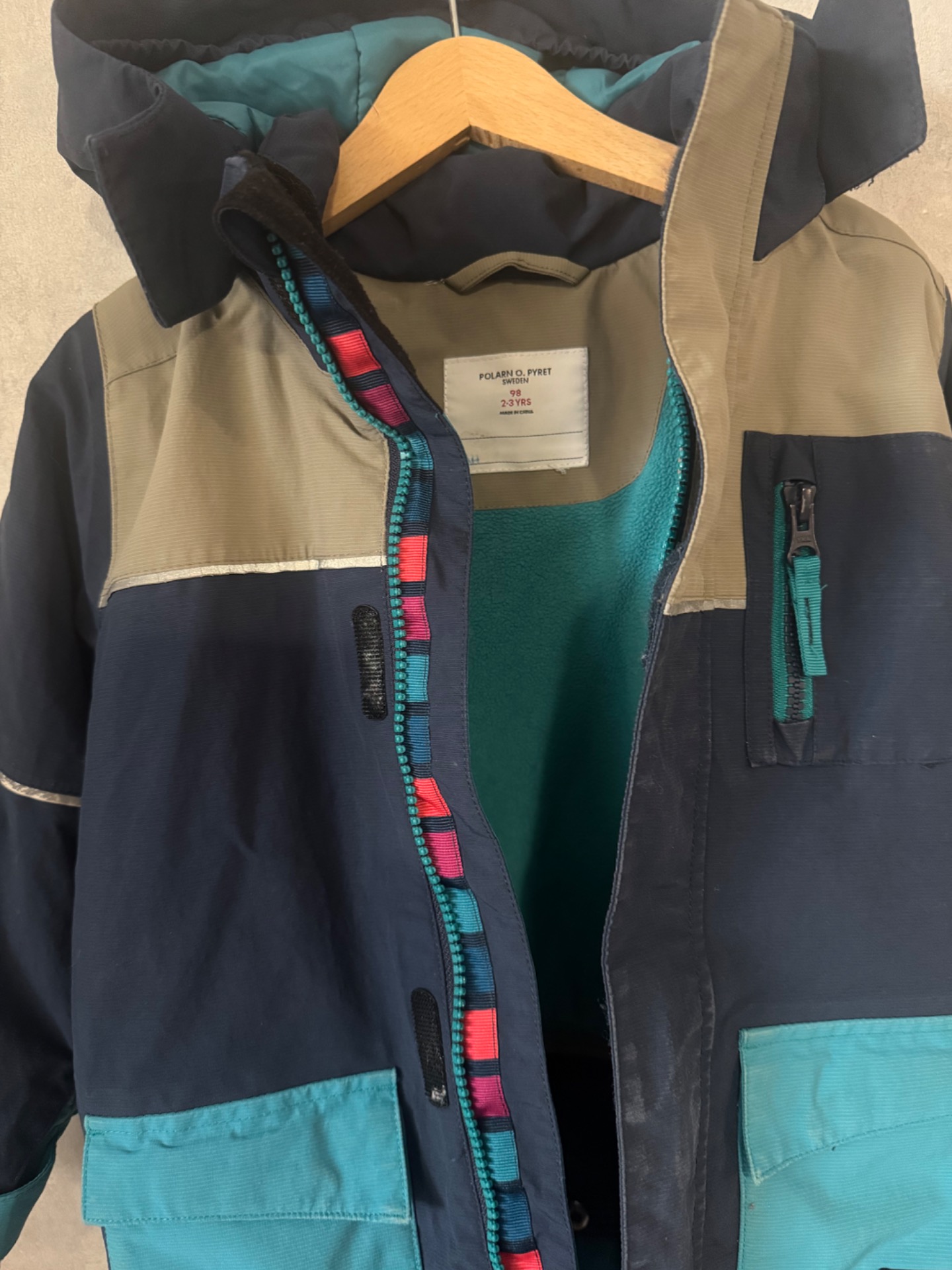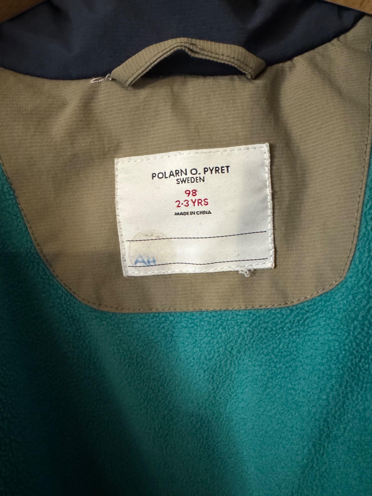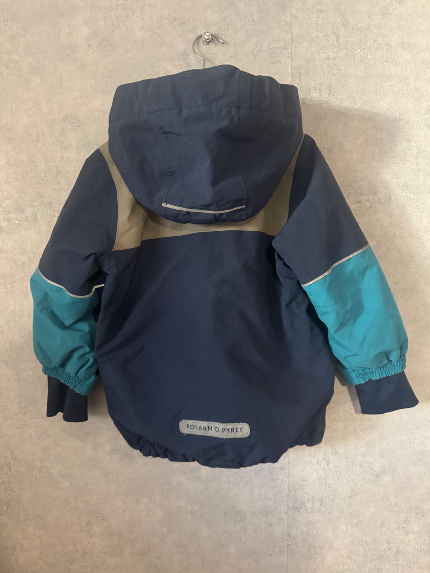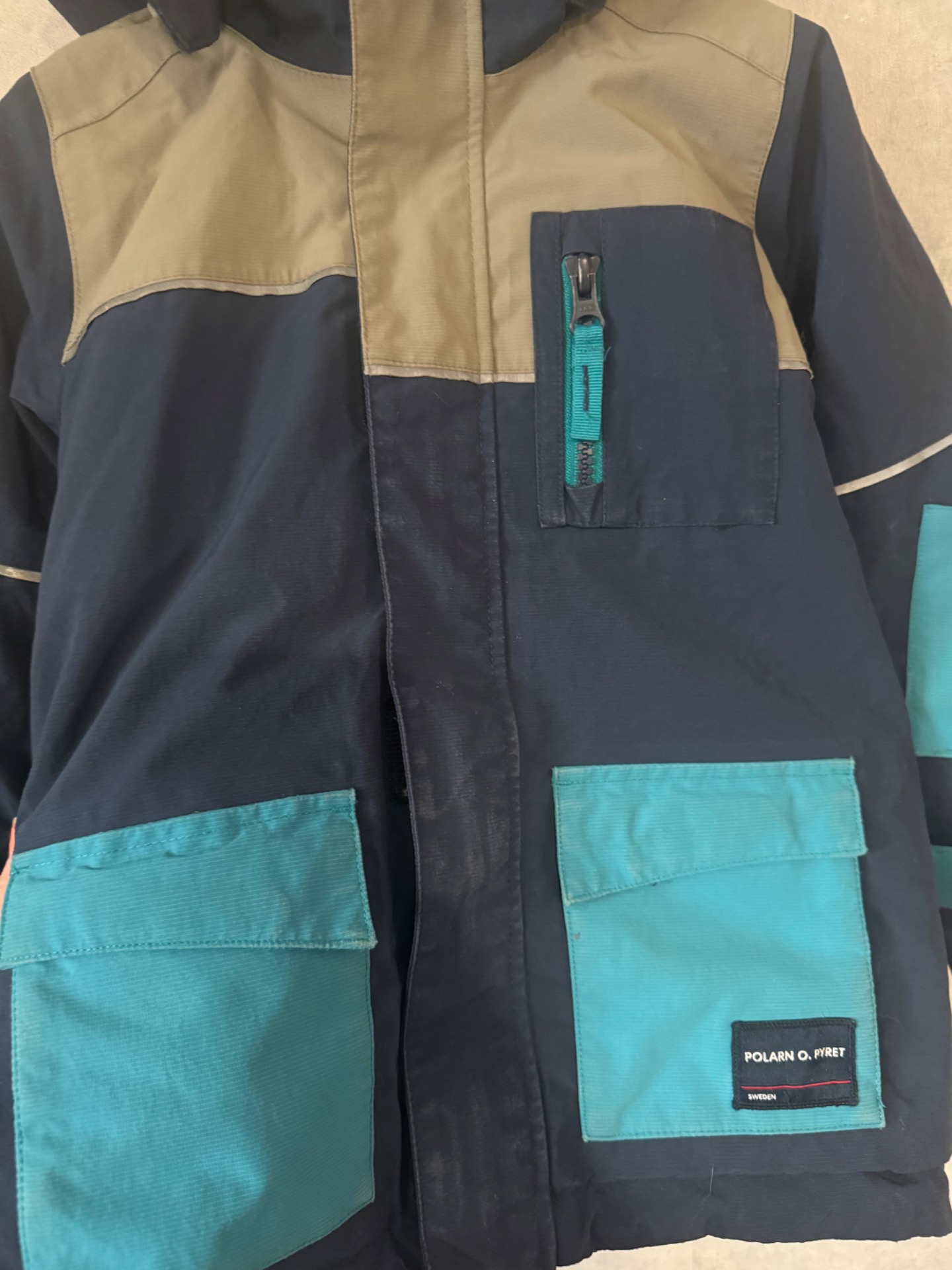 Hyväkuntoinen Polarn O.Pyret toppatakki lämpimällä fleecevuorella. Vedenpitävät ominaisuudet tallella, testattu. Kangas on vettähylkivää. Takin etuosassa on haalistumaa, kts. kuva, mutta muutoin oikein siisti ja hyvä kunto, uudenkarhea ja varmasti lämmin.