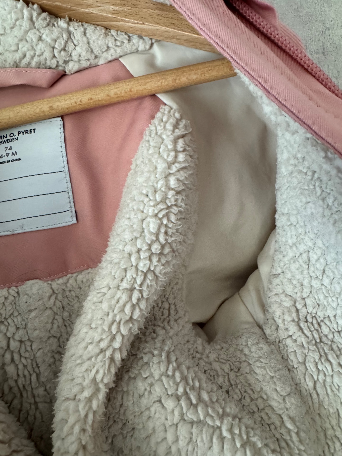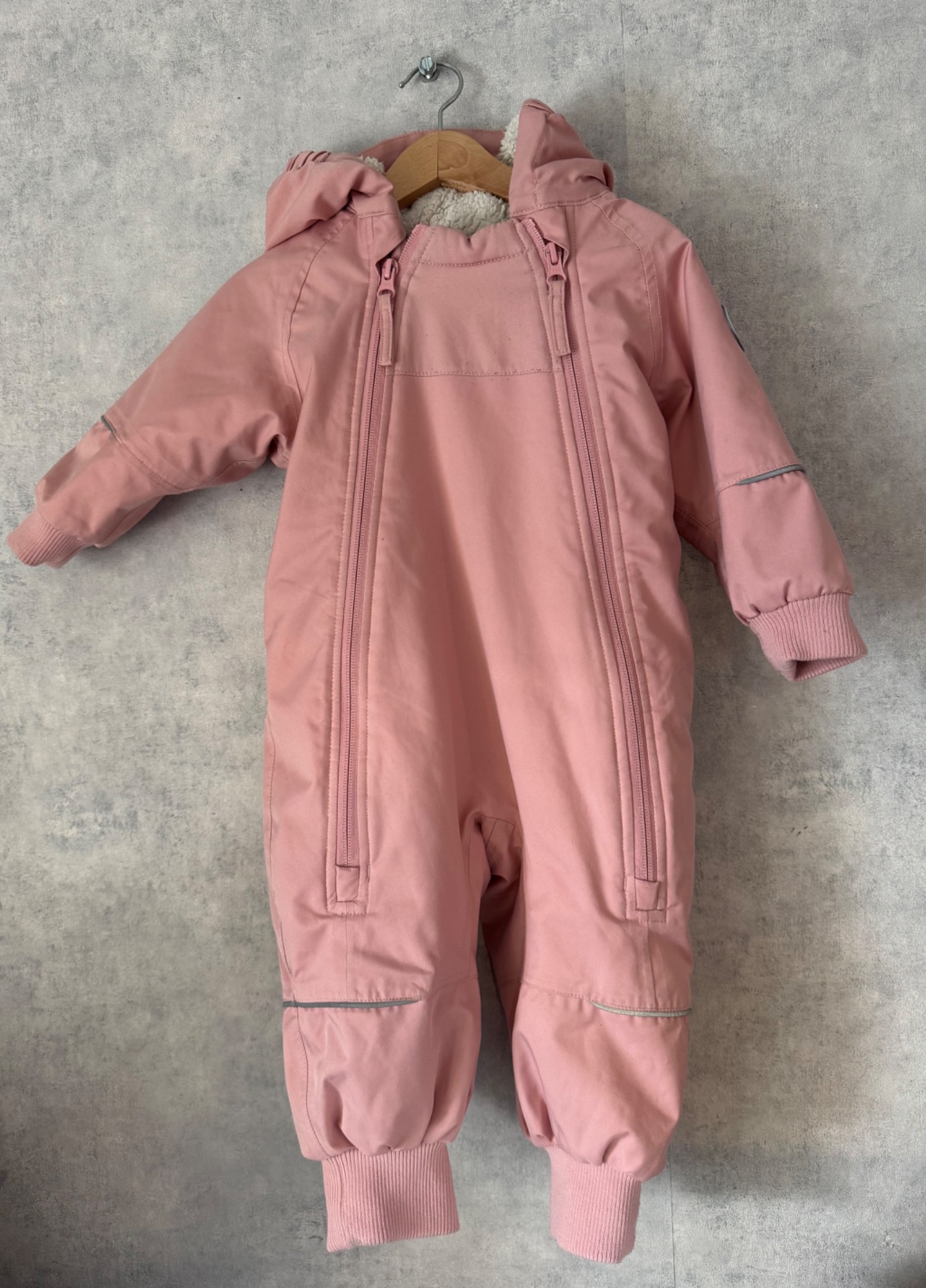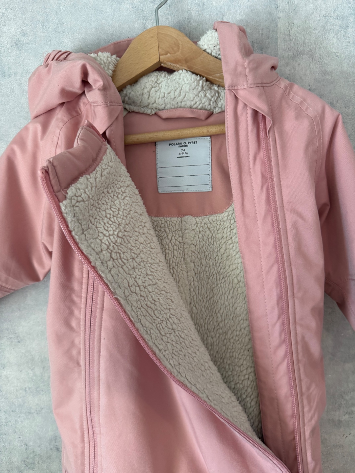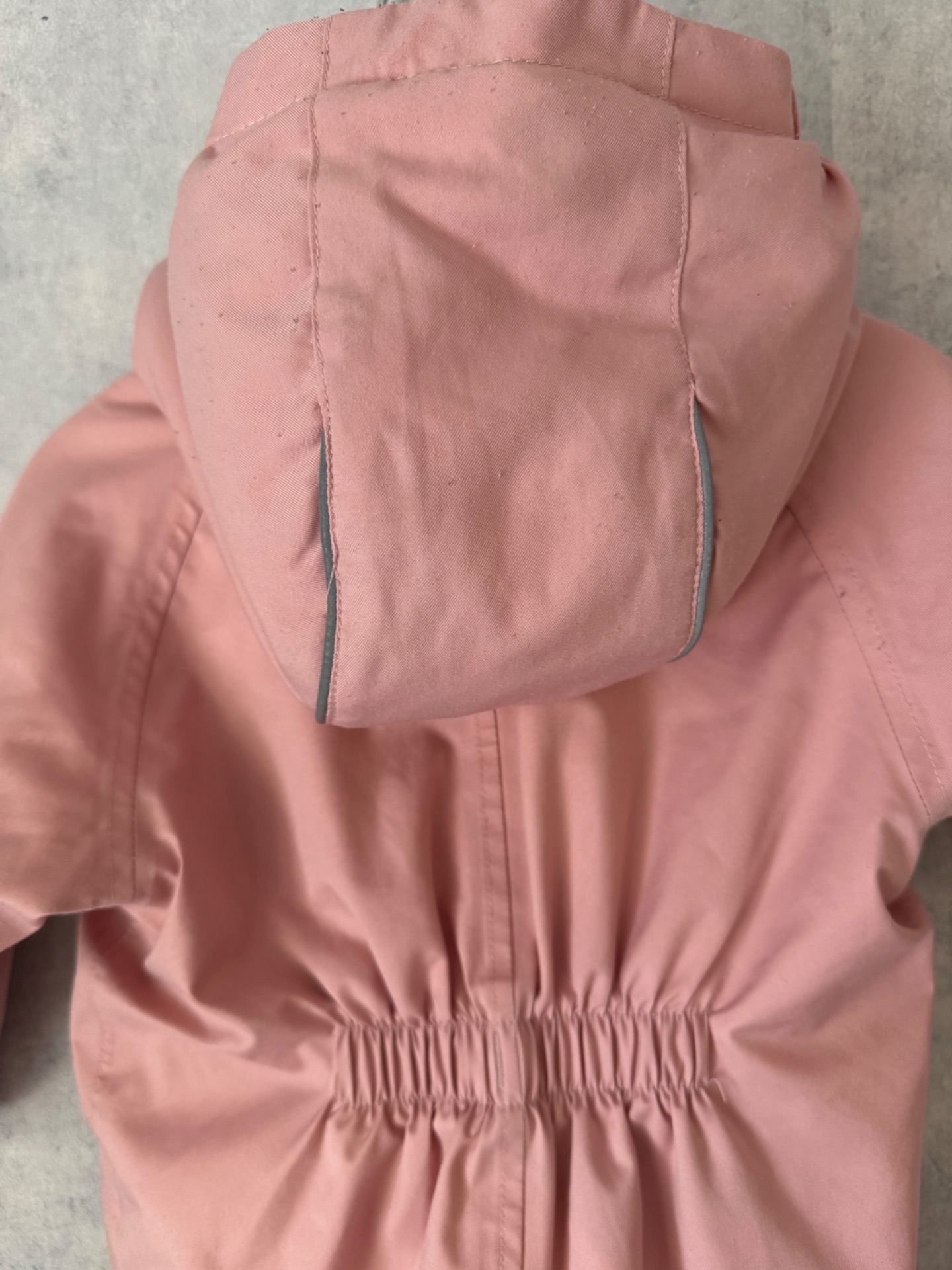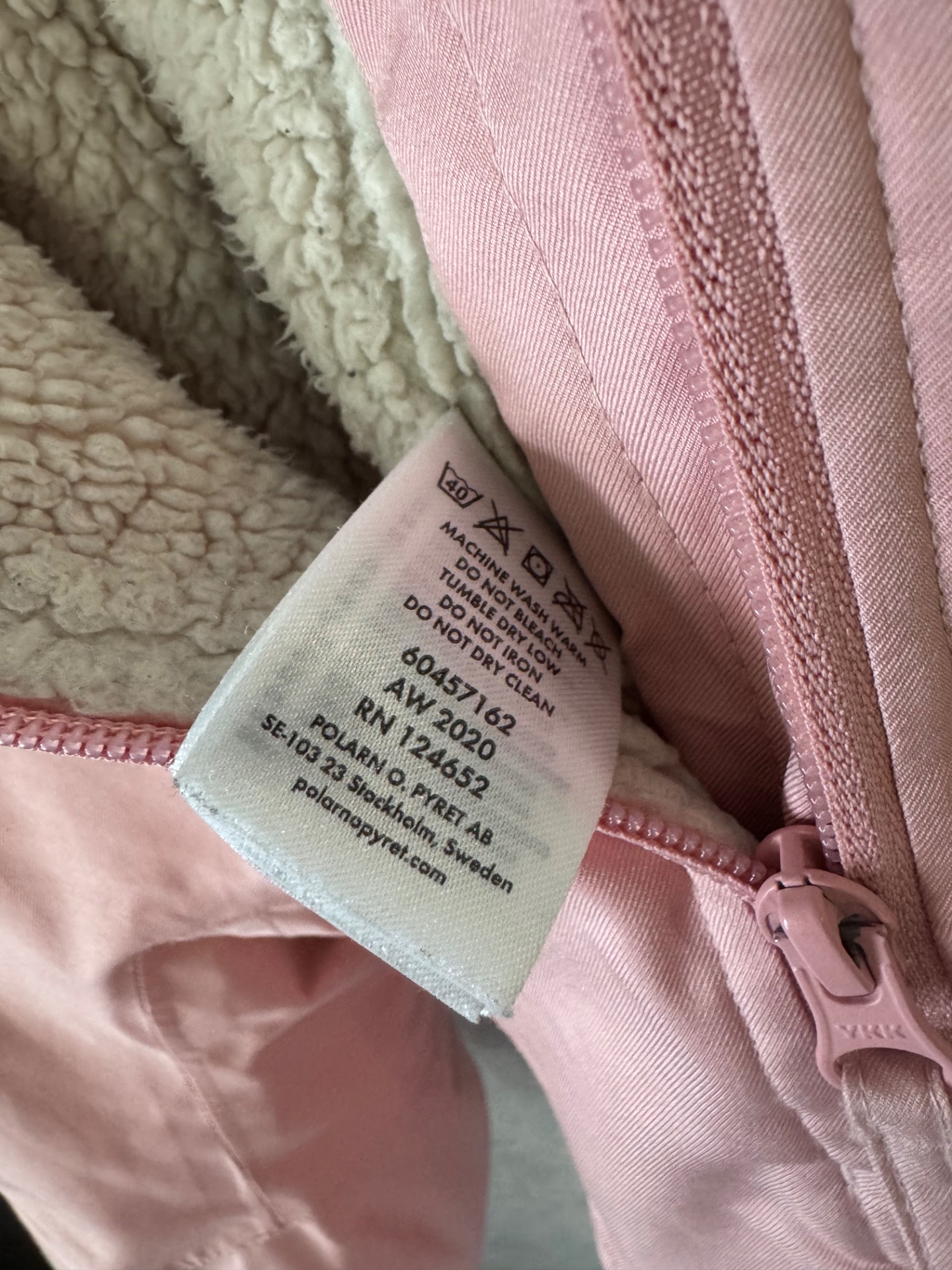 Hyväkuntoinen vaaleanpunainen välikausihaalari. Sisällä pehmeä ja lämmin vuori, joten tämä haalari sopii hyvin myös kylmempiin syyspäiviin. Haalarissa ei ole kulumaa, vain aavistus käytönjälkeä läheltä tarkastellessa. Väri vastaa oikeaa kauempaa otetuissa kuvissa, lähikuvissa haalistuu. Hajusteeton.