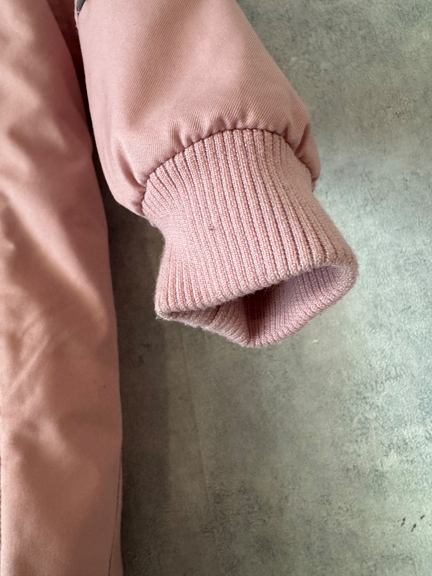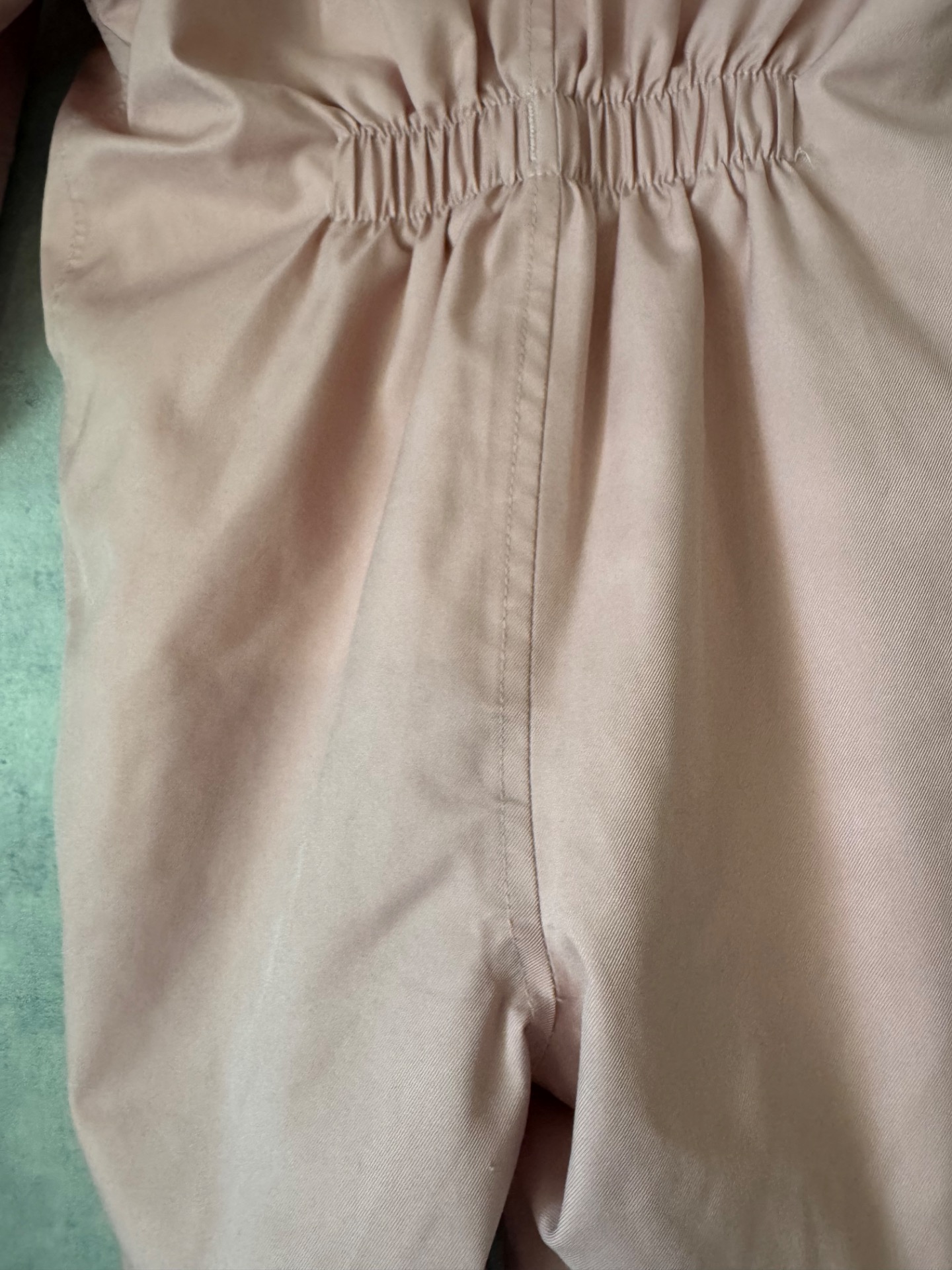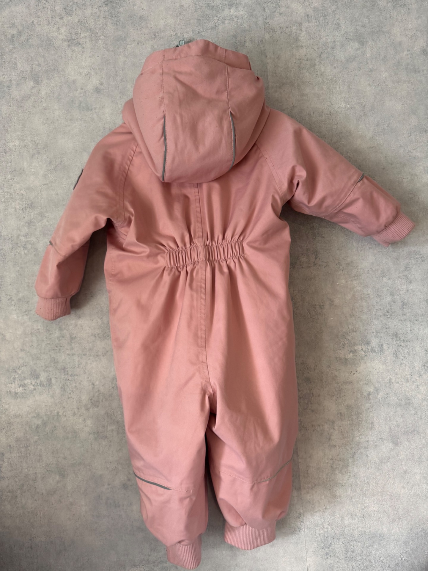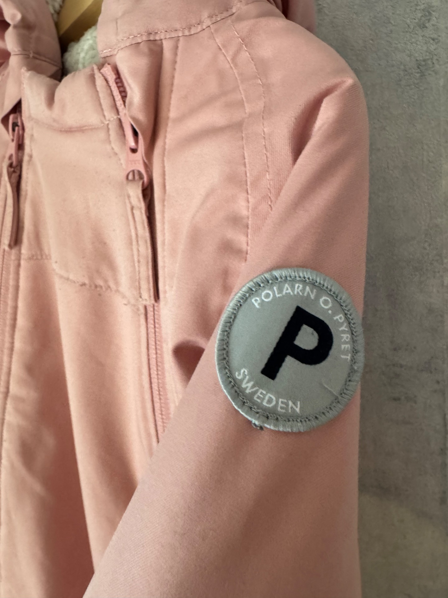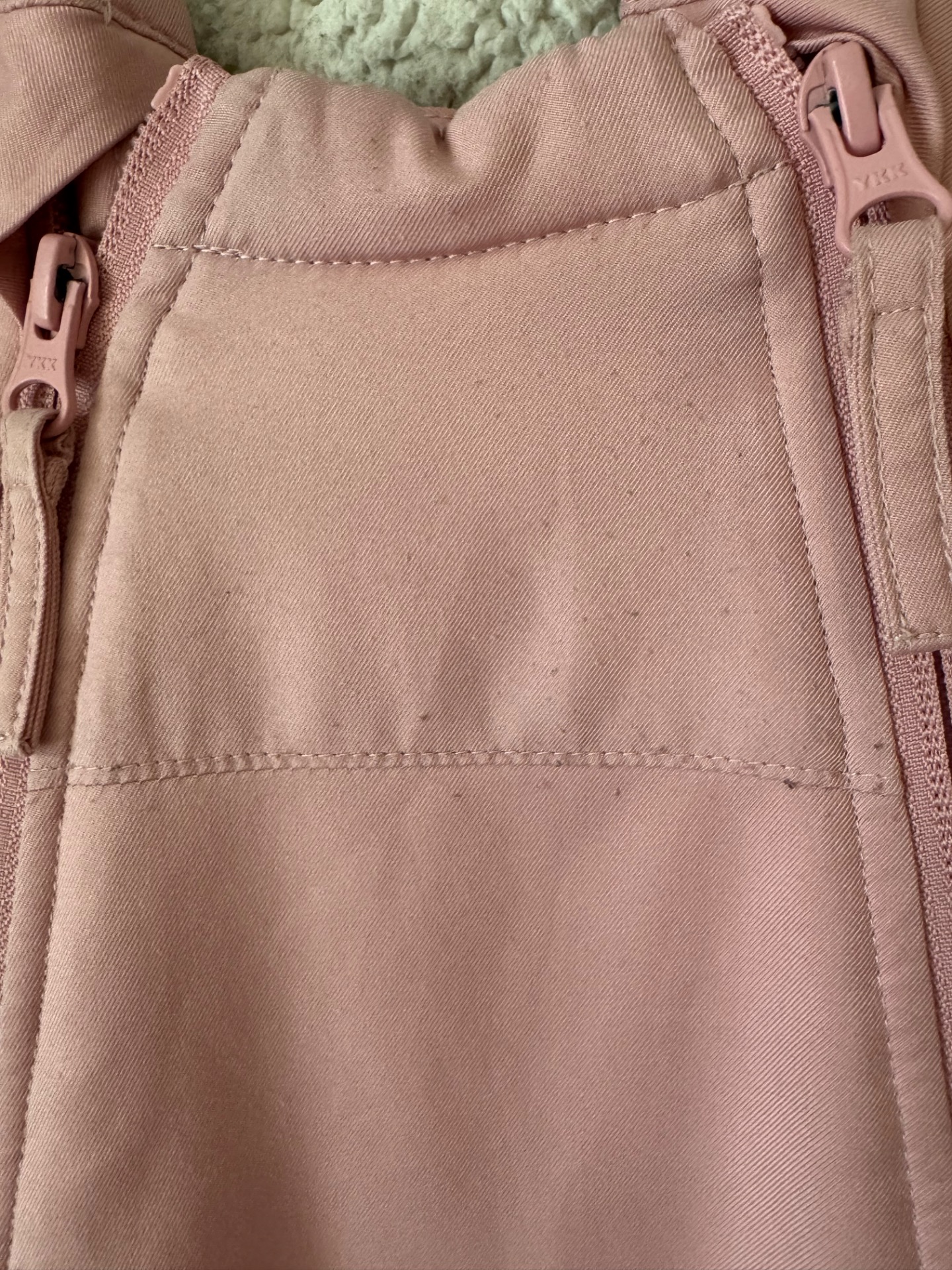 Hyväkuntoinen vaaleanpunainen välikausihaalari. Sisällä pehmeä ja lämmin vuori, joten tämä haalari sopii hyvin myös kylmempiin syyspäiviin. Haalarissa ei ole kulumaa, vain aavistus käytönjälkeä läheltä tarkastellessa. Väri vastaa oikeaa kauempaa otetuissa kuvissa, lähikuvissa haalistuu. Hajusteeton.