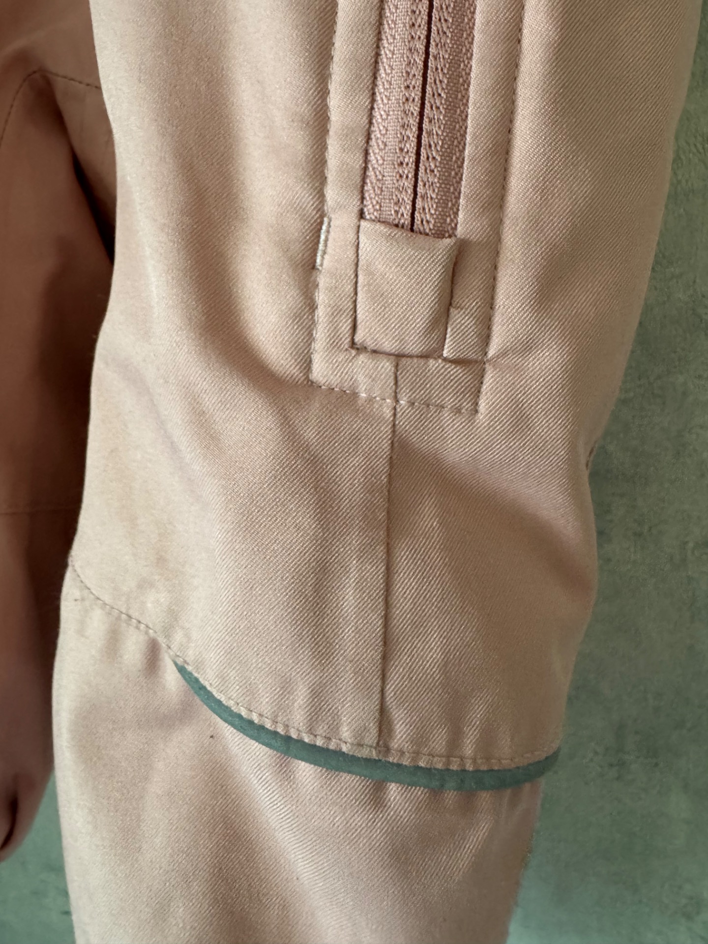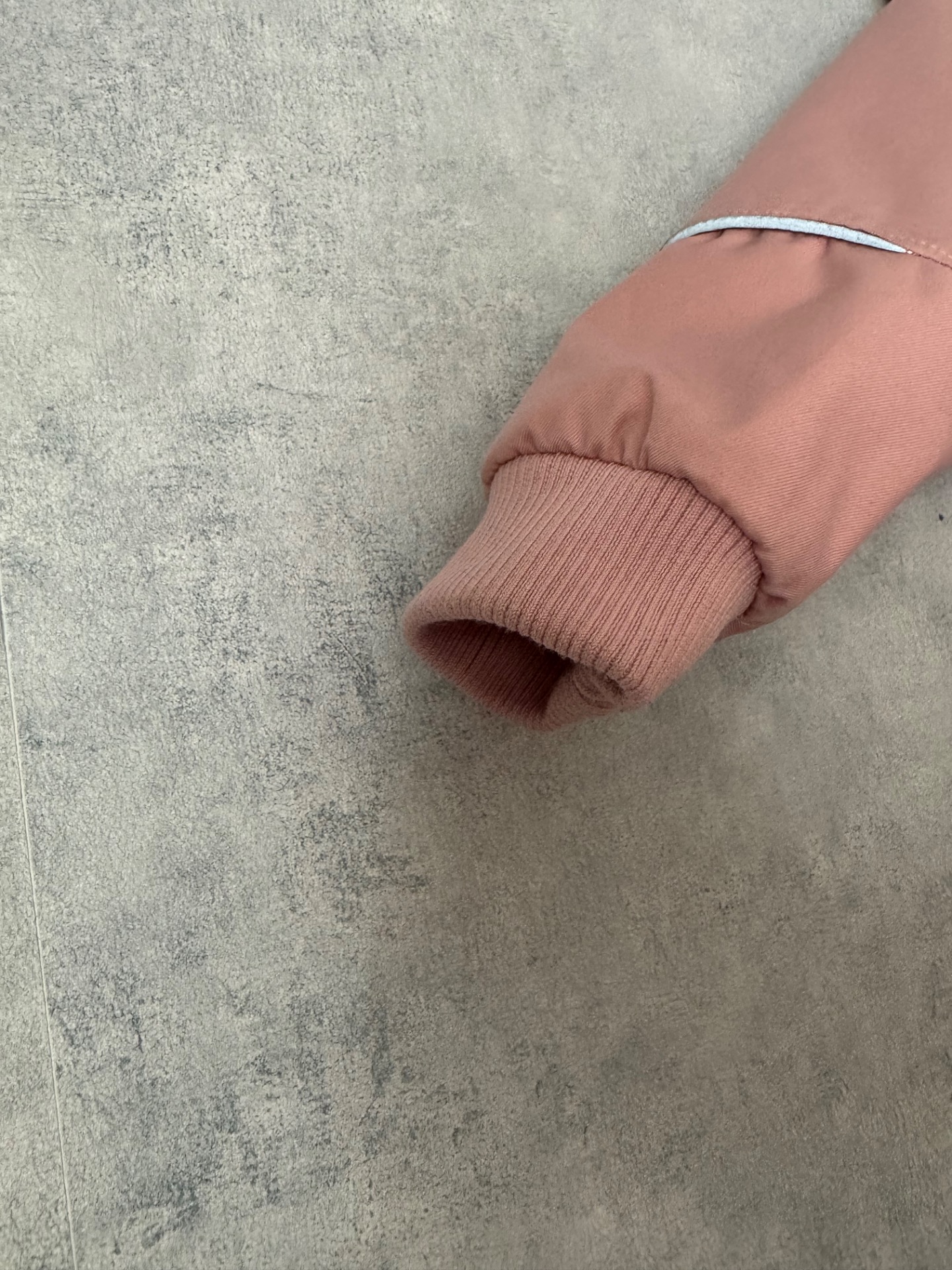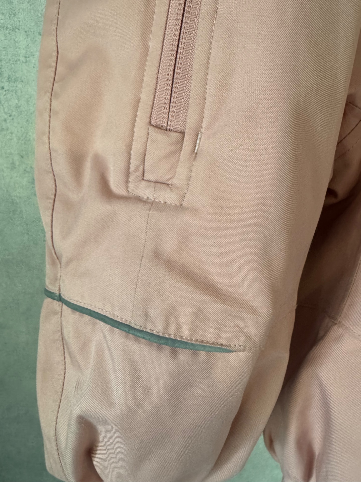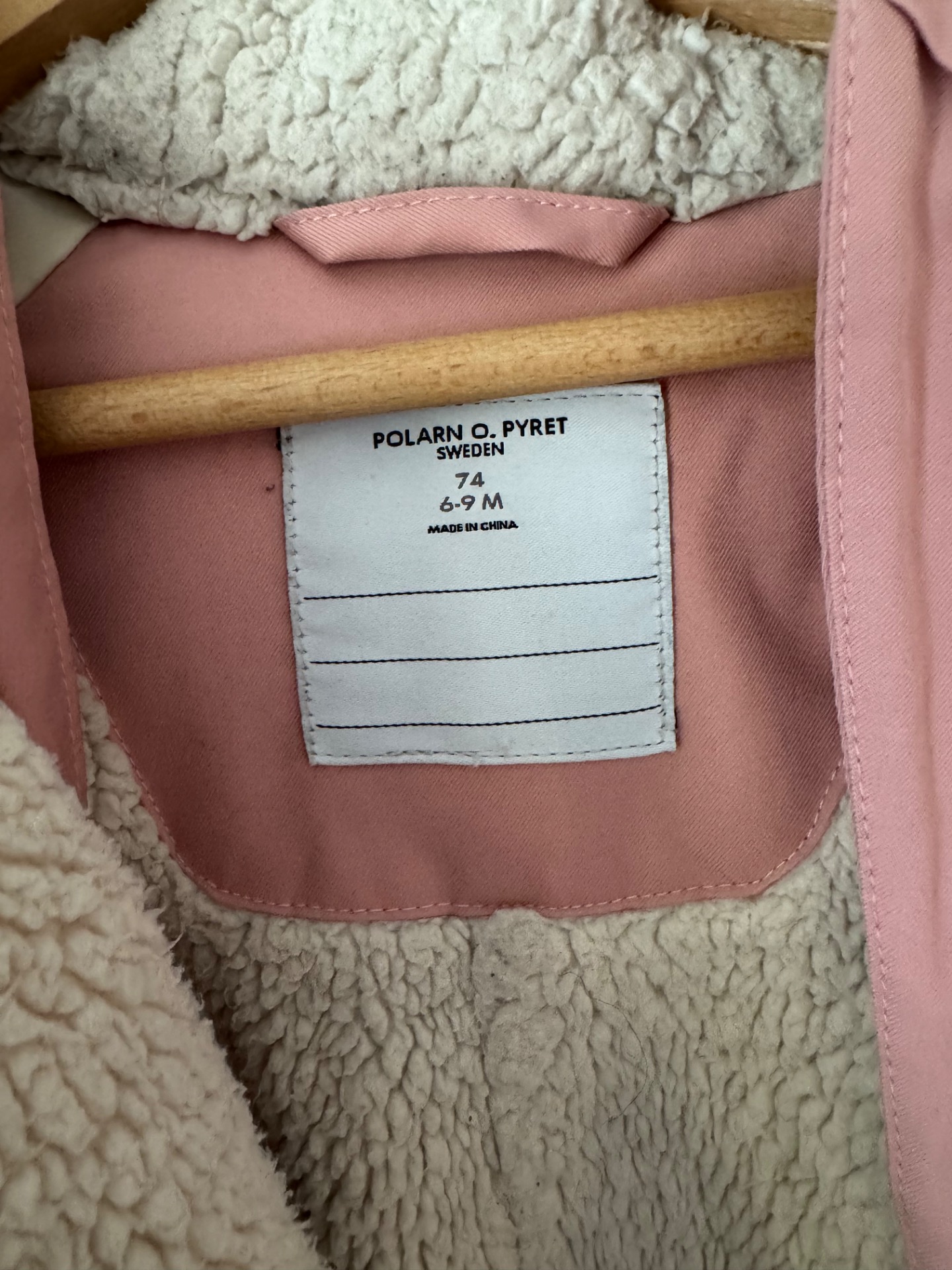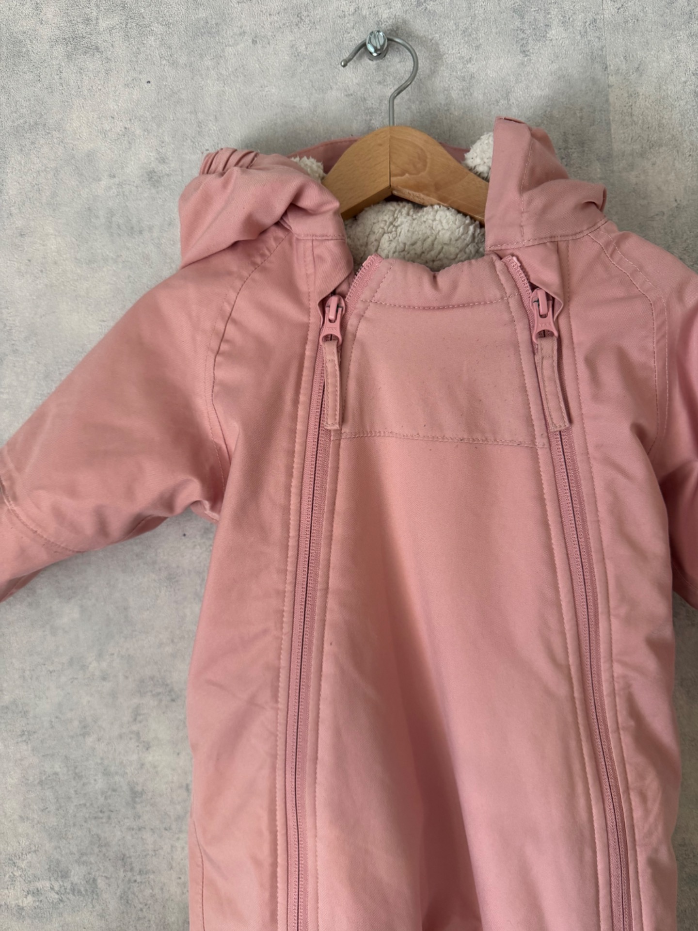 Hyväkuntoinen vaaleanpunainen välikausihaalari. Sisällä pehmeä ja lämmin vuori, joten tämä haalari sopii hyvin myös kylmempiin syyspäiviin. Haalarissa ei ole kulumaa, vain aavistus käytönjälkeä läheltä tarkastellessa. Väri vastaa oikeaa kauempaa otetuissa kuvissa, lähikuvissa haalistuu. Hajusteeton.