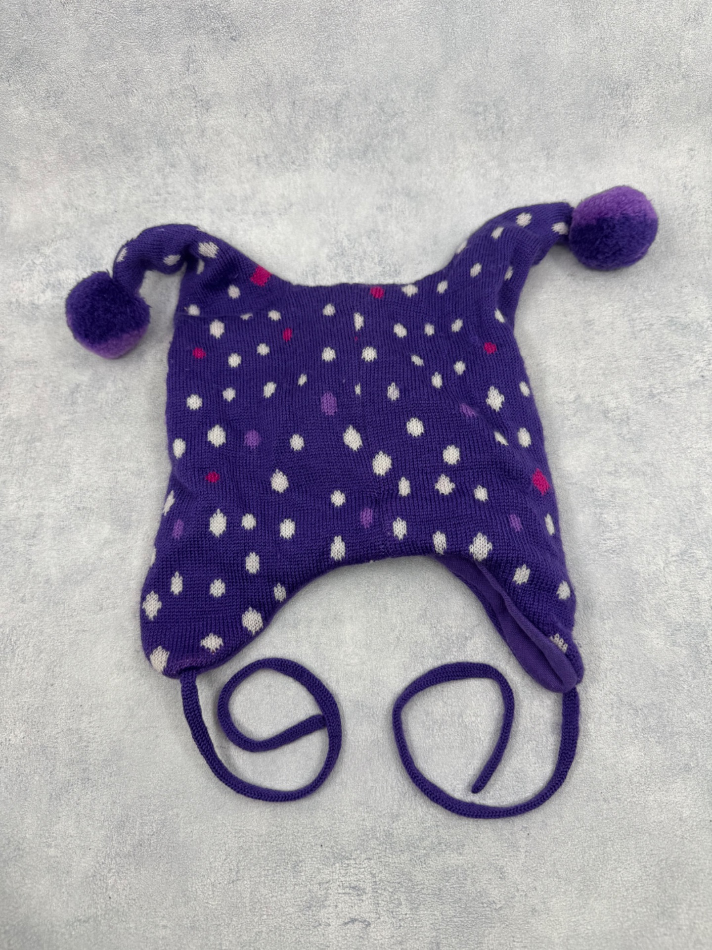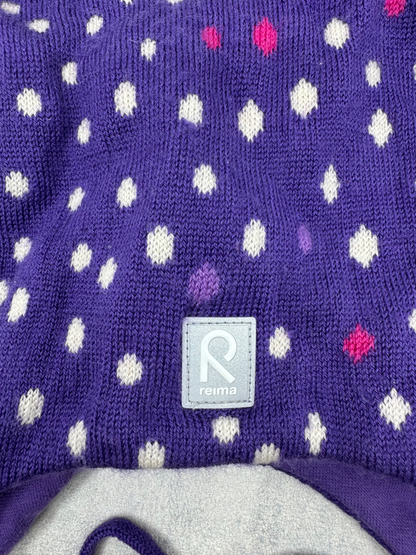 Hyväkuntoinen, erittäin siisti Reiman lämmin talvipipo. Päällinen merinovillaa ja vuori puuvillaa. Hajusteeton. Väri violetti, jossa valkoisia, pinkkejä ja vaaleanvioletteja palloja.