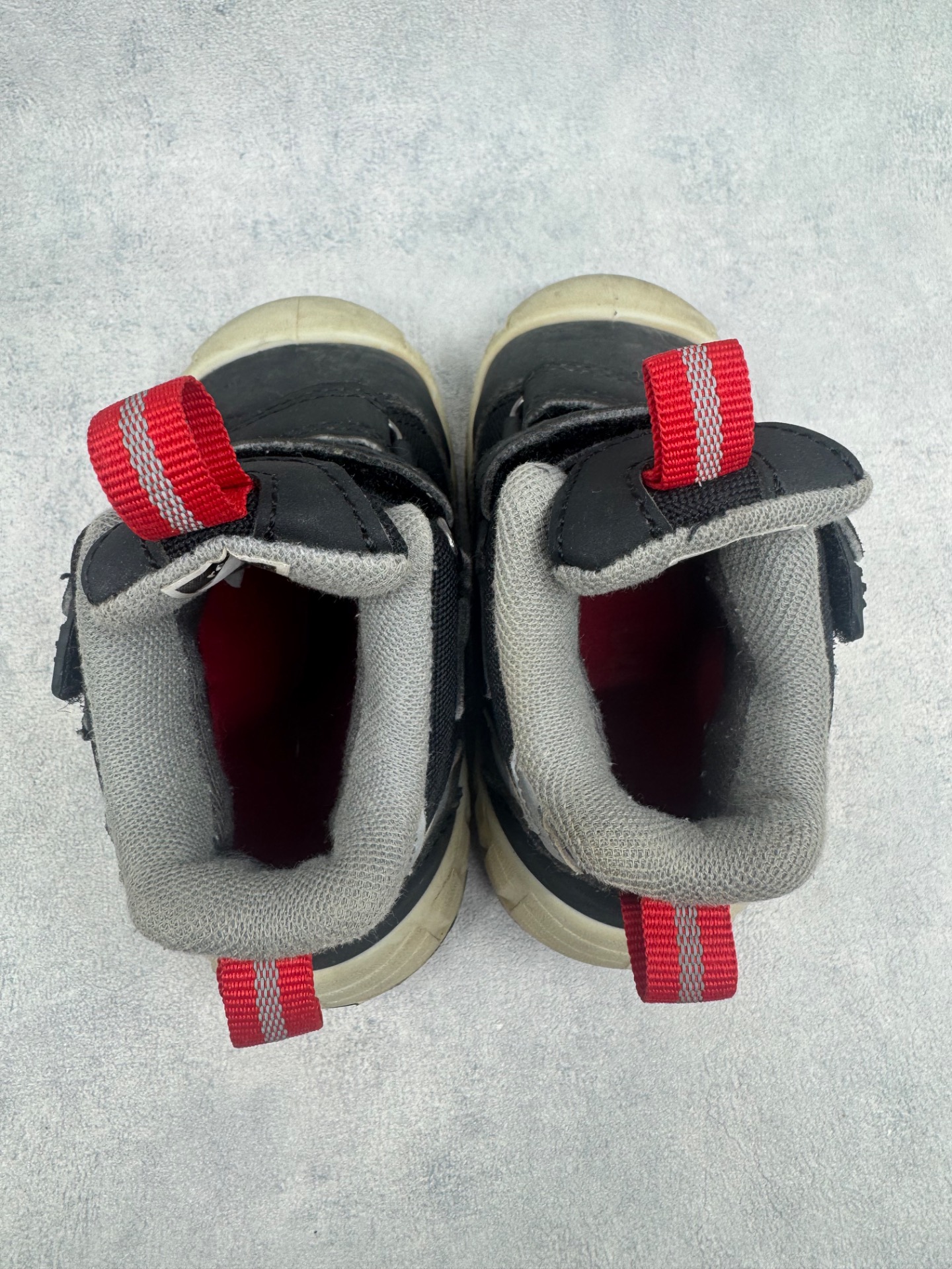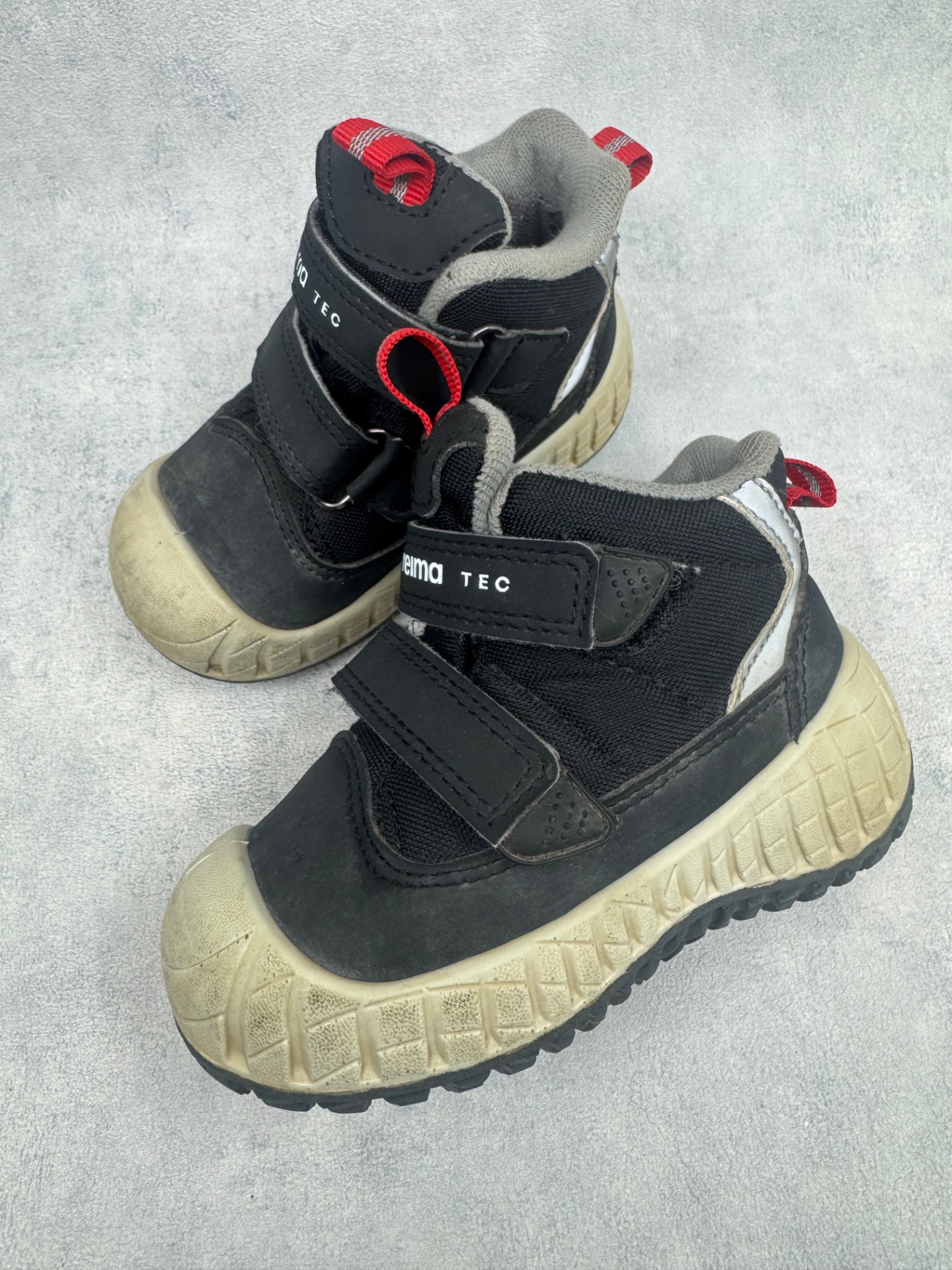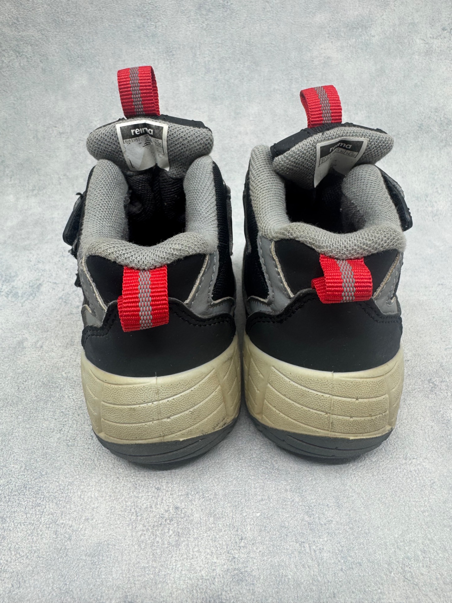 Erittäin hyväkuntoiset Reiman mustat välikausikengät. Valkoiset osissa tummentumaa, yleisilme kengissä erittäin siisti ja ovat selvästi vähän käytetyt. Tarrat pitävät erinomaisesti ja kengät on testattu juoksevan veden alla vedenpitäviksi.