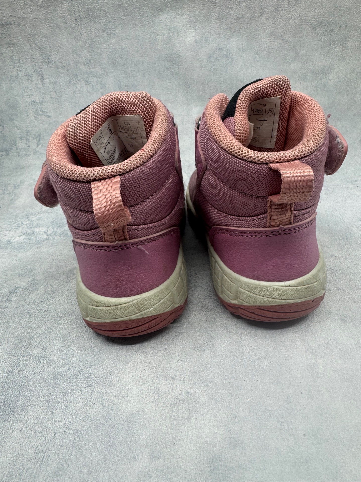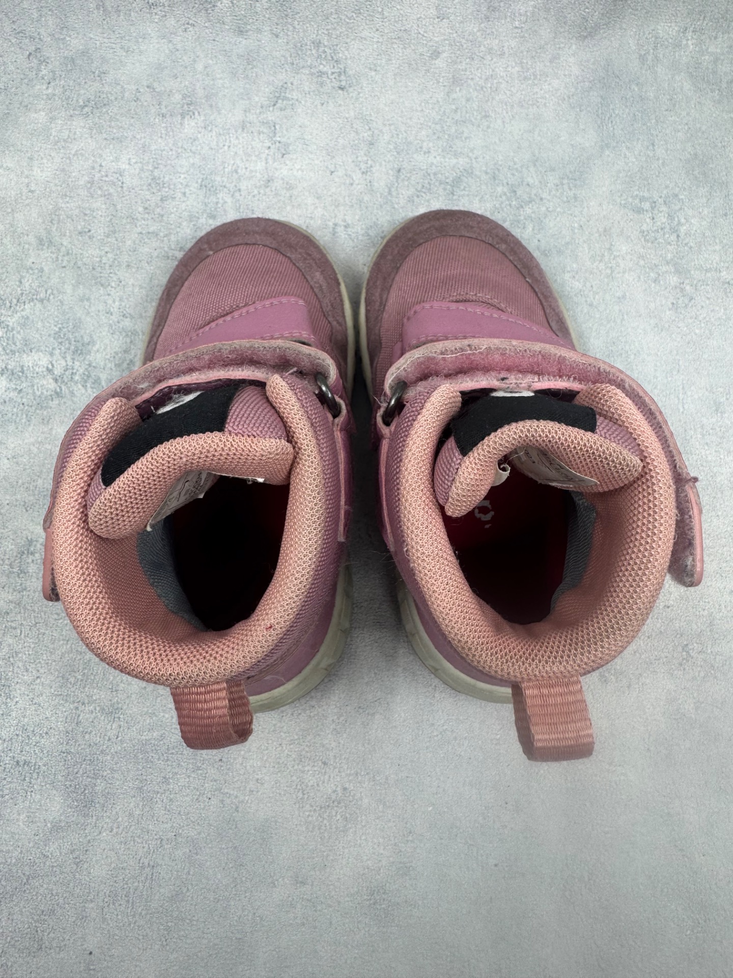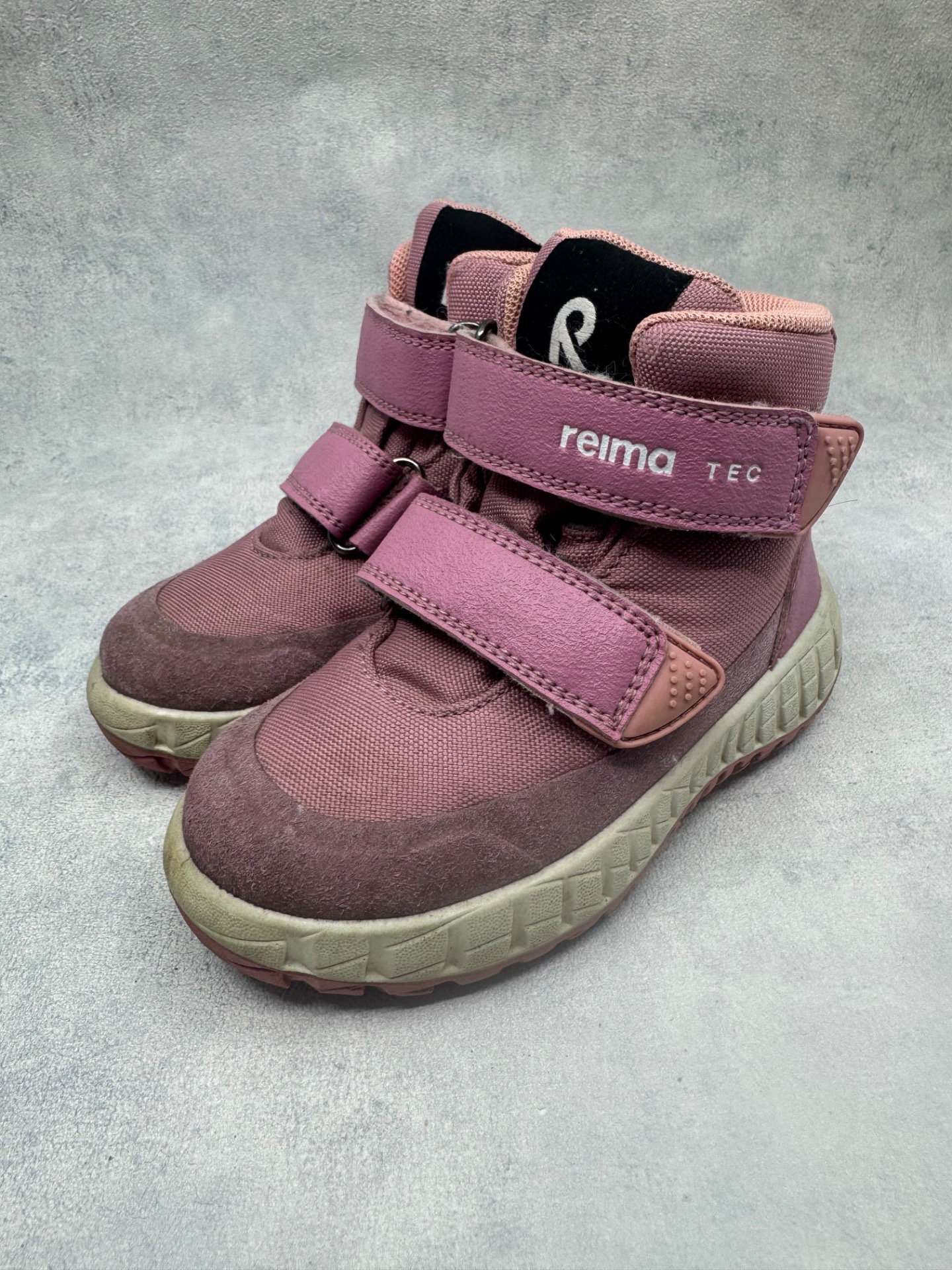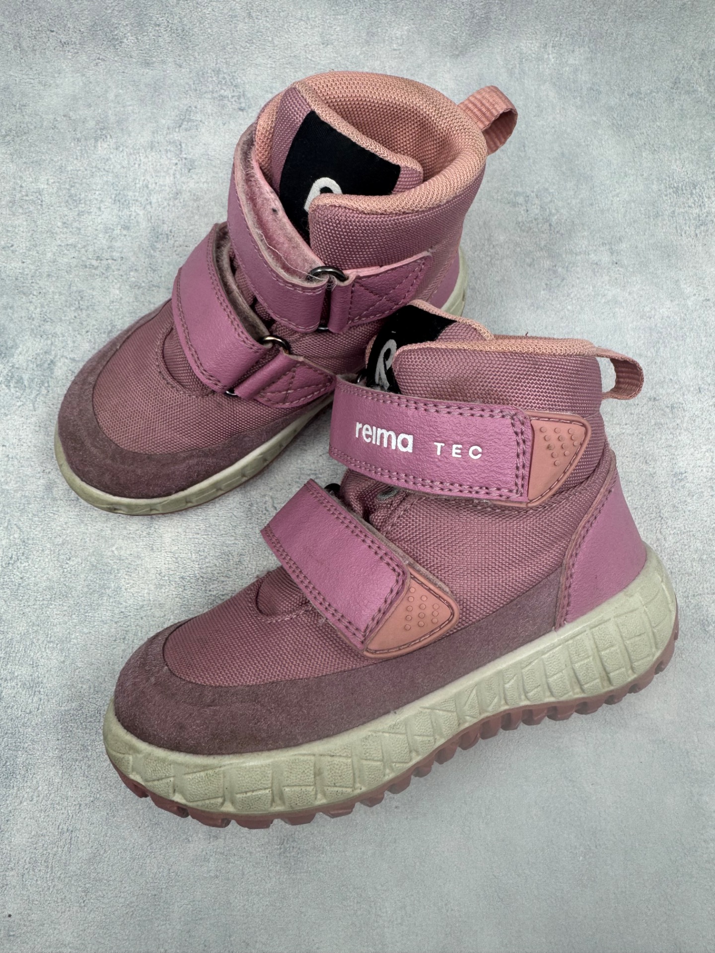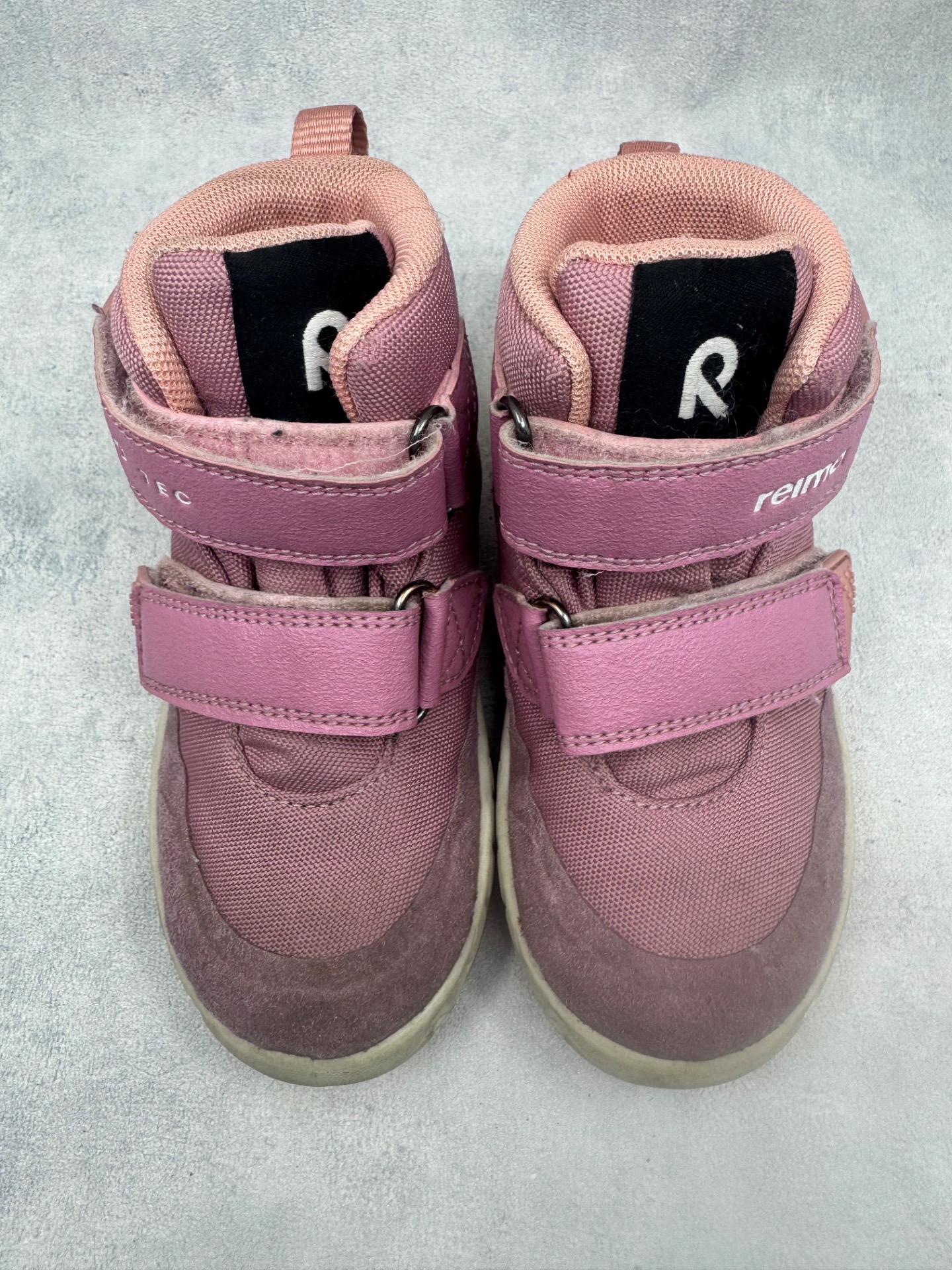 Erittäin hyväkuntoiset vaaleanpunaiset Reiman välikausikengät. Aran värin vuoksi pientä tummentumaa pinnalla, mutta yleisilmeeltään oikein siistit, tarrat pitää erinomaisesti ja kengät on testattu vedenpitäviksi juoksevan veden alla.