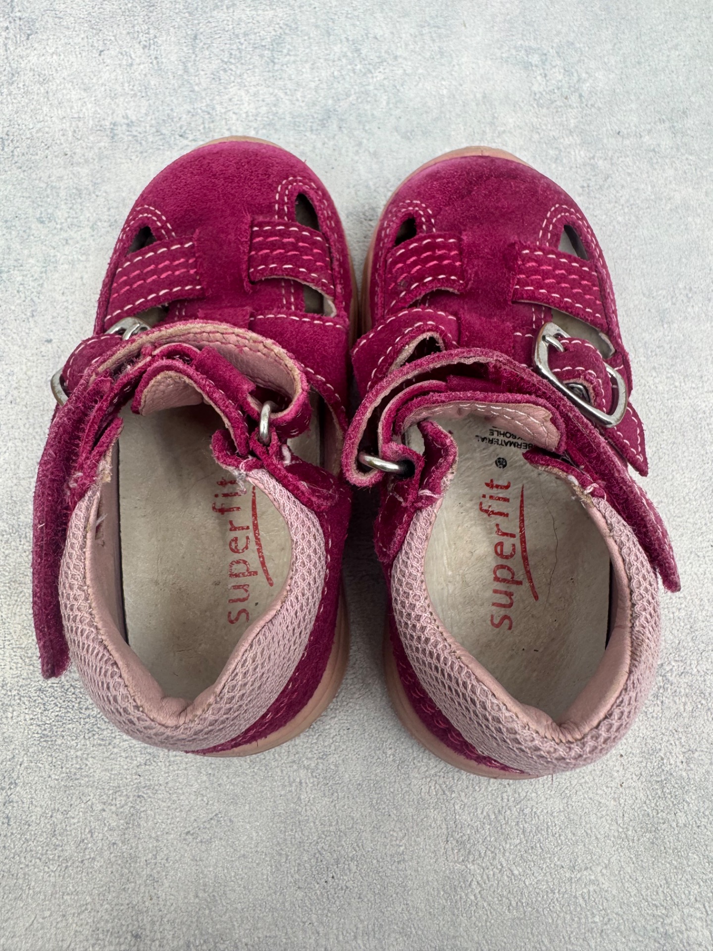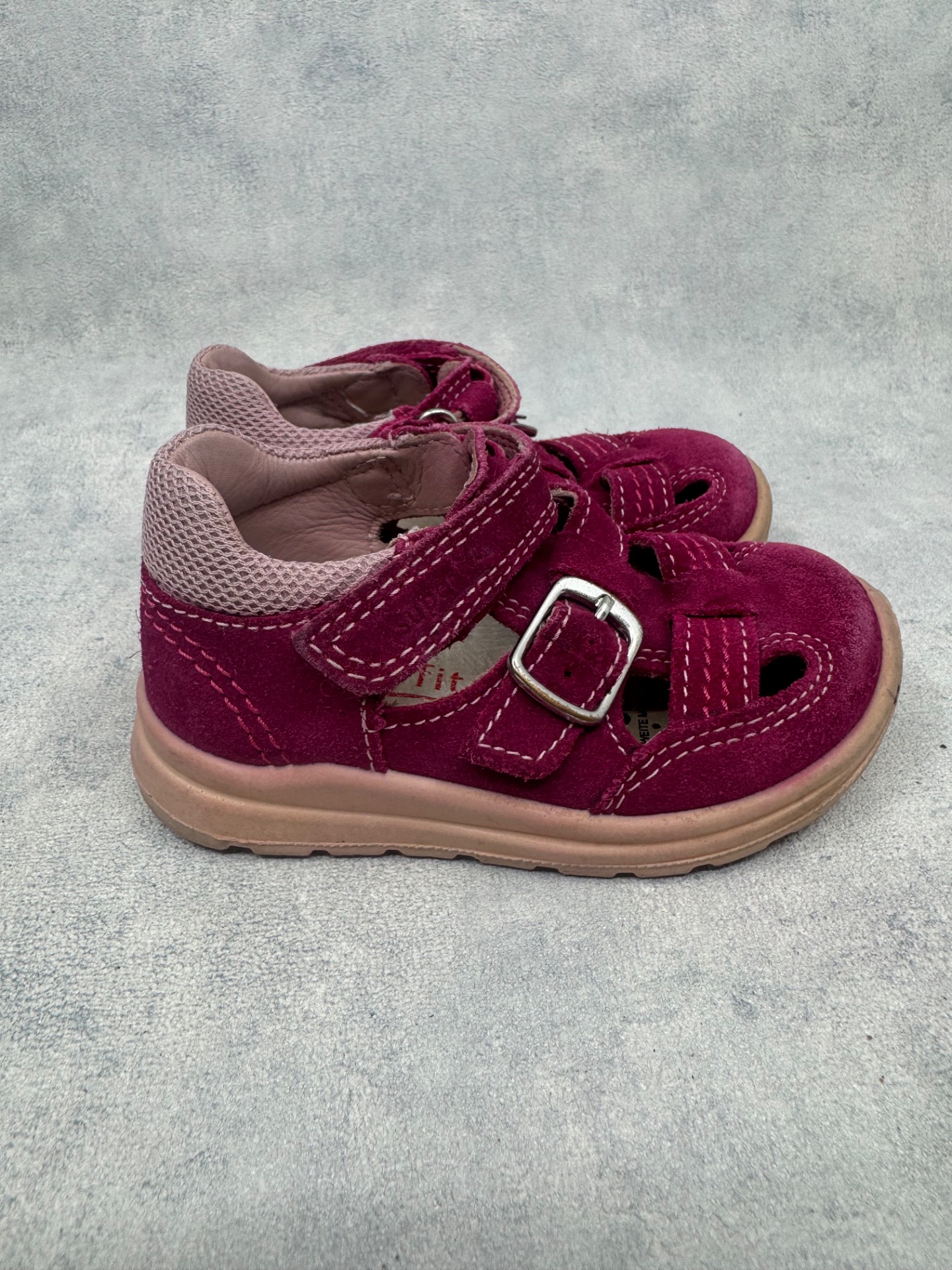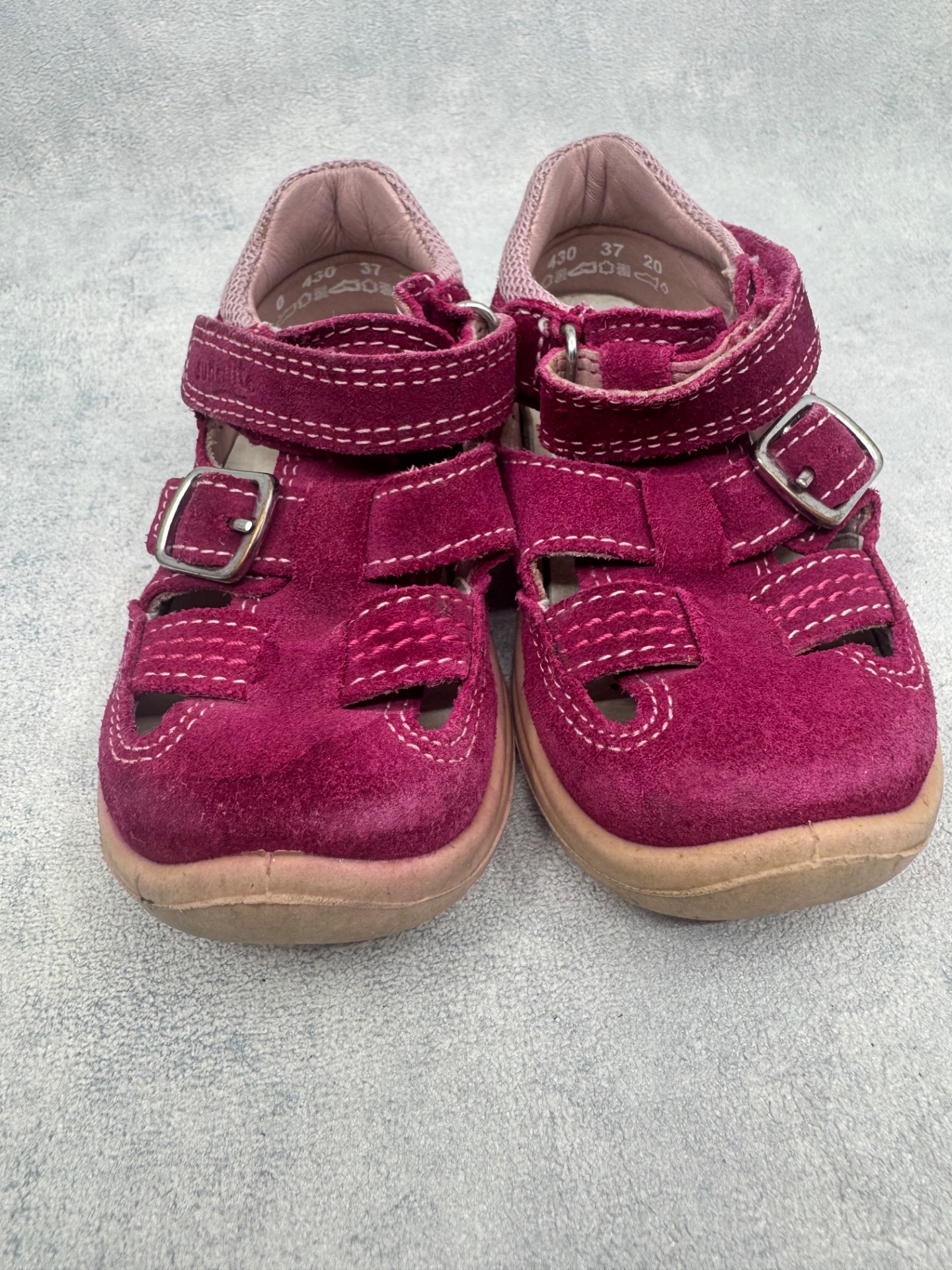 Hyväkuntoiset Superfitin sandaalit. Aavistus kulumaa kärjissä, mutta muutoin kengät ovat lähes uudenveroisessa kunnossa. Tarrat pitää erinomaisesti.