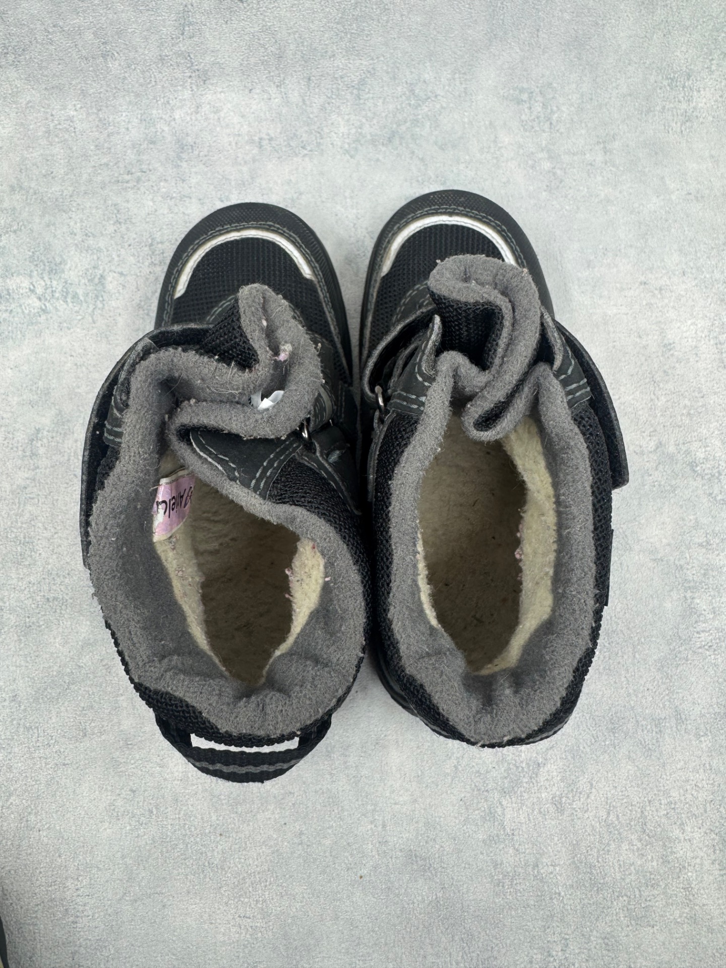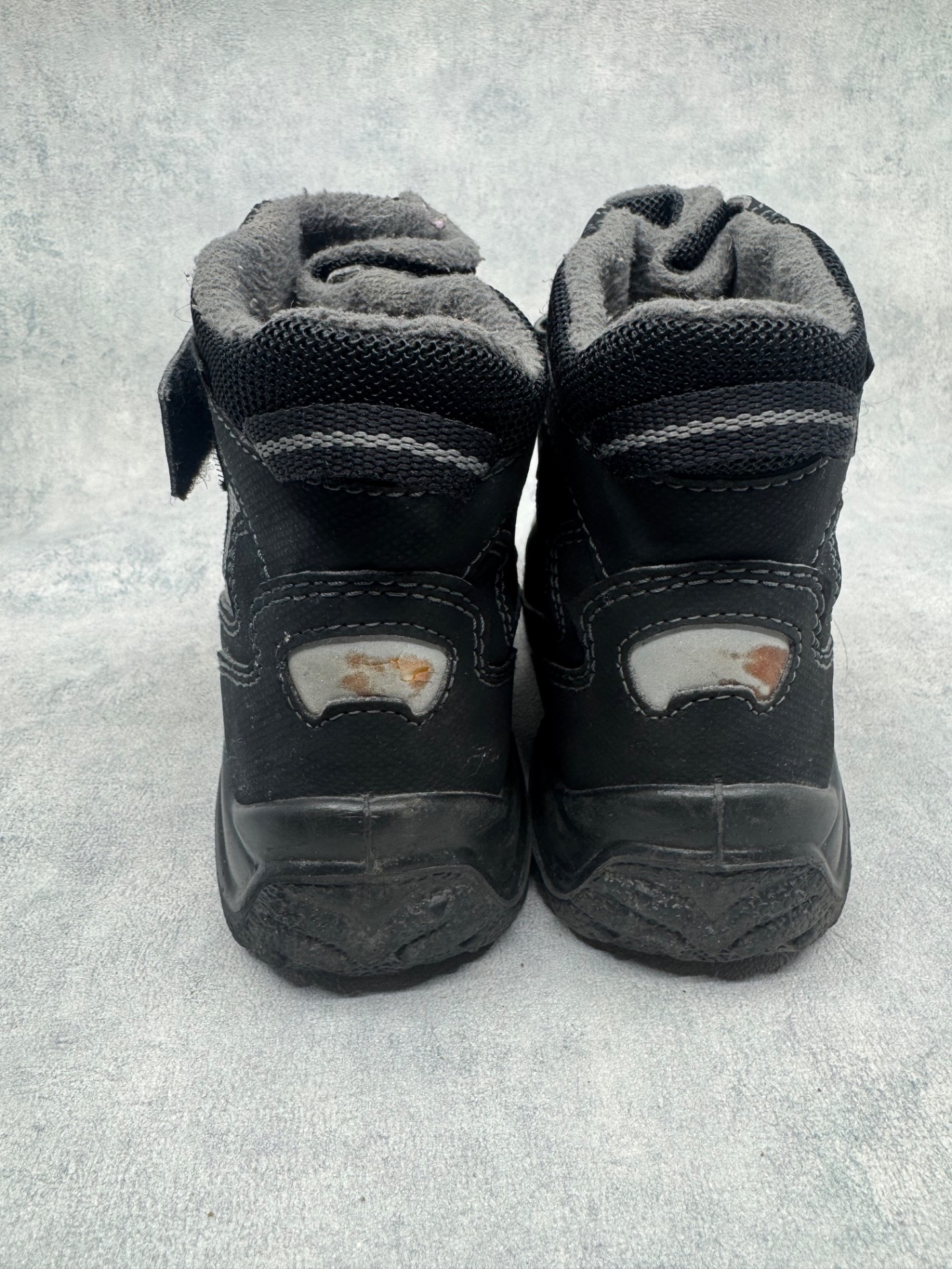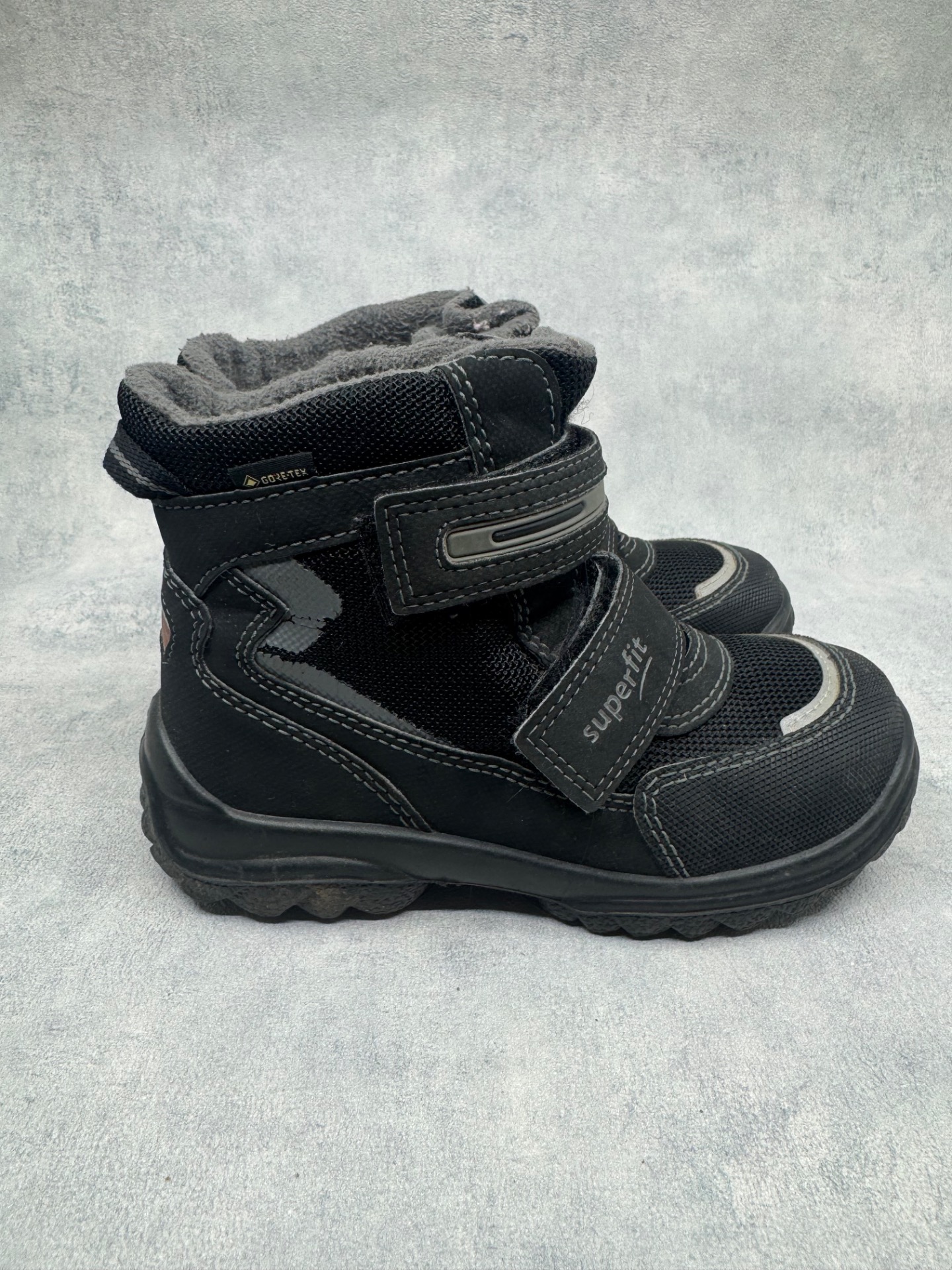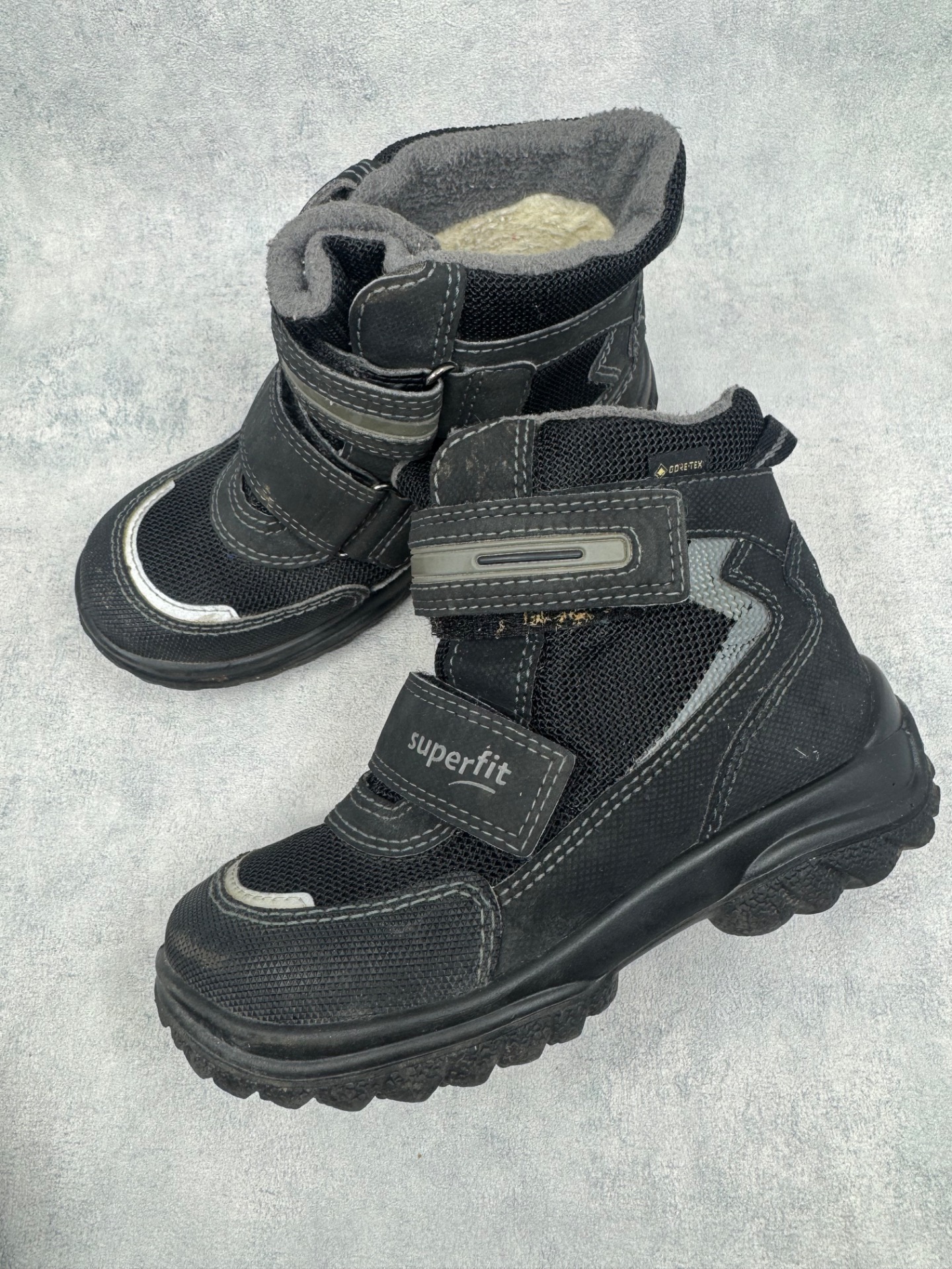 Hyväkuntoiset mustat Superfitin kengät. Sisällä ohut vuori, joten sopivat niin talven leudoille päiville kuin välikauteenkin. Tarrat pitävät erinomaisesti ja kengät on testattu juoksevan veden alla vedenpitäviksi. Takana heijastimissa kulumaa, mutta muutoin kengät ovat oikein siistit.