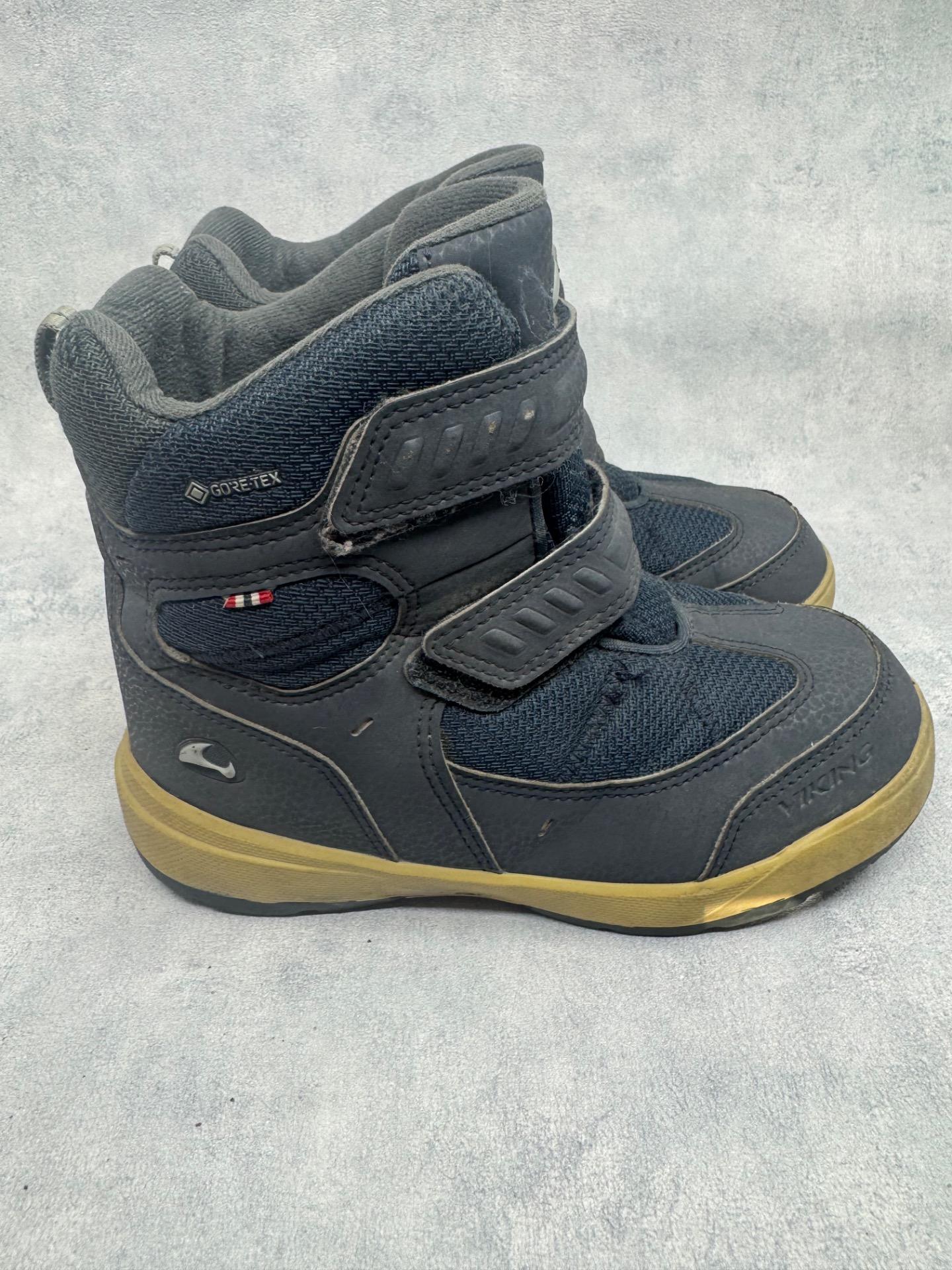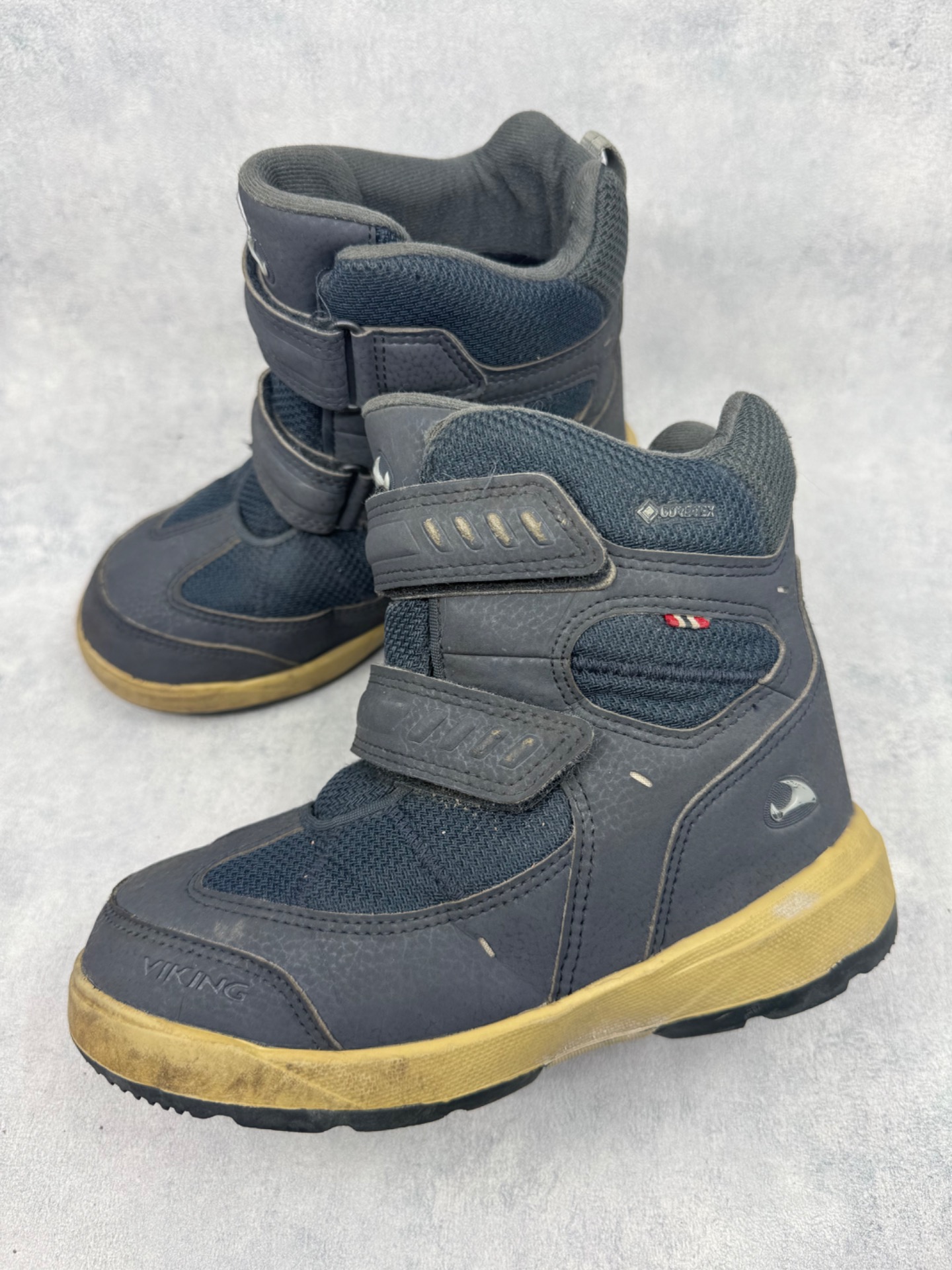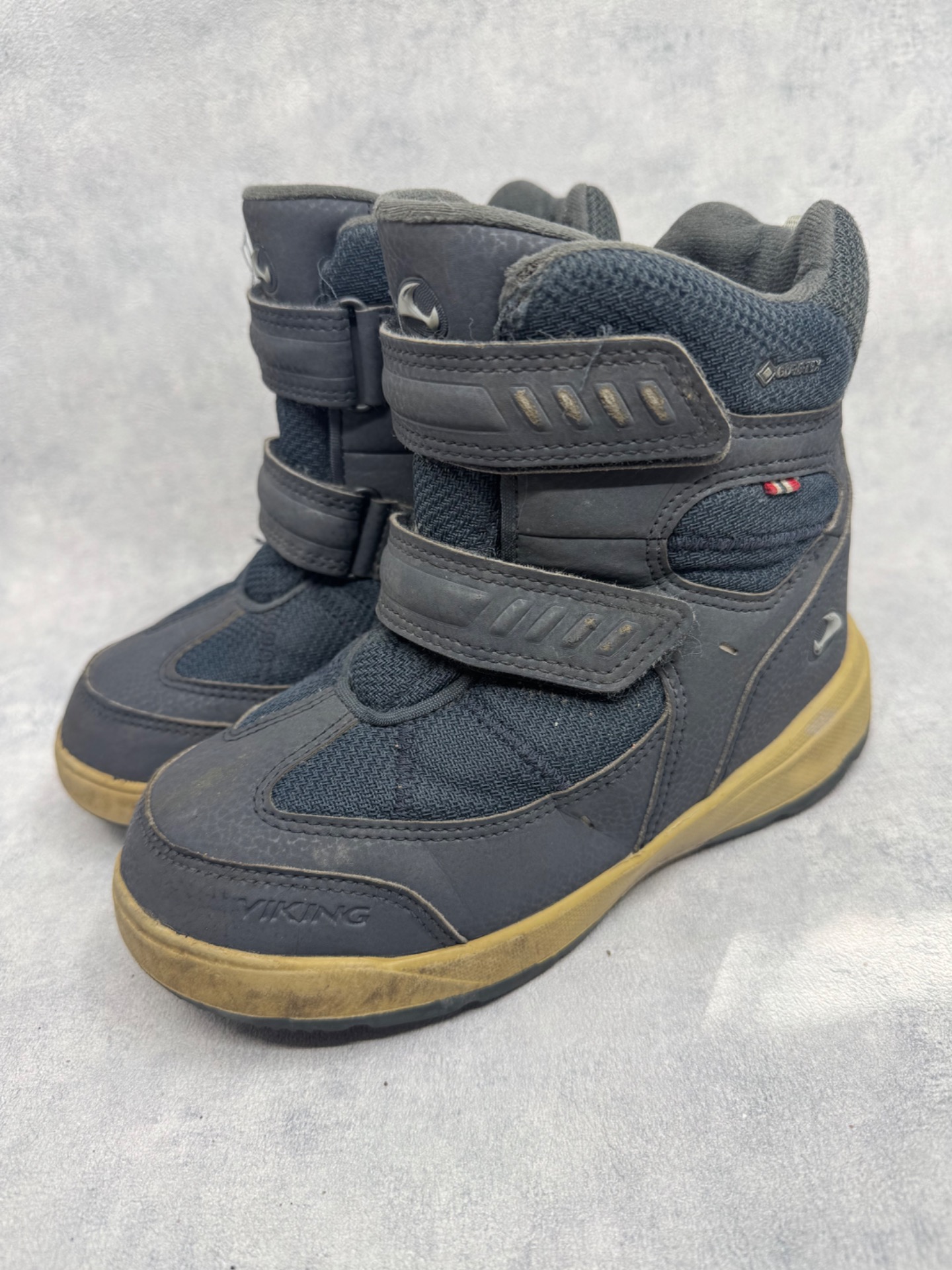 Hyväkuntoiset Vikingin talvikengät. Valkoiset osat tummentuneet, mutta muutoin kengät ovat oikein siistit. Sisällä lämmin vuori, hyvässä kunnossa. Tarrat pitävät erinomaisesti ja kengät on testattu vedenpitäviksi juoksevan veden alla.
