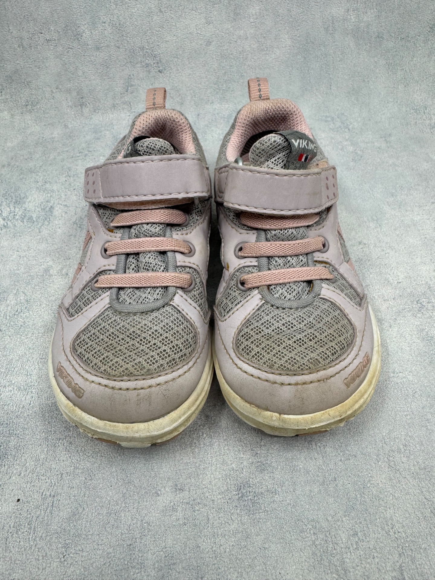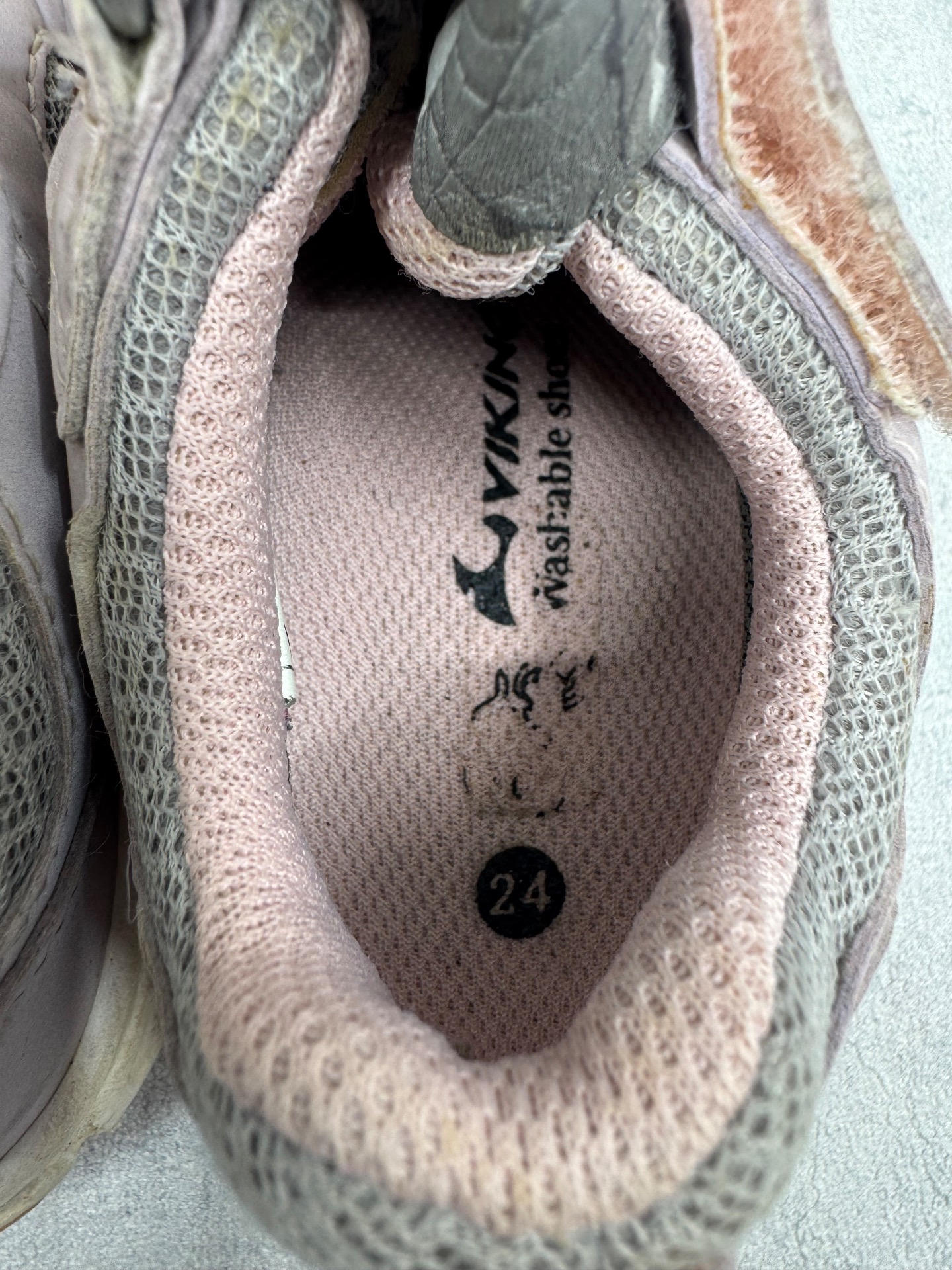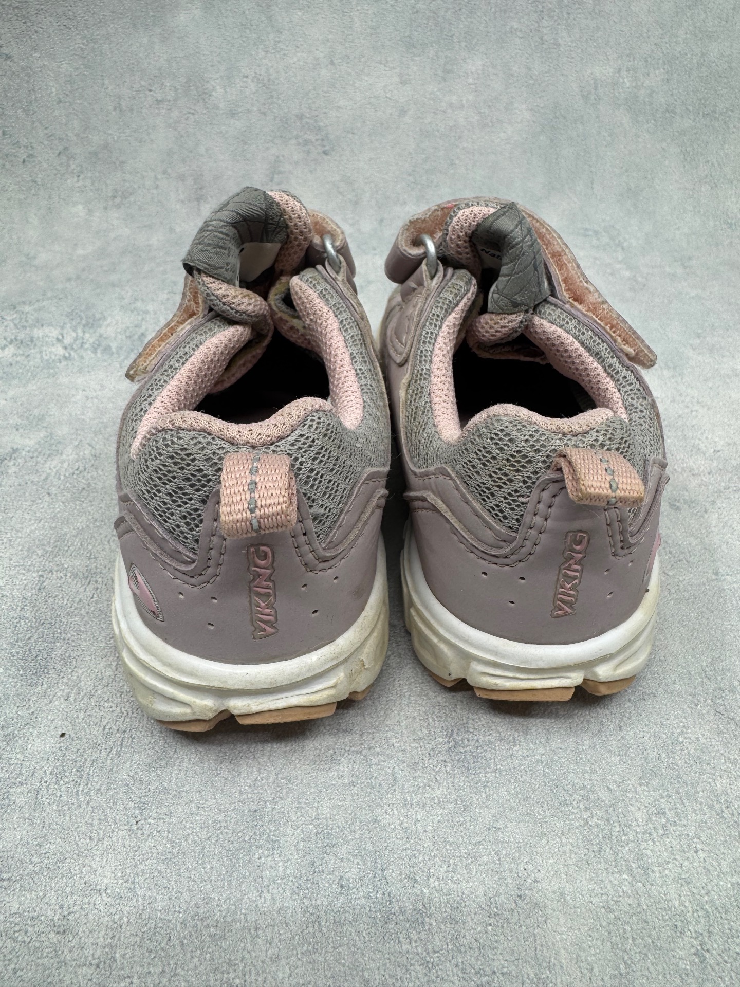 Erittäin hyväkuntoiset, selvästi vähän käytetyt Vikingin välikausikengät. Tarrat pitävät erinomaisesti ja kengät on testattu vedenpitäviksi juoksevan veden alla. Aavistus käyttölikaa/jälkeä kärjissä. Kengät voi pestä pesukoneessa 30 asteessa.