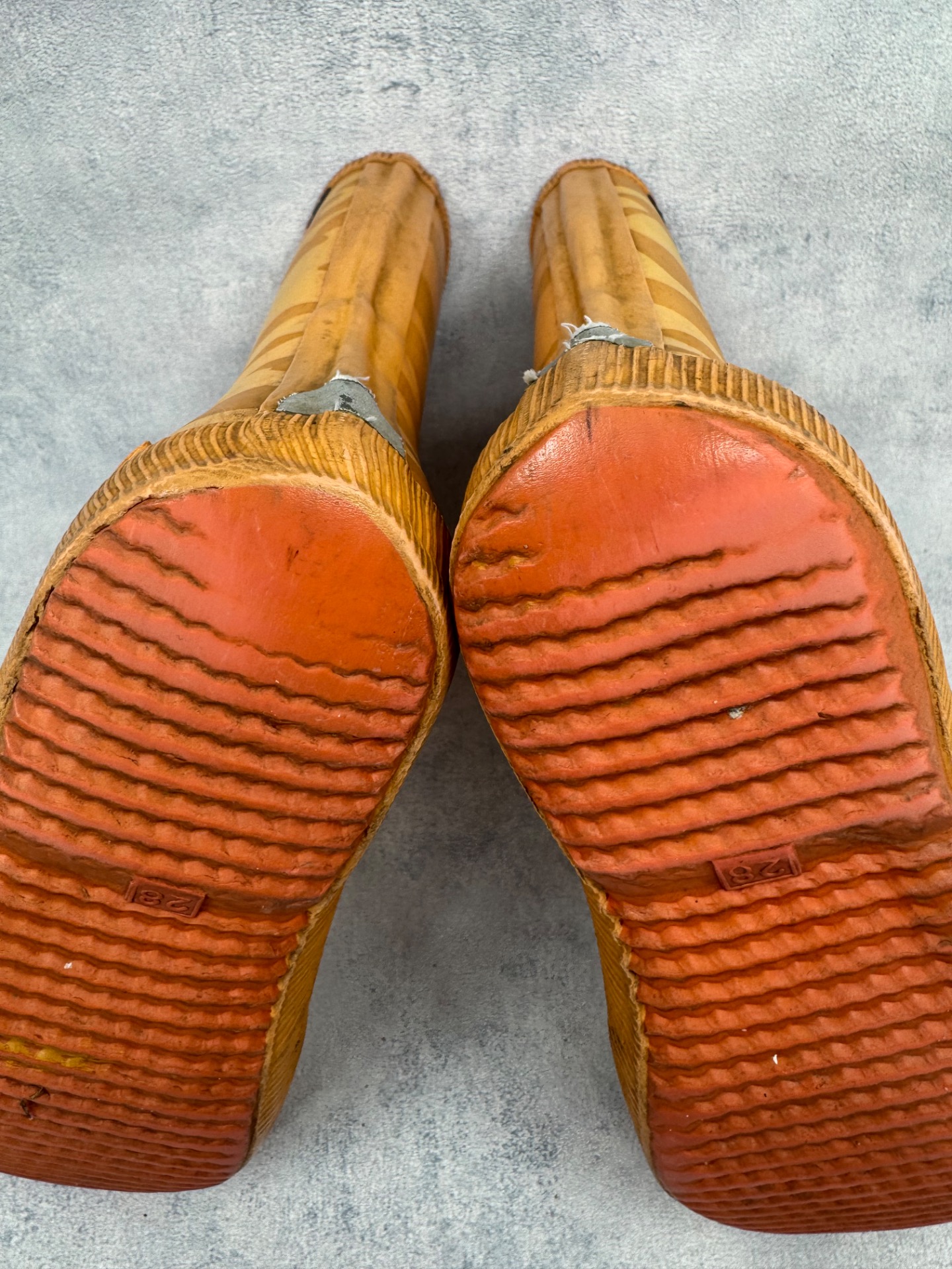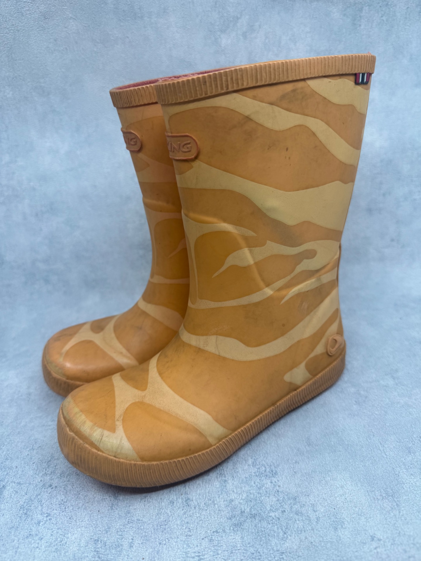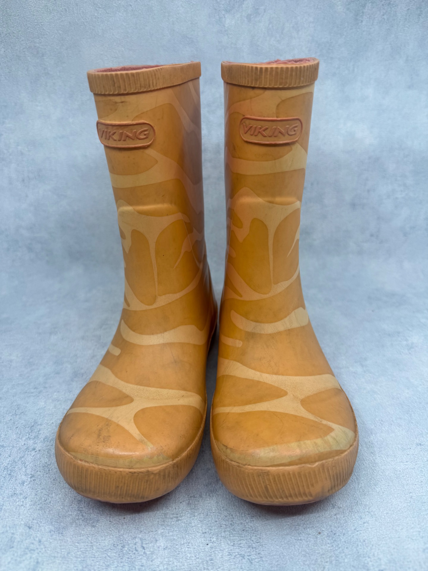 Hyväkuntoiset oranssit Vikingin kumisaappaat. Tummentumia ja käytönjälkeä pinnassa, yleisilme siisti. Notkeat ja mukavat saappaat joustavalla pohjalla. Testattu vedenpitäviksi.