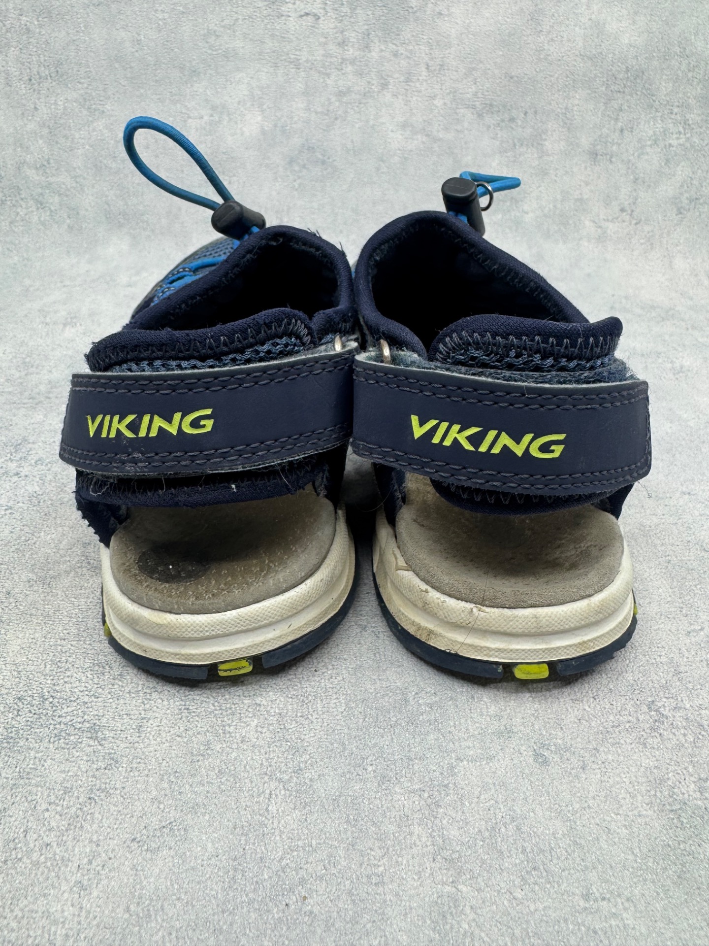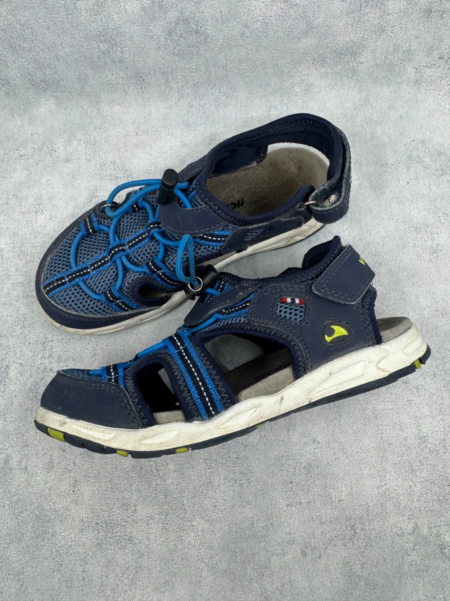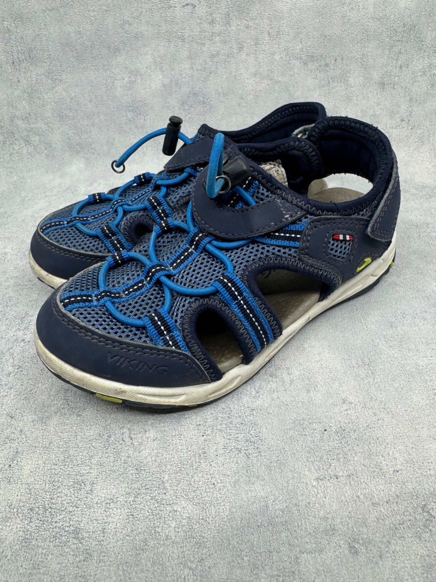 Erittäin hyväkuntoiset tummansiniset Vikingin sandaalit. Selvästi vähän käytetyt kengät, ei kulumaa. Tarrat pitää erinomaisesti.